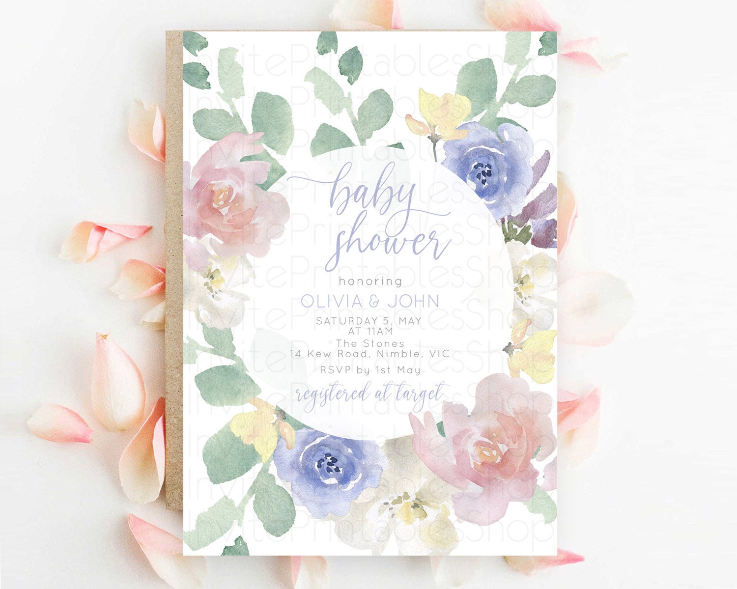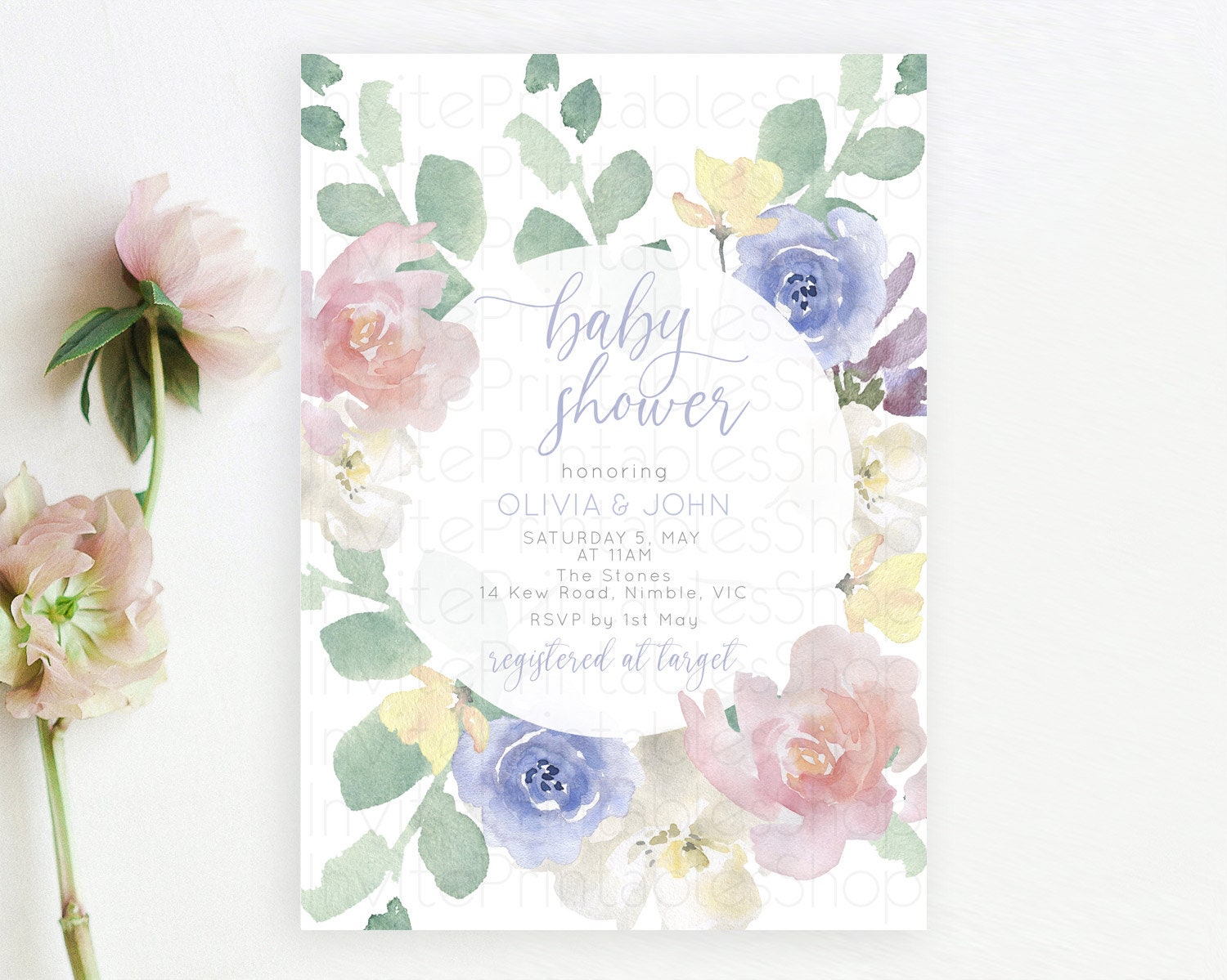 Enchanted Garden Baby Shower Invitation, Wildflower, Blooms, Secret Garden Pastel Pink Blue Flowers, Elegant Floral Botanical Theme D10860