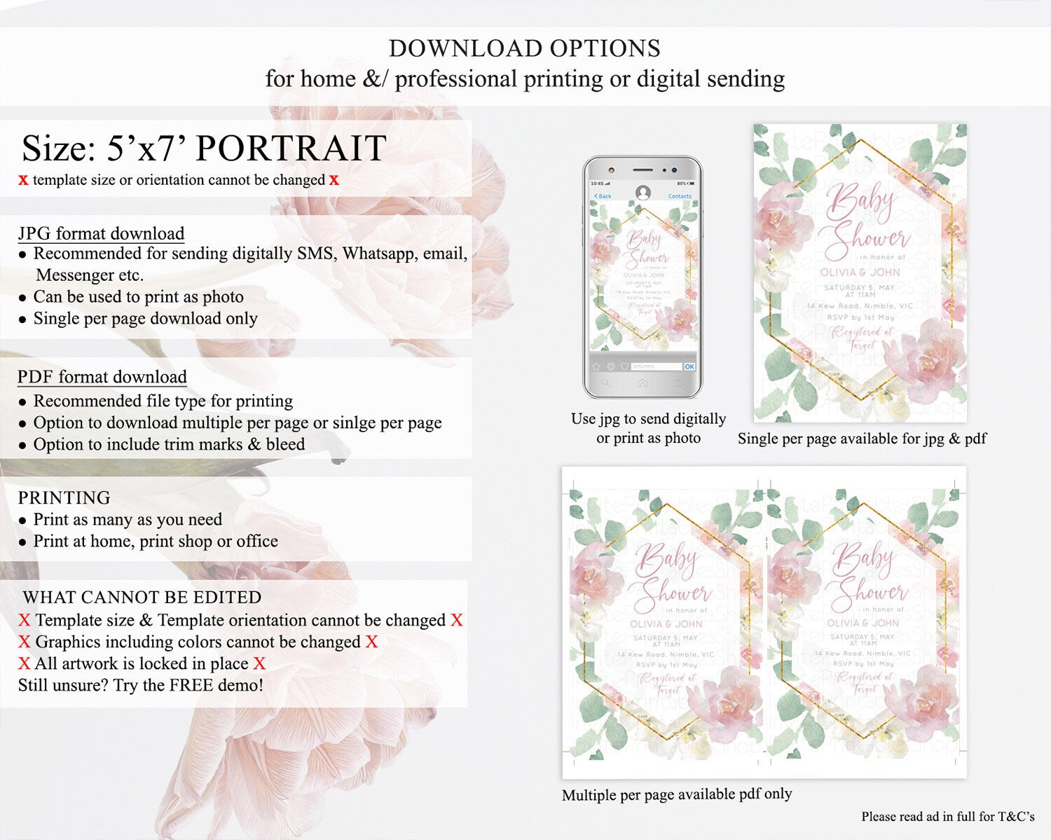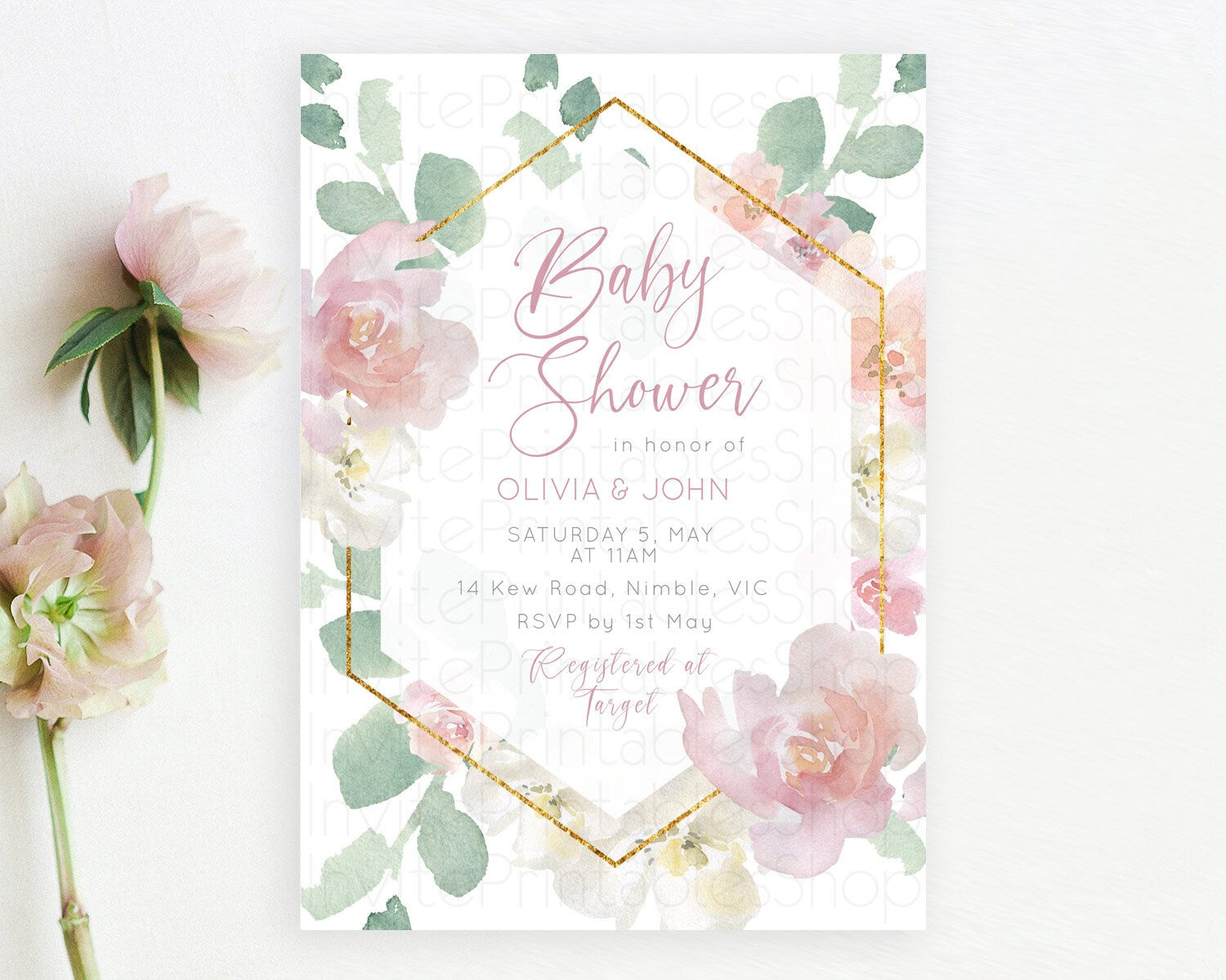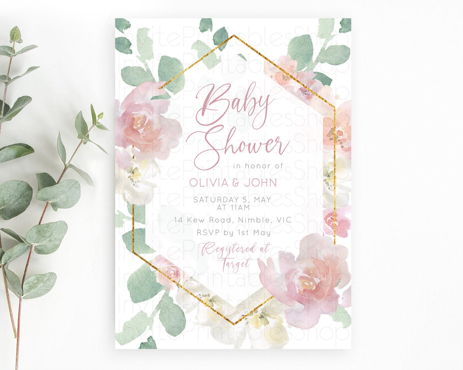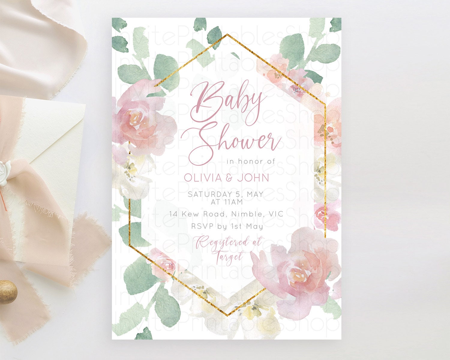 Enchanted Garden Baby Shower Invitation, Wildflower, Blooms with Pastel Pink Flowers, Elegant Gold Accents - Floral Botanical Theme D11032