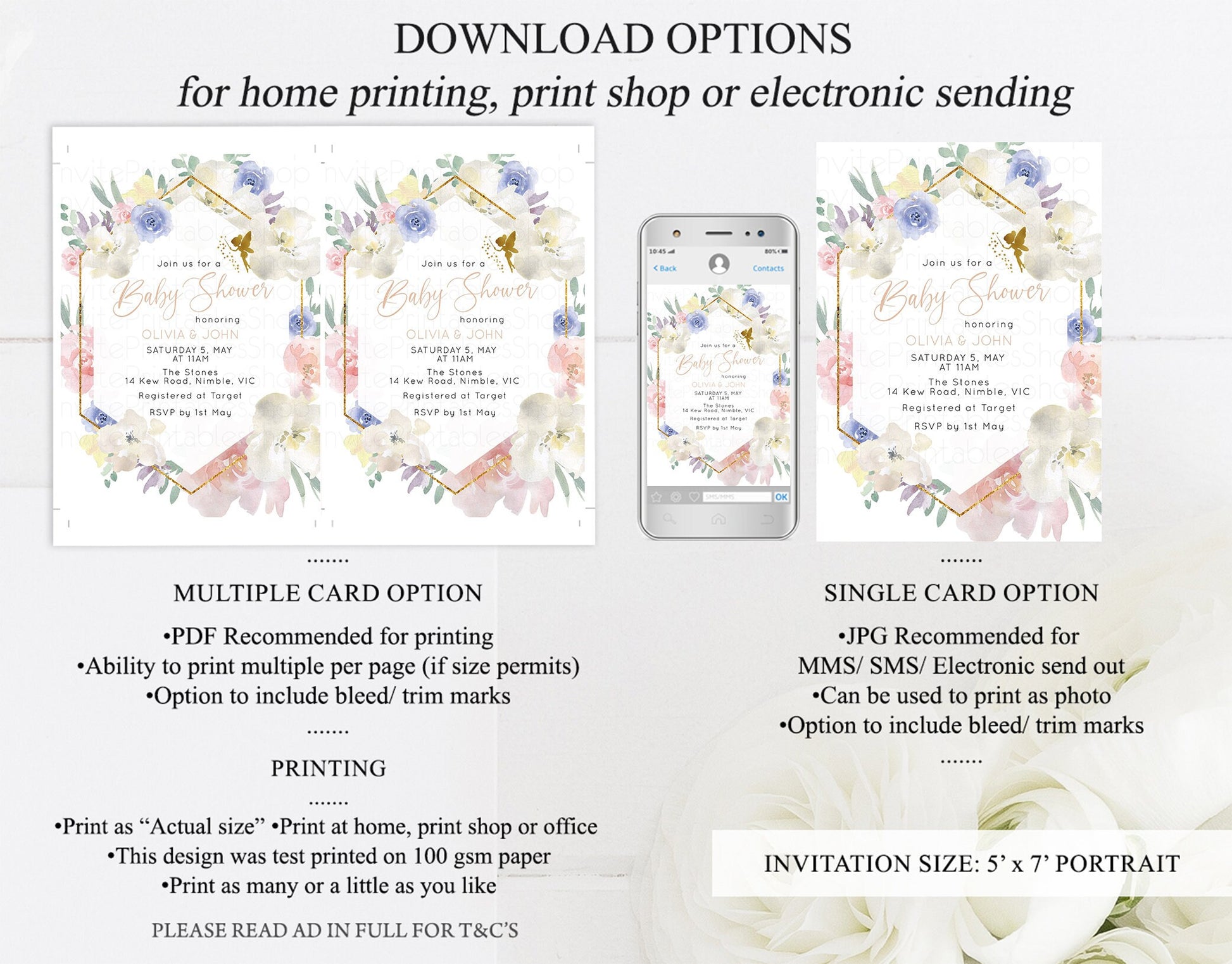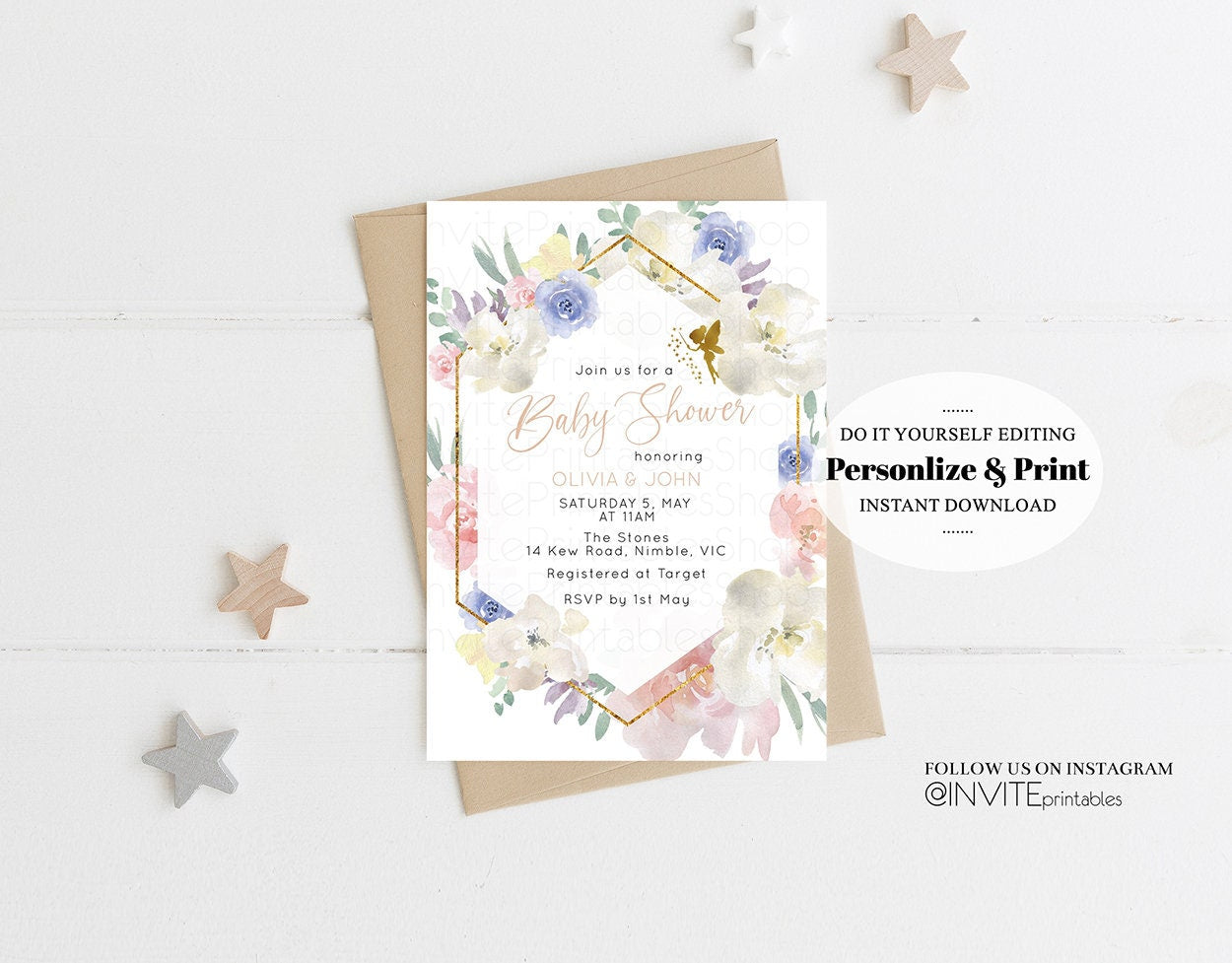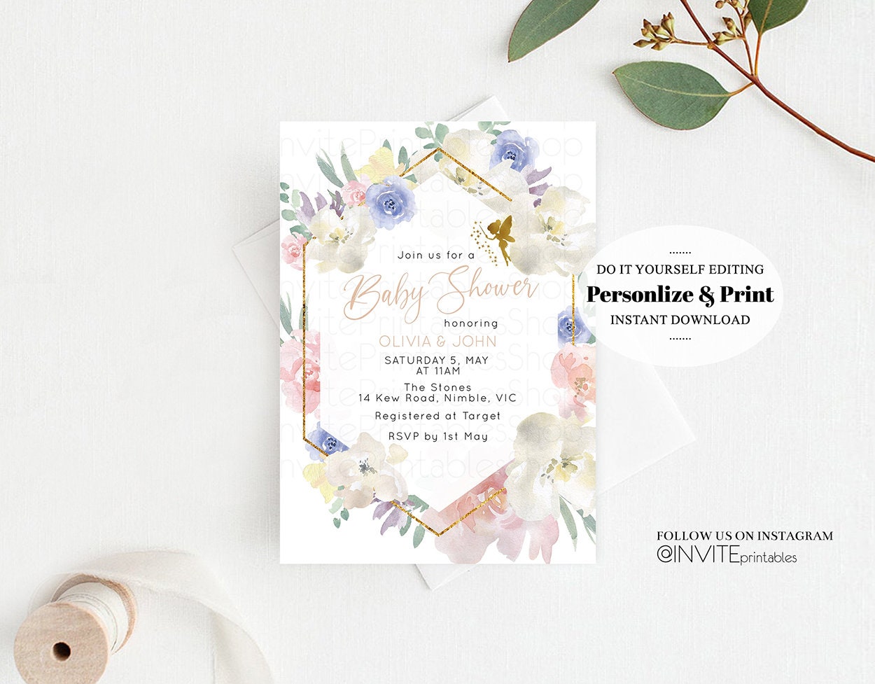 Fairy Baby Shower Invitation Enchanted Baby Shower Tinker Bell Gold Glitter Sprinkle Twinkle Stars Fairytale Floral Pink Blue Yellow Flowers