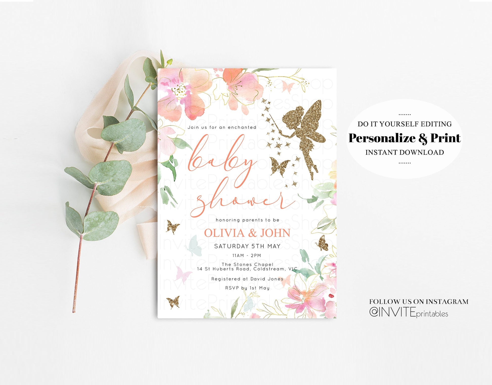 Fairy Baby Shower Invitation Enchanted Fairy Garden Baby Shower Invite Pastel Watercolor Invite Pixie Pink Flowers White Gold Glitter 91