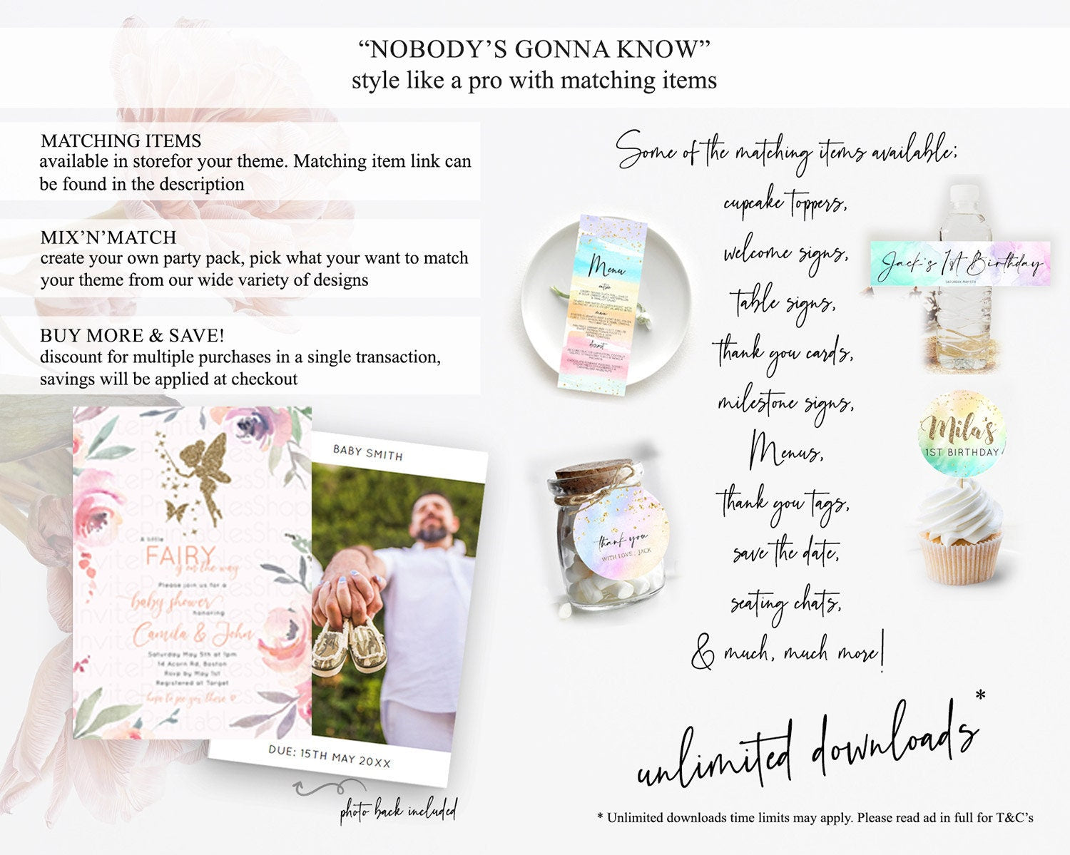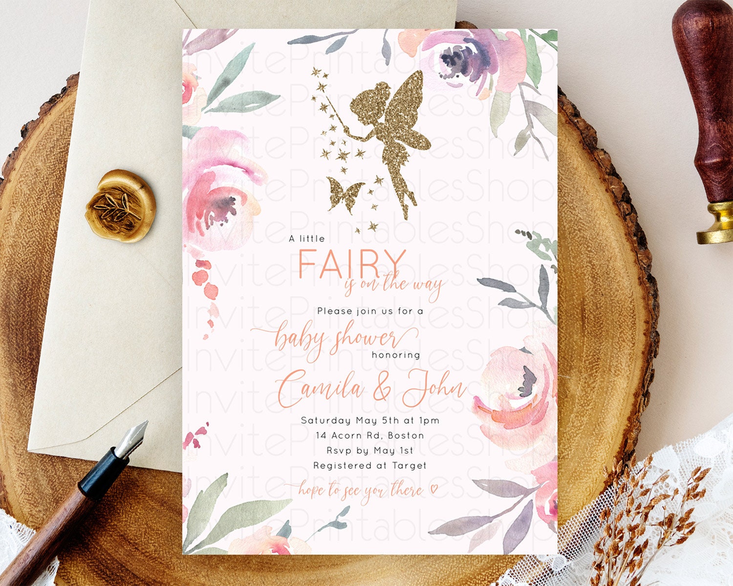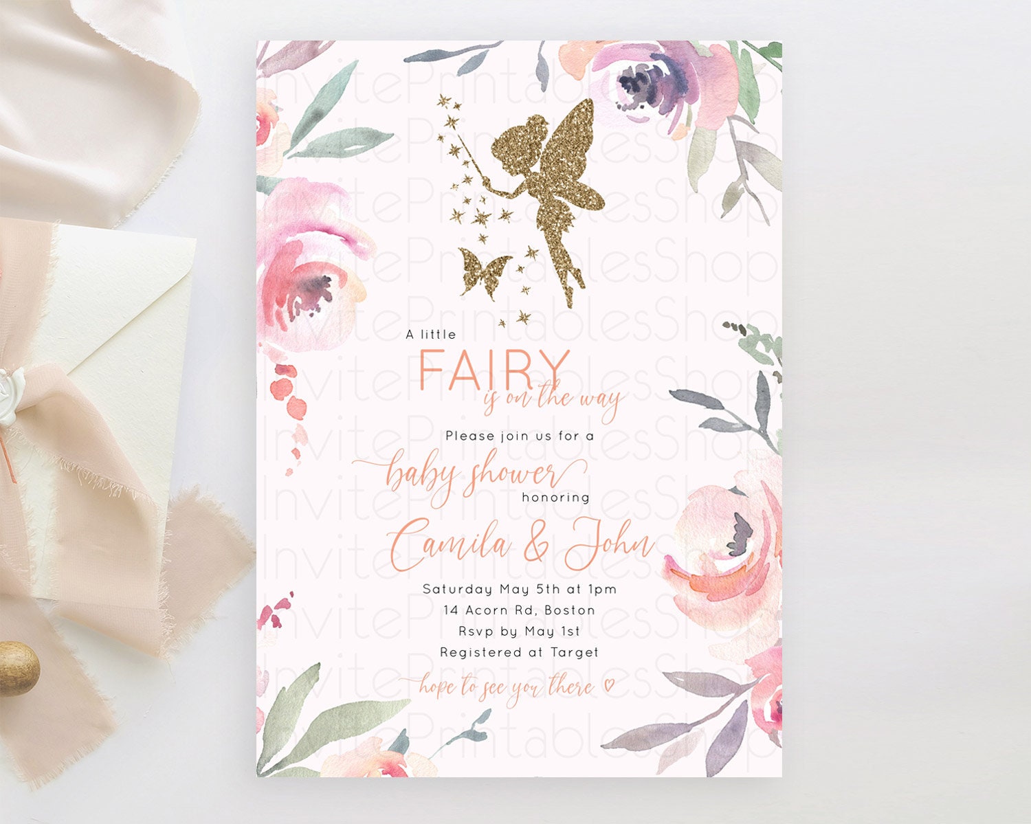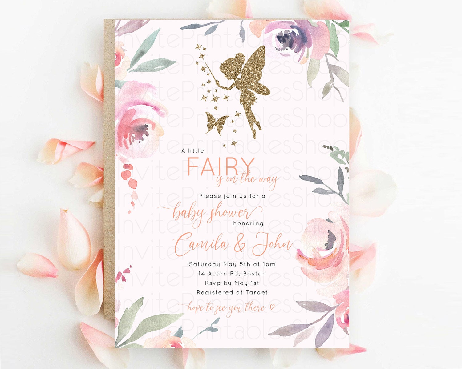 Fairy Baby Shower Invitation: Enchanted Fairy Garden, Secret Garden with Soft Purple Pink Flowers, Glitter Accents, Magical Butterfly D10197