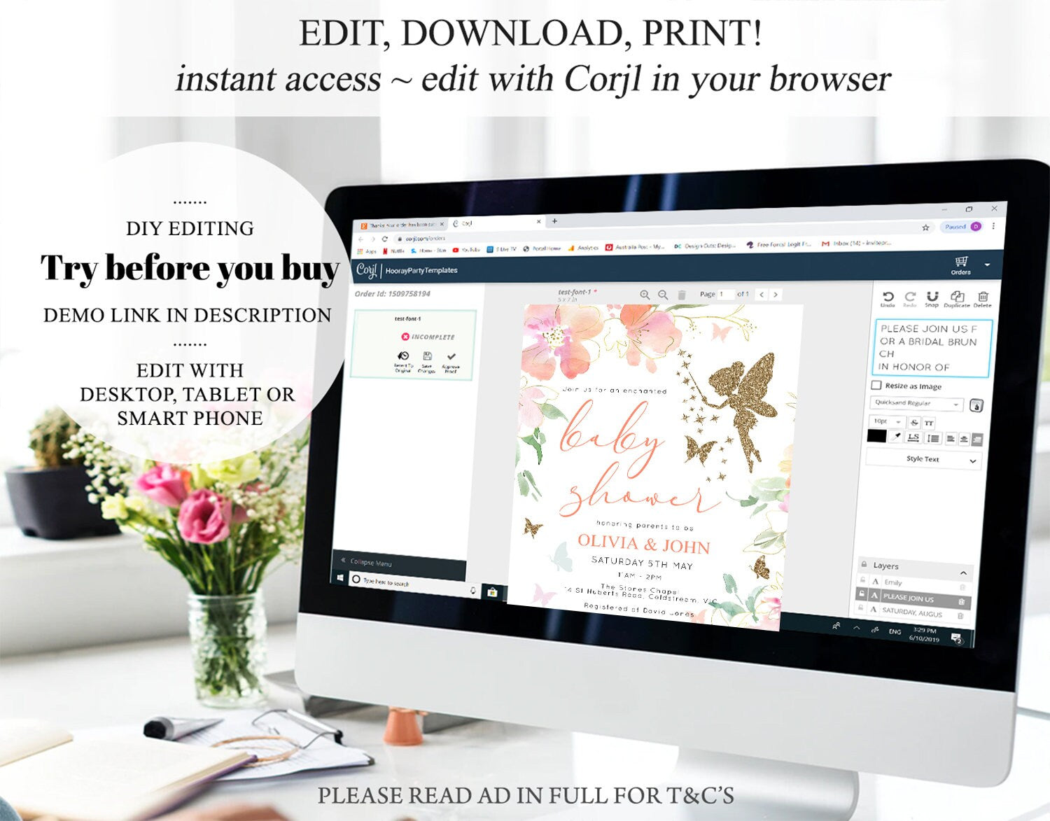 • After purchase, Corjl emails your editing link. Allow up to 15 minutes for delivery.