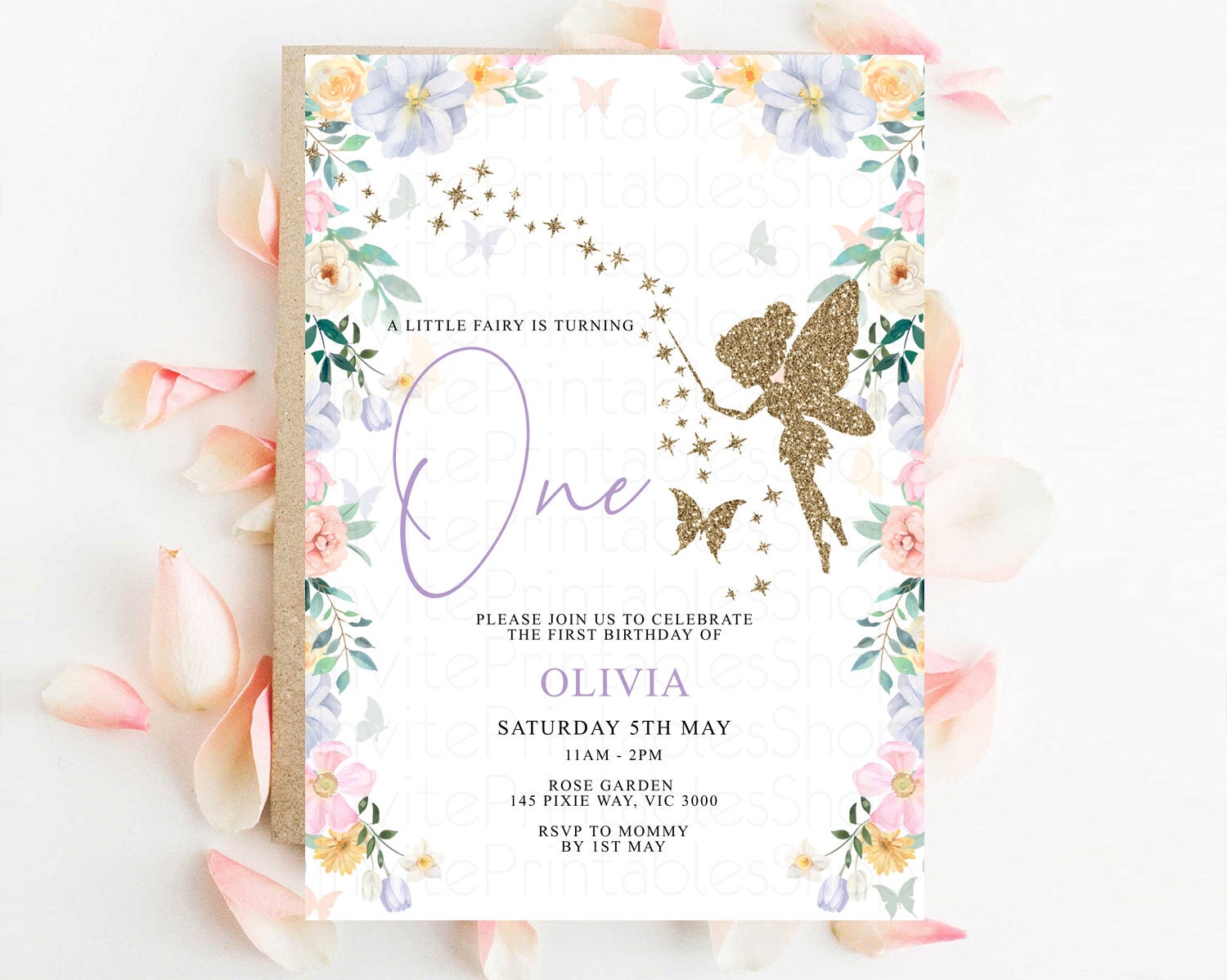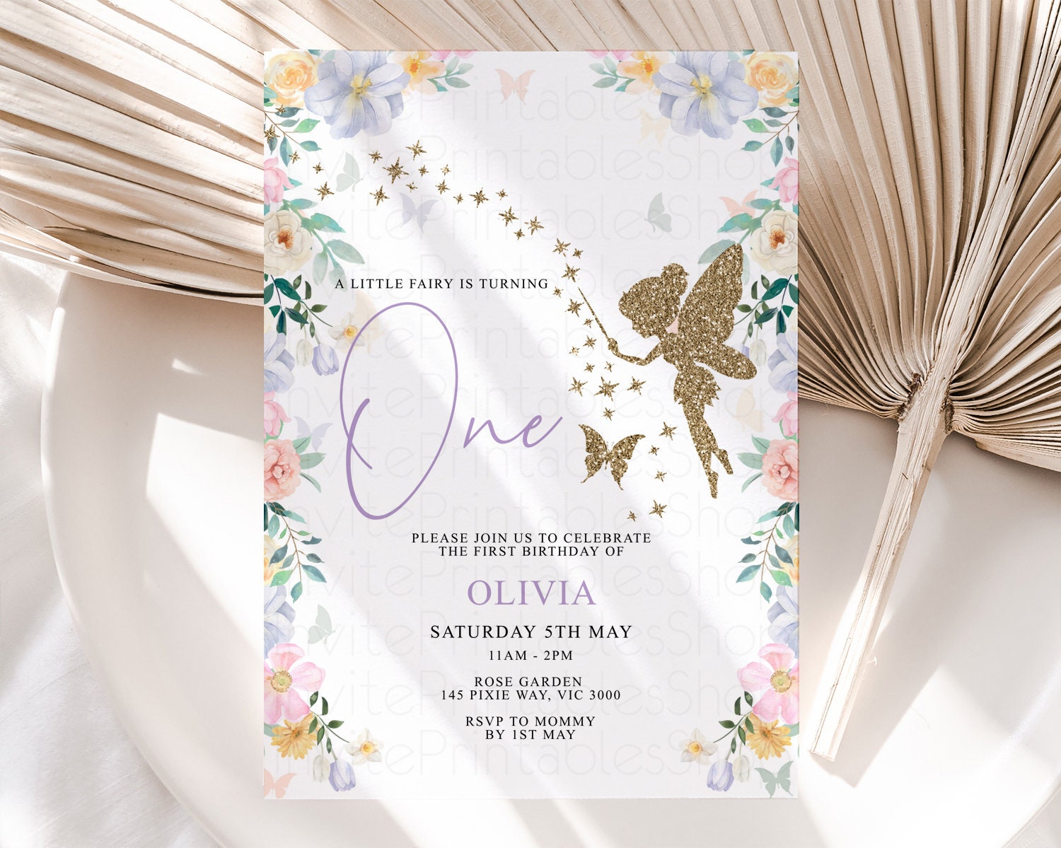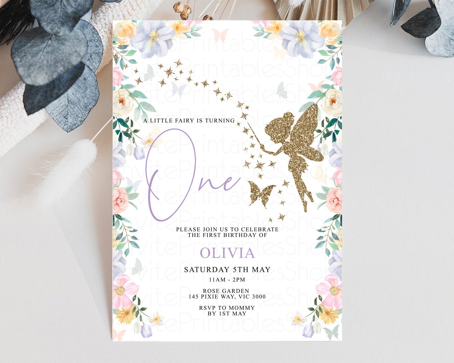 Fairy Birthday Invitation Glitter Fairy Invite Enchanted Garden Tinkerbell Invite Pastel Floral Invite Butterfly Garden Invite 1st 2nd F513