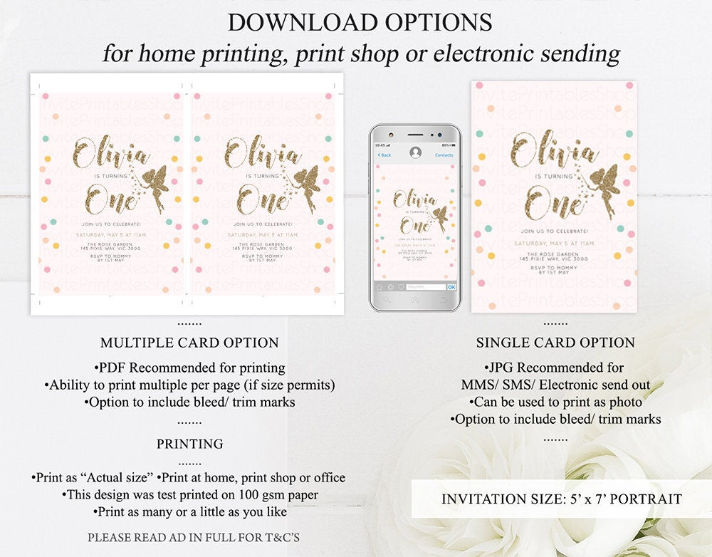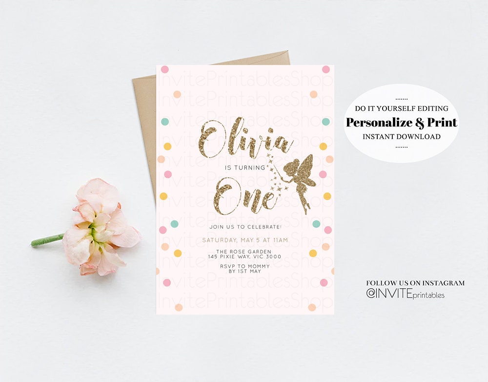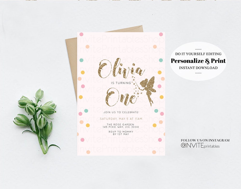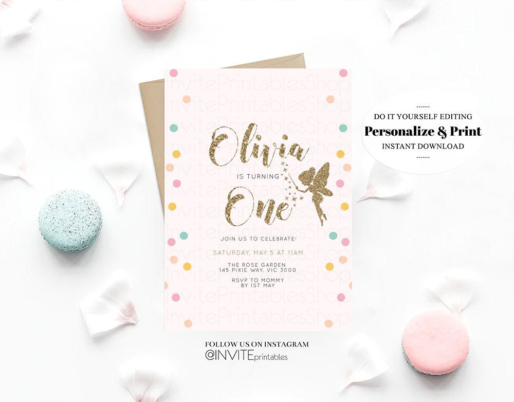 Fairy Birthday Invitation Tinkerbell Invite Colorful Pastel Confetti Sprinkles Pixie Magic Gold Glitter 1st Birthday Printable Template