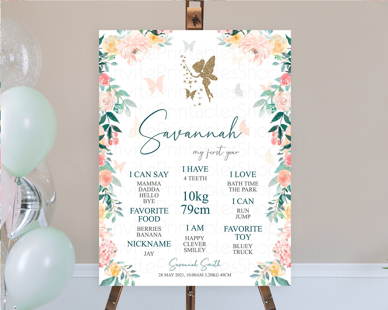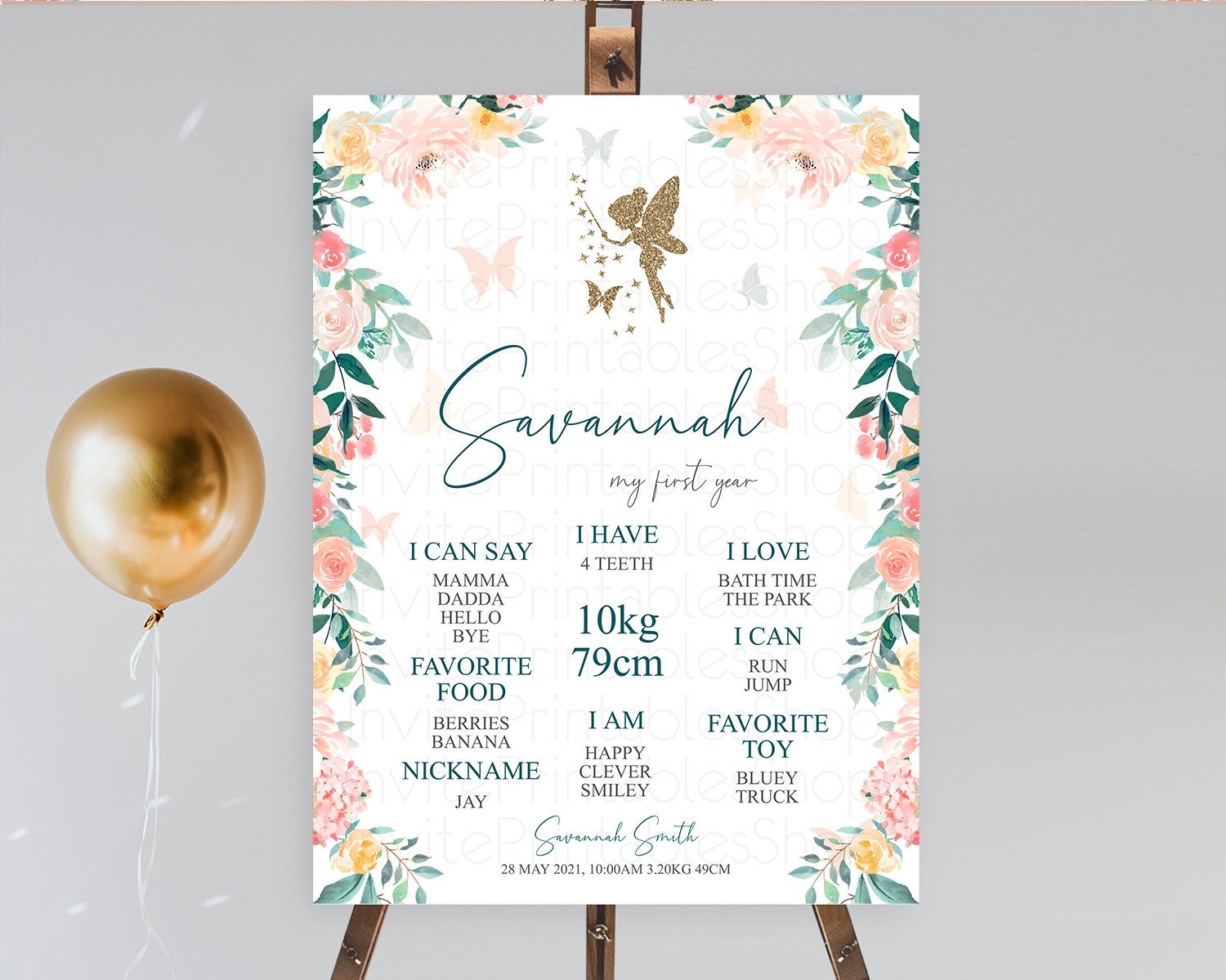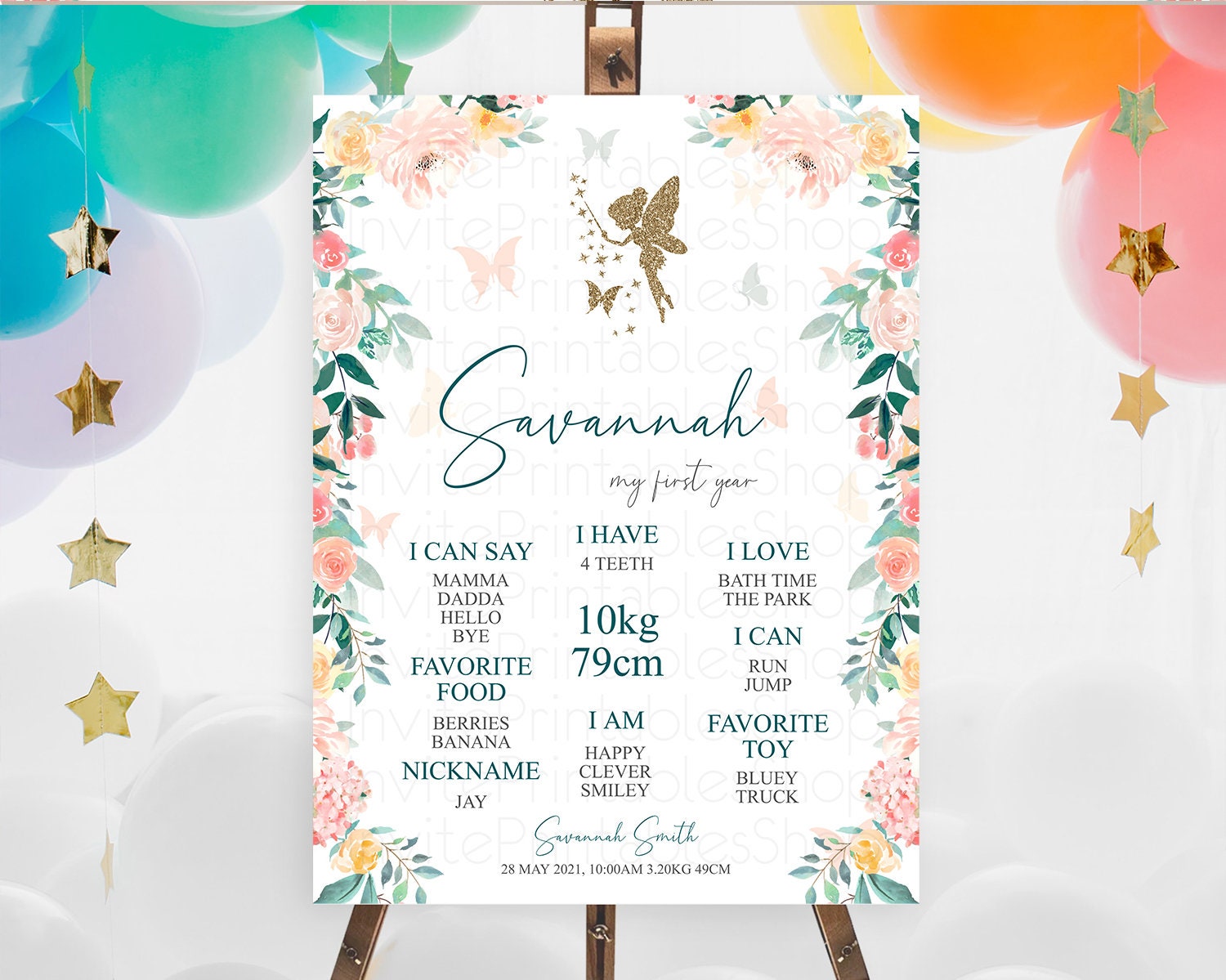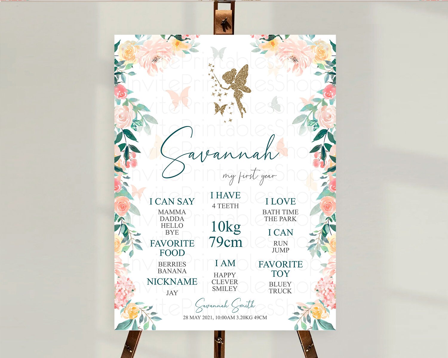 Fairy First Birthday Milestone Poster Fairy Secret Garden Milestone Board Enchanted Garden Pastel Floral Butterfly 1st Birthday Sign D10239