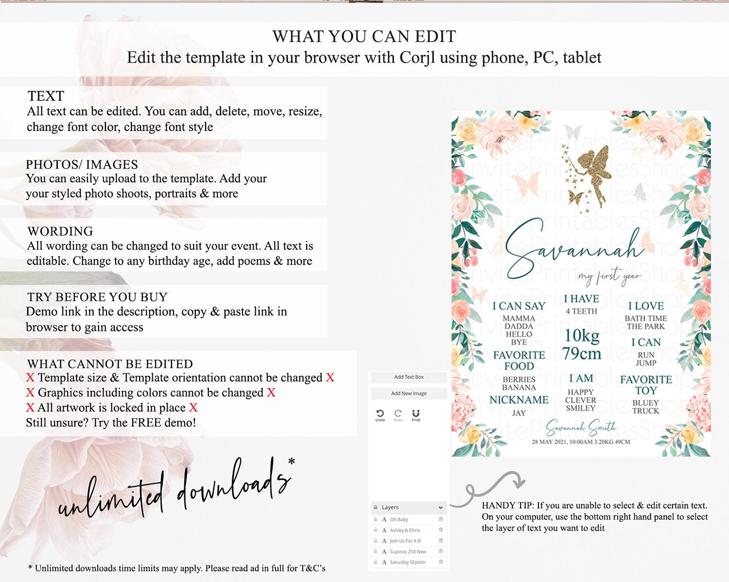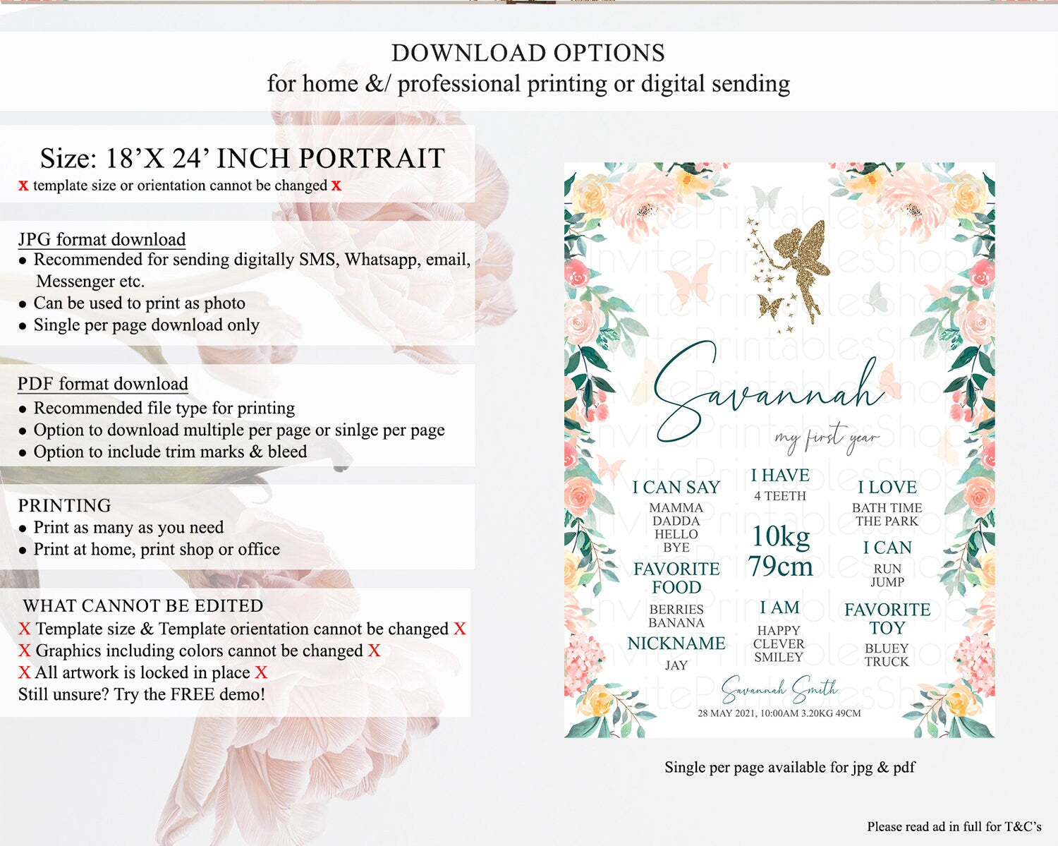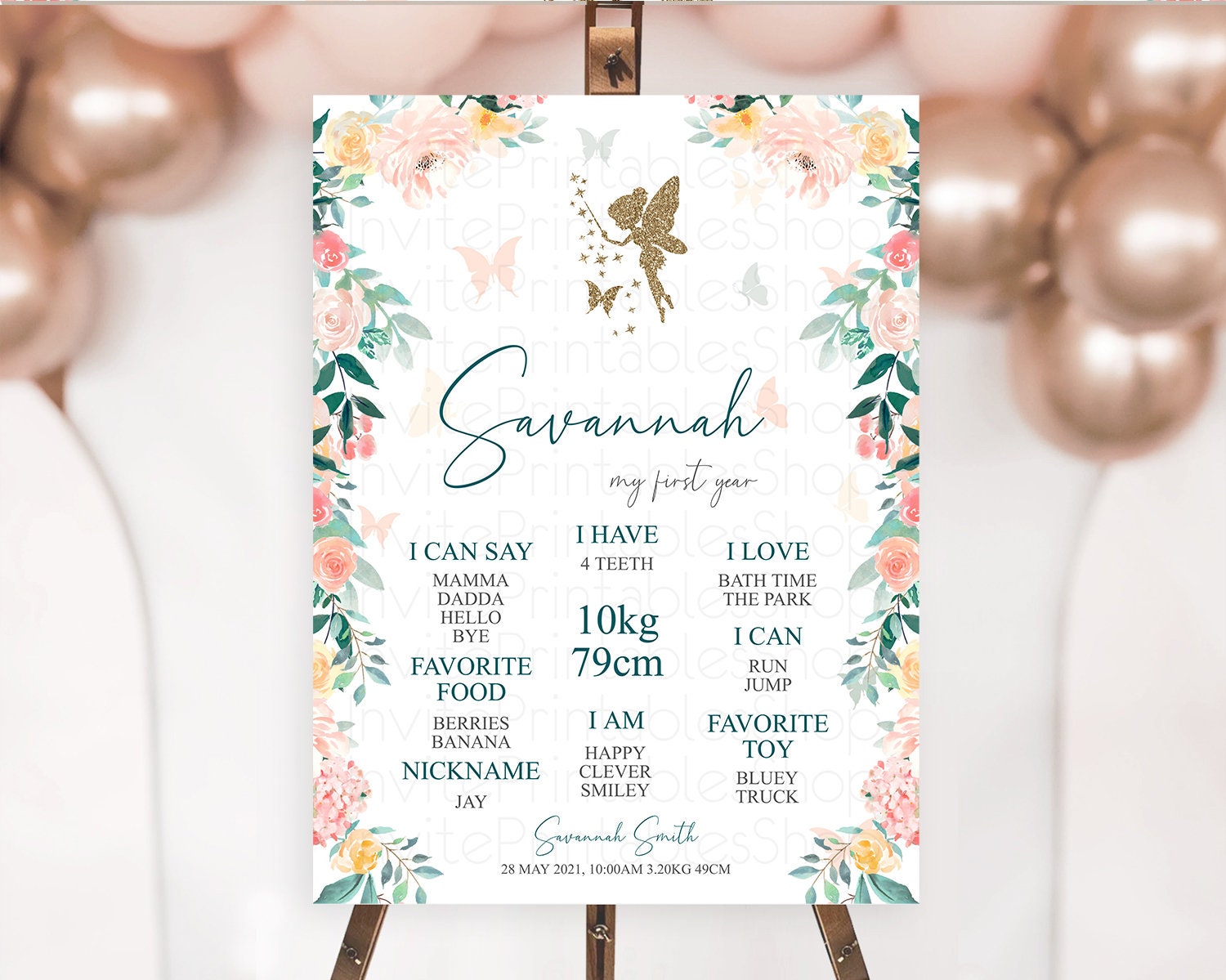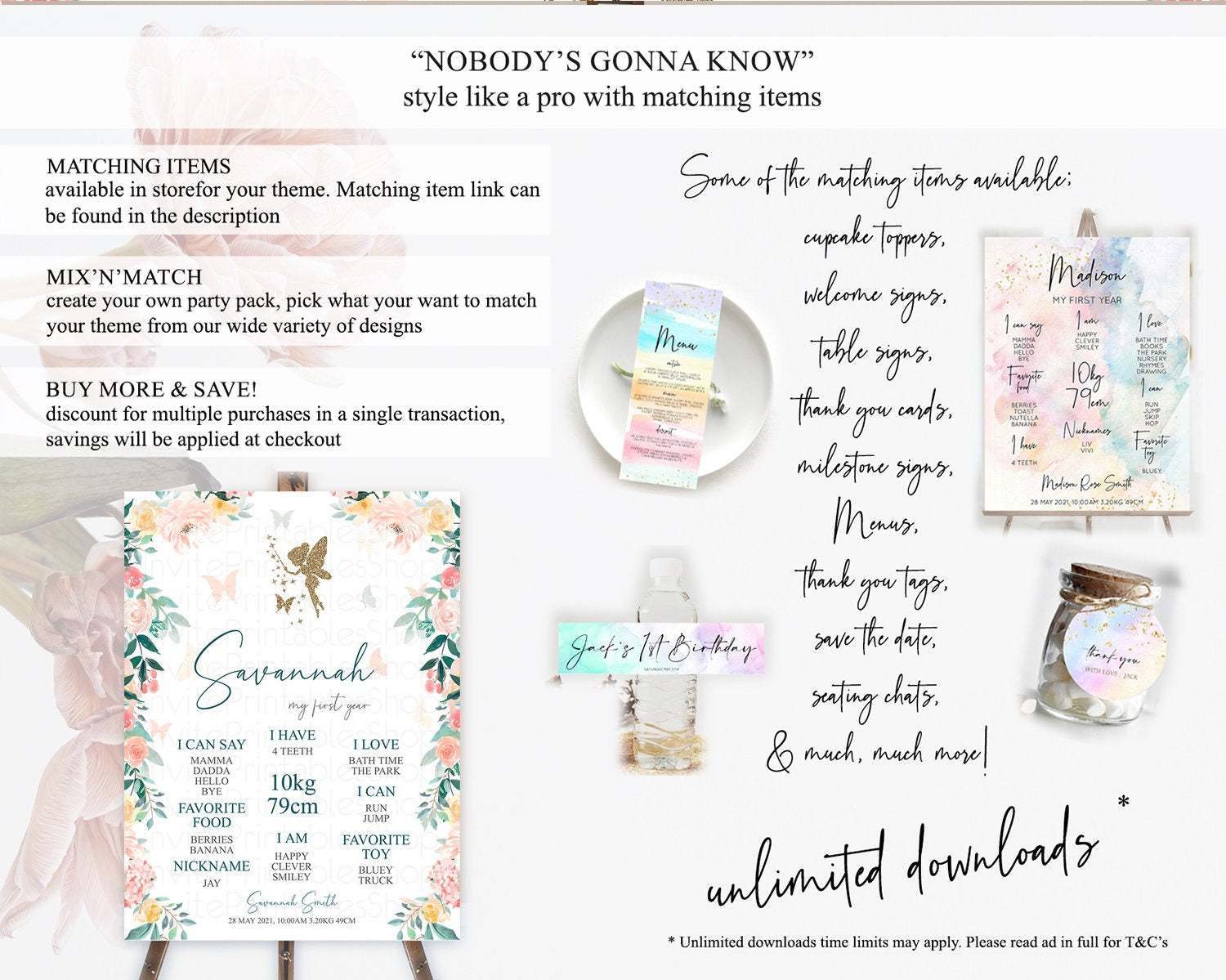 Fairy First Birthday Milestone Poster Fairy Secret Garden Milestone Board Enchanted Garden Pastel Floral Butterfly 1st Birthday Sign D10239