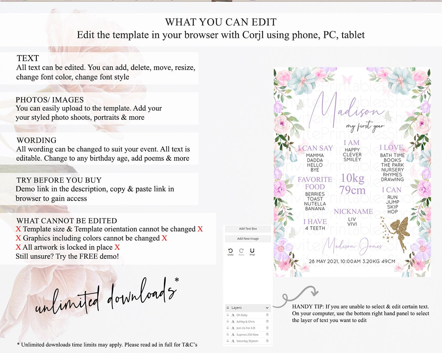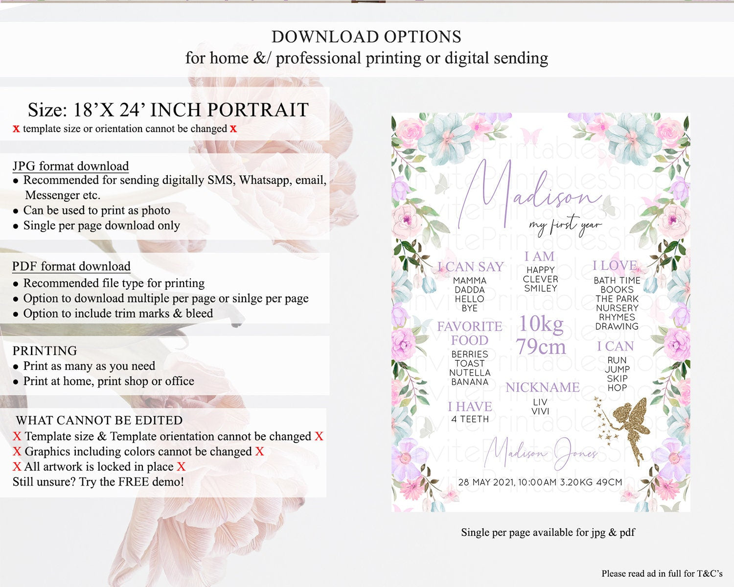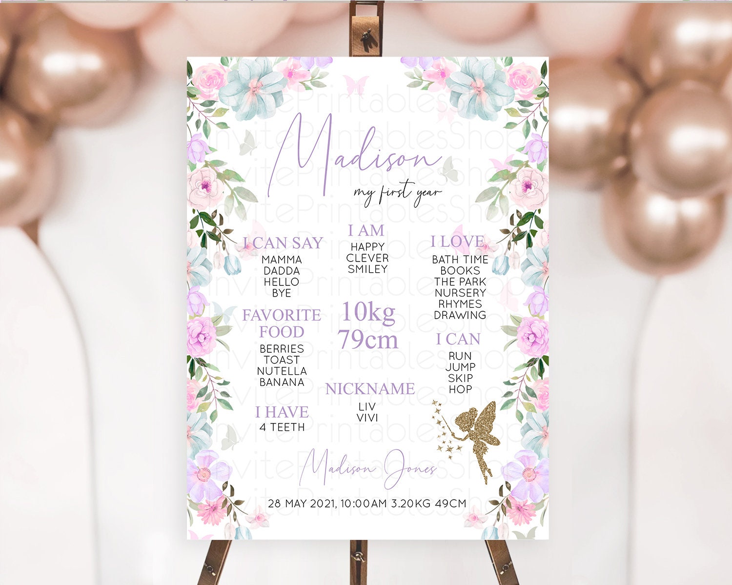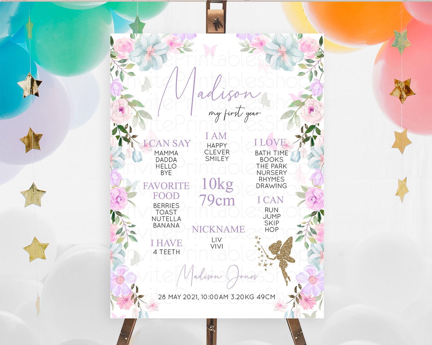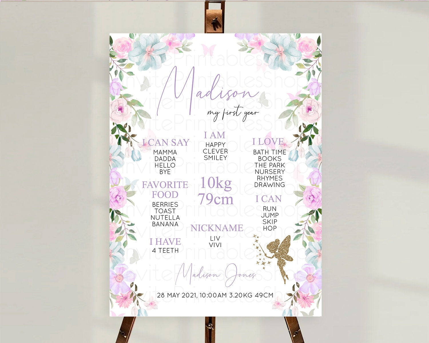 Fairy First Birthday Milestone Poster Fairy Secret Garden Milestone Board Enchanted Garden Pastel Floral Butterfly 1st Birthday Sign D10475