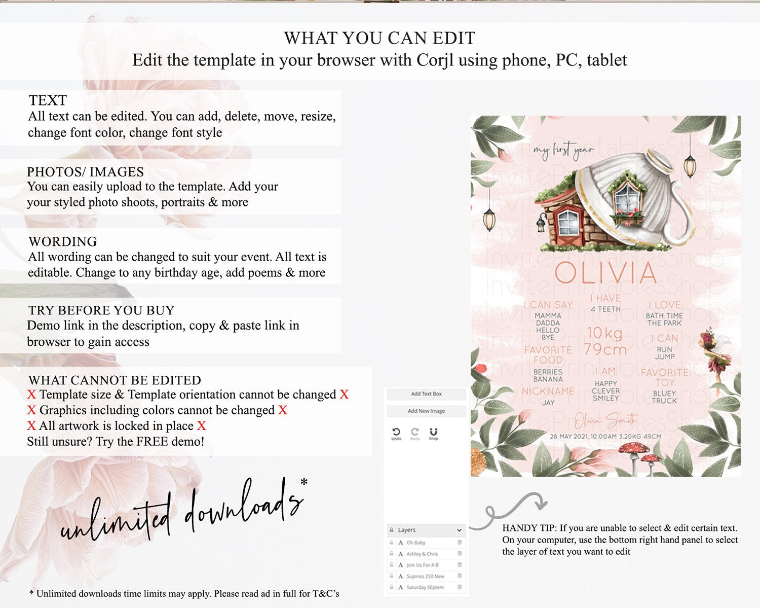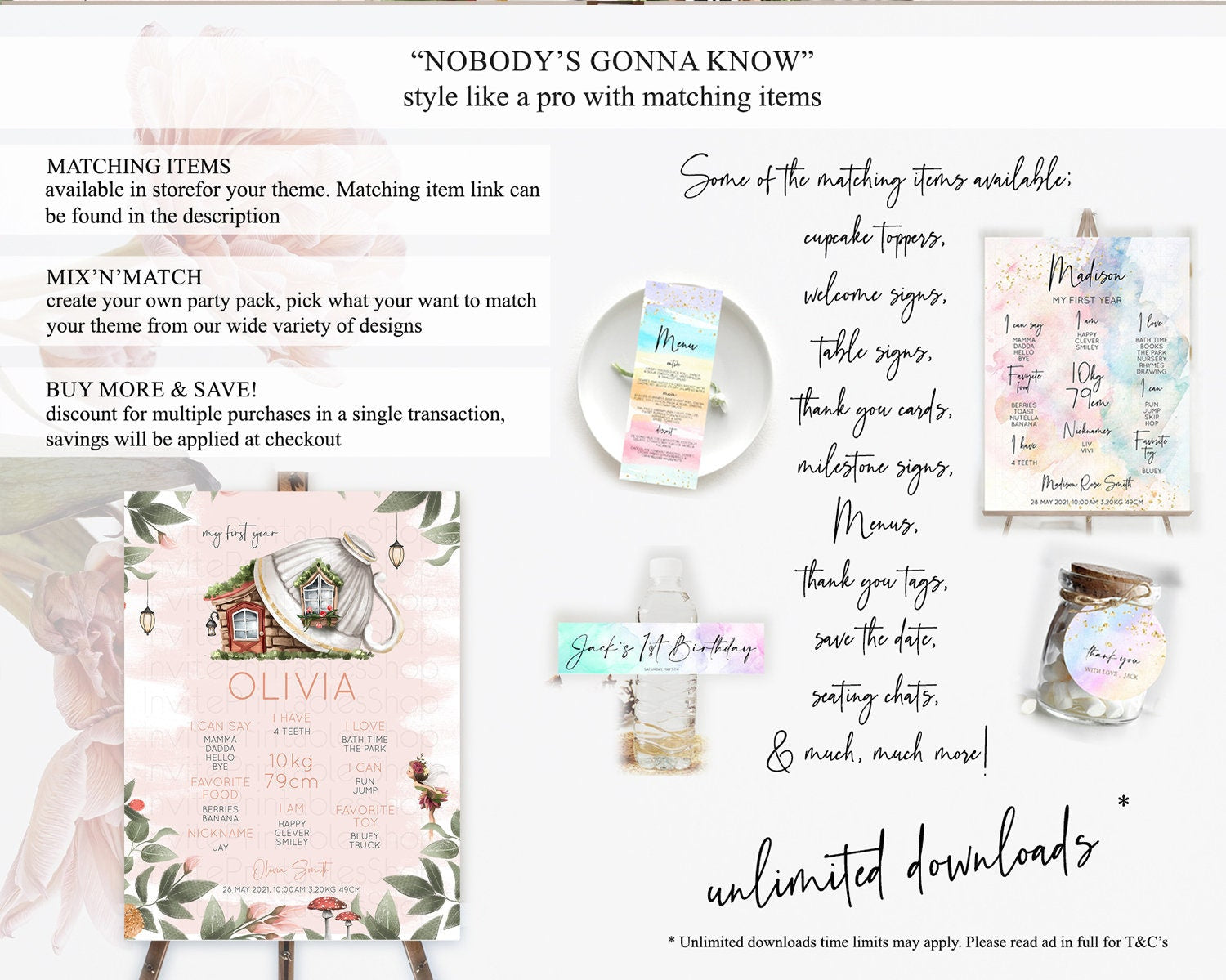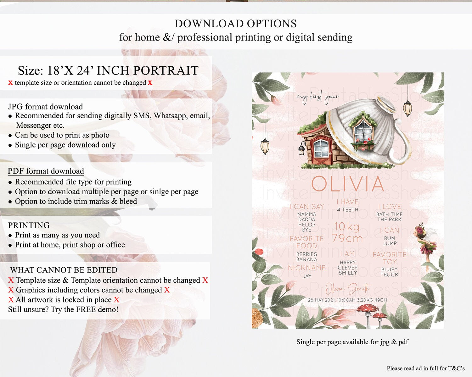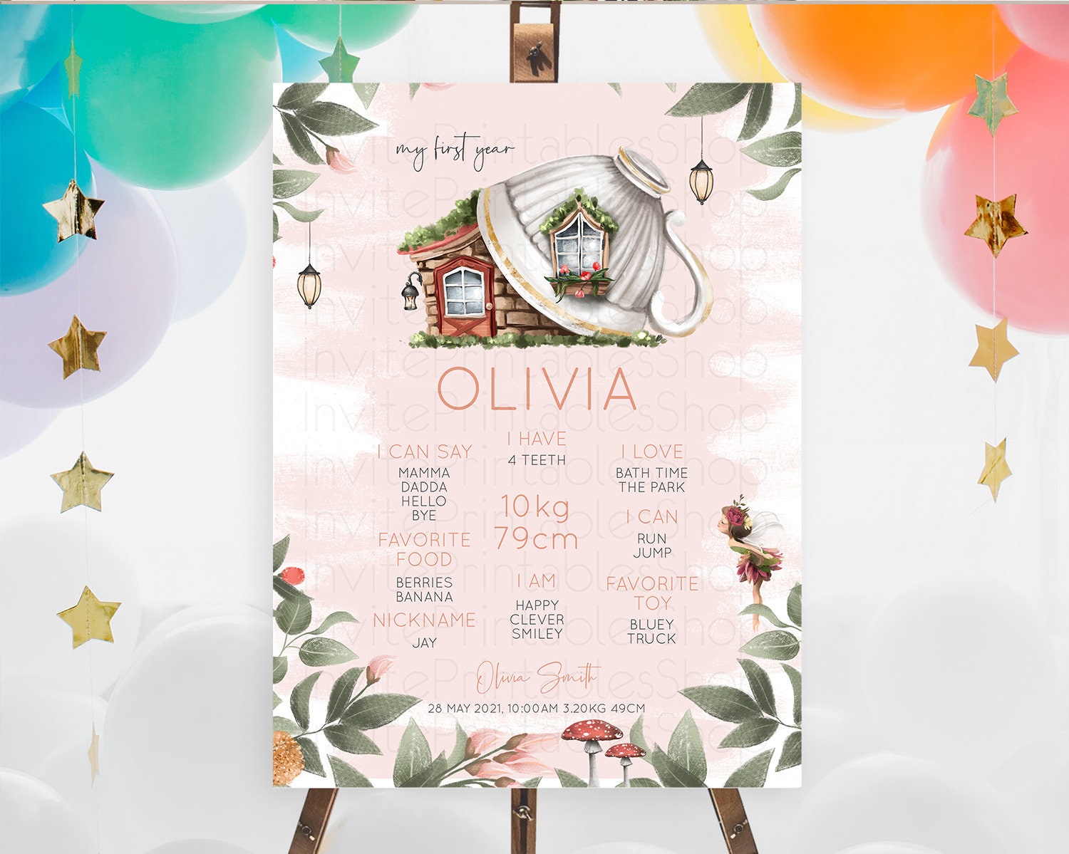 Fairy First Birthday Milestone Poster Fairy Secret Garden Milestone Board Enchanted Garden Pastel Floral Butterfly 1st Birthday Sign D10563