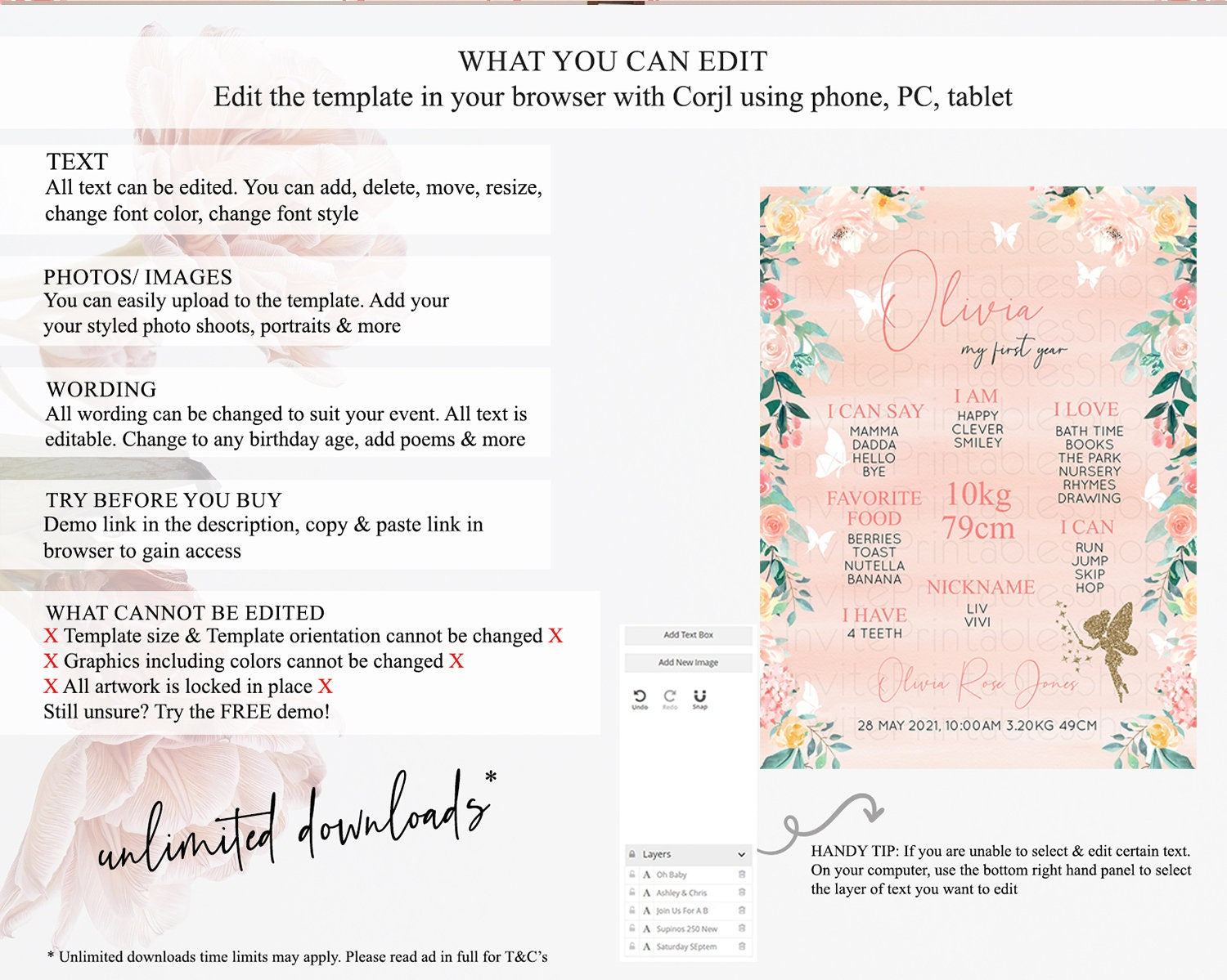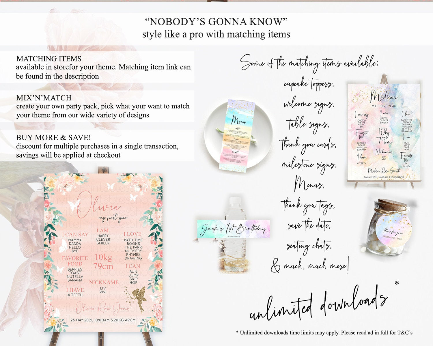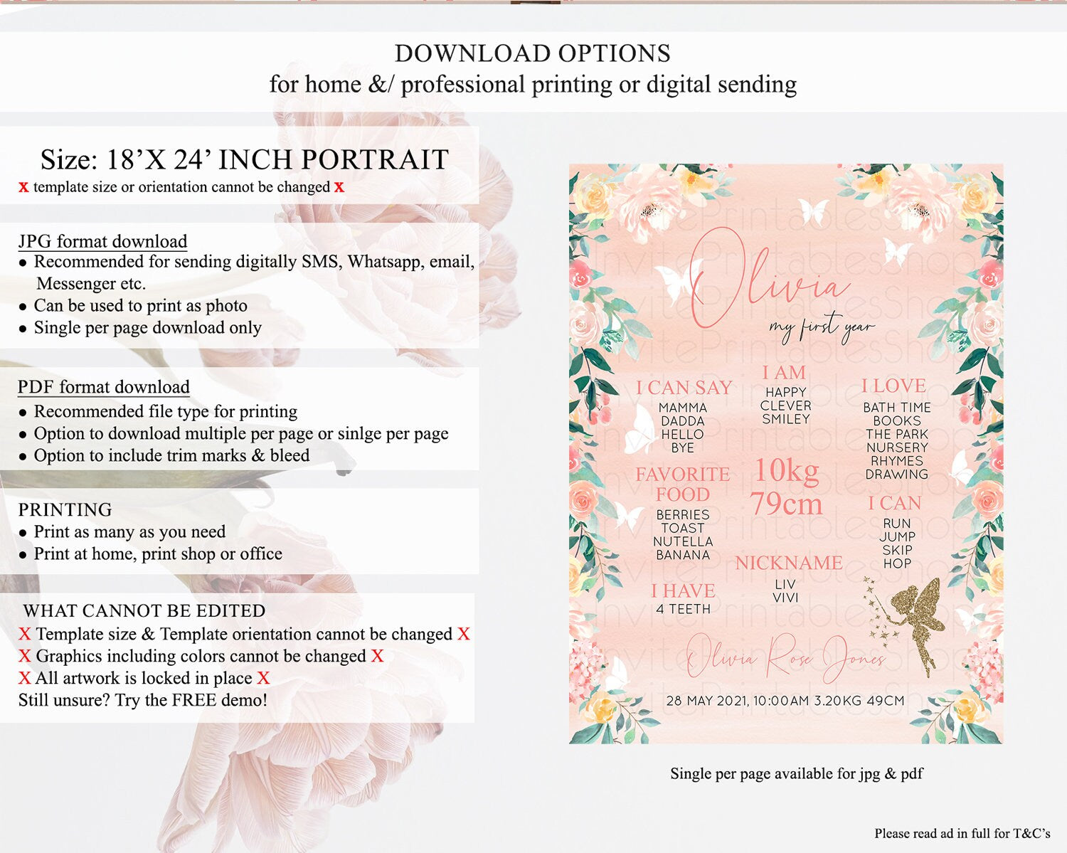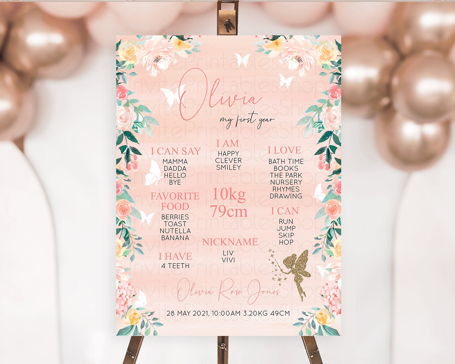 Fairy First Birthday Milestone Poster Fairy Secret Garden Milestone Board Enchanted Garden Pastel Floral Butterfly 1st Birthday Sign D10792