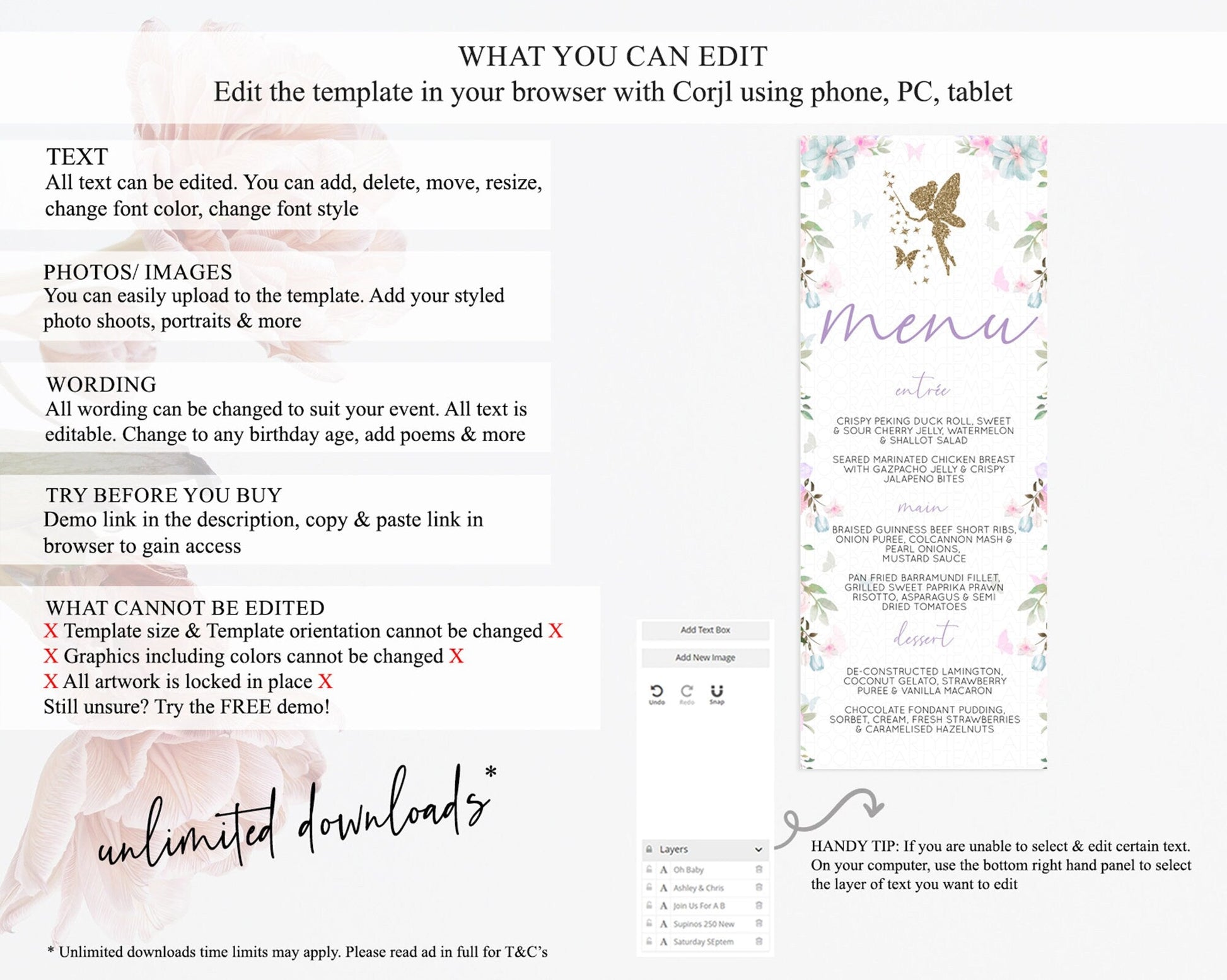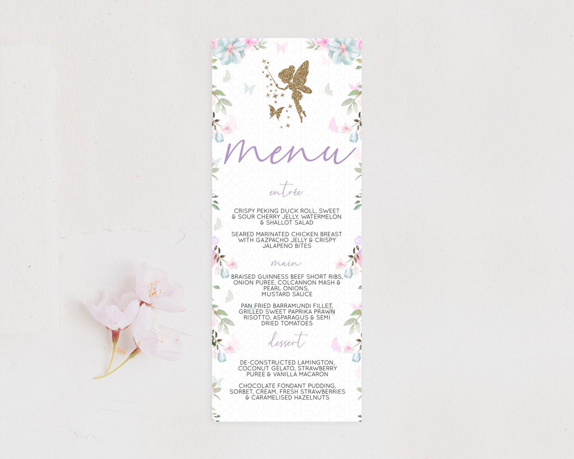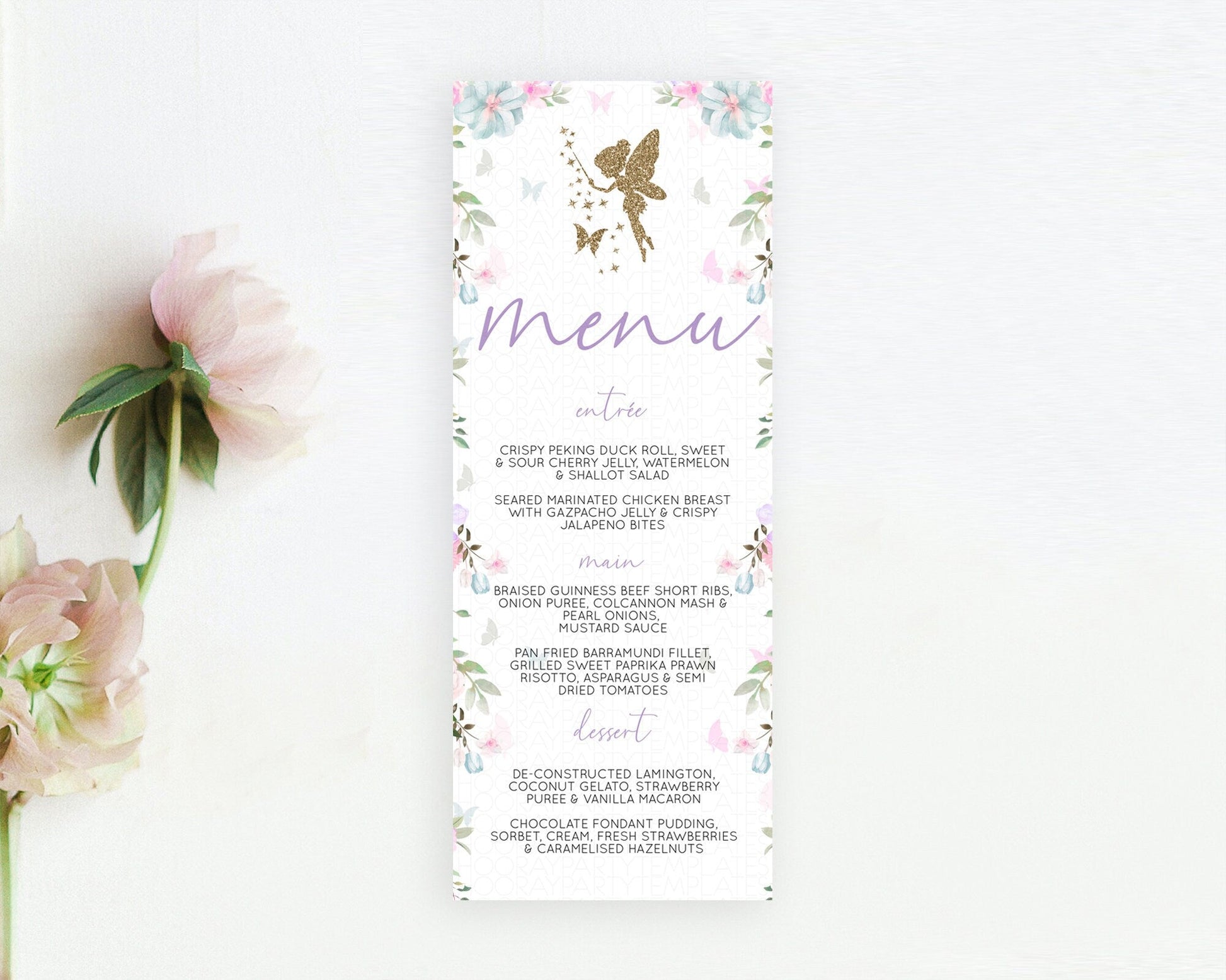 Fairy Menu Fairy Menu Template Enchanted Garden Pastel Floral Butterfly Table Decor Fairy Secret Garden Dinner Dessert Food Menu D10475