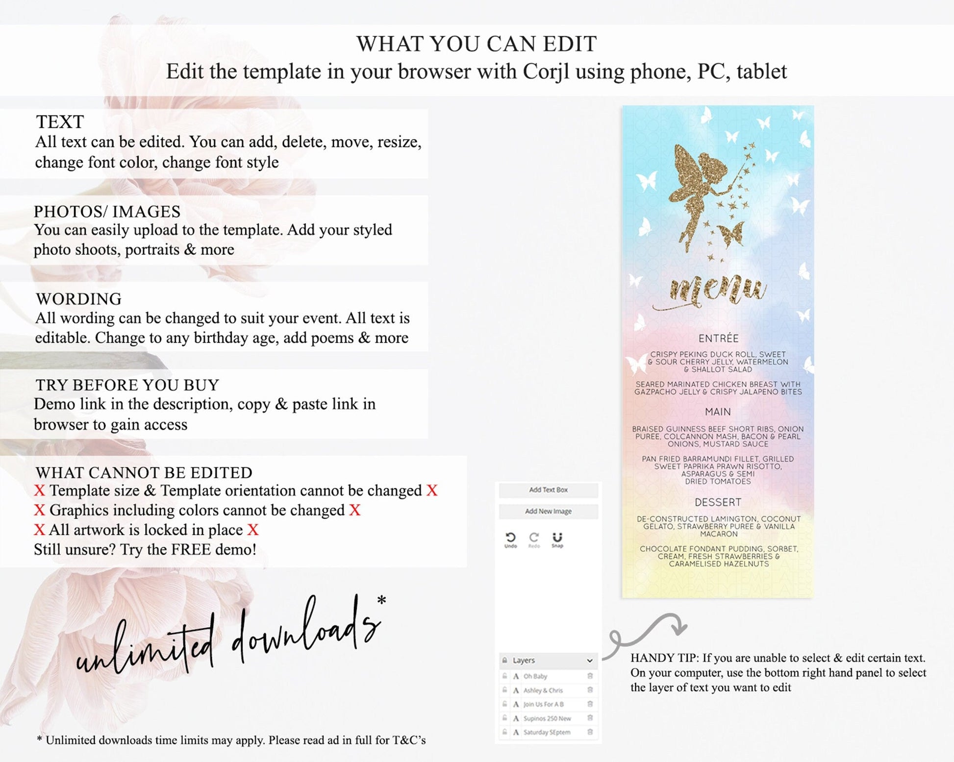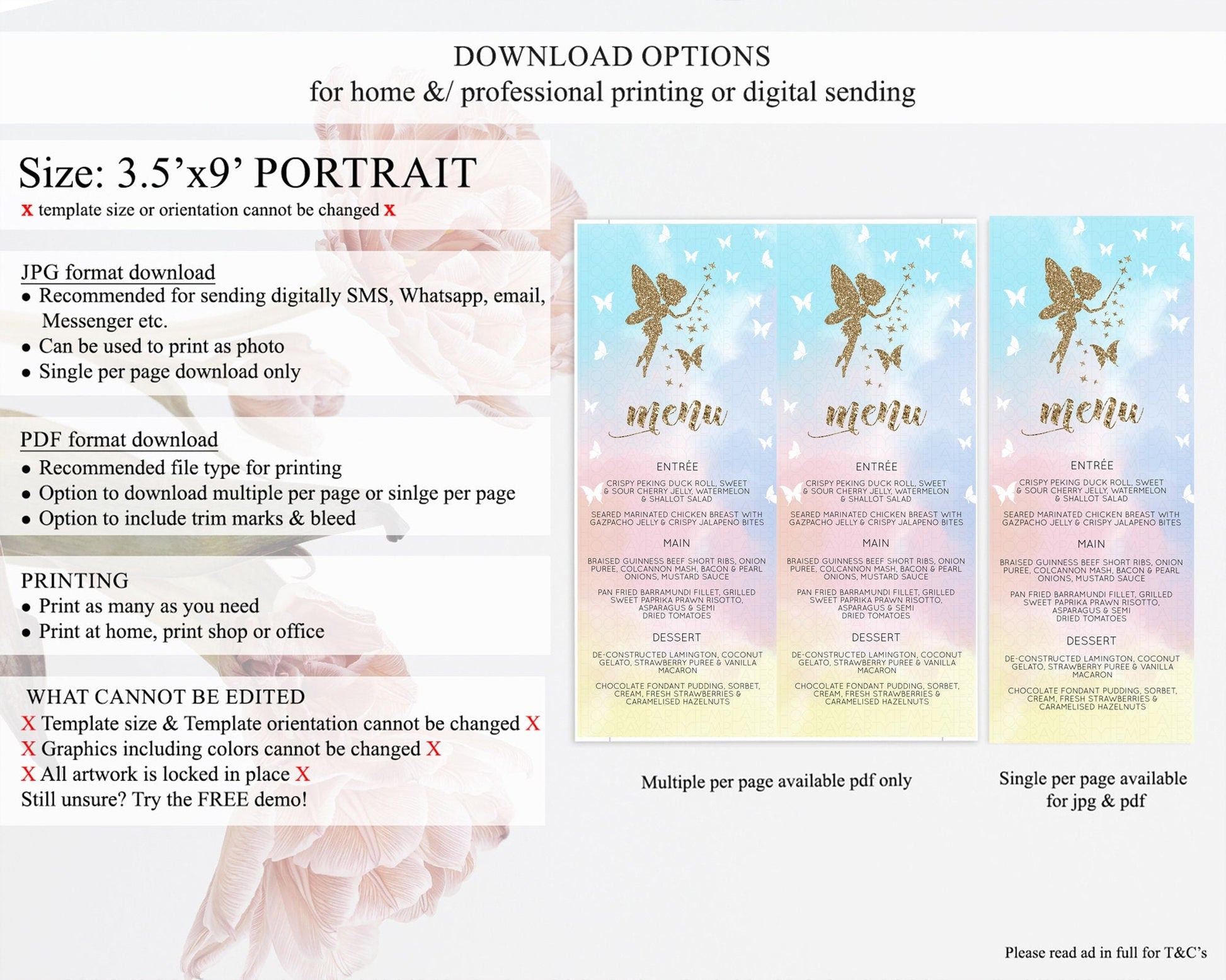 Fairy Menu Fairy Menu Template Enchanted Garden Pastel Floral Butterfly Table Decor Fairy Secret Garden Dinner Dessert Food Menu D10894