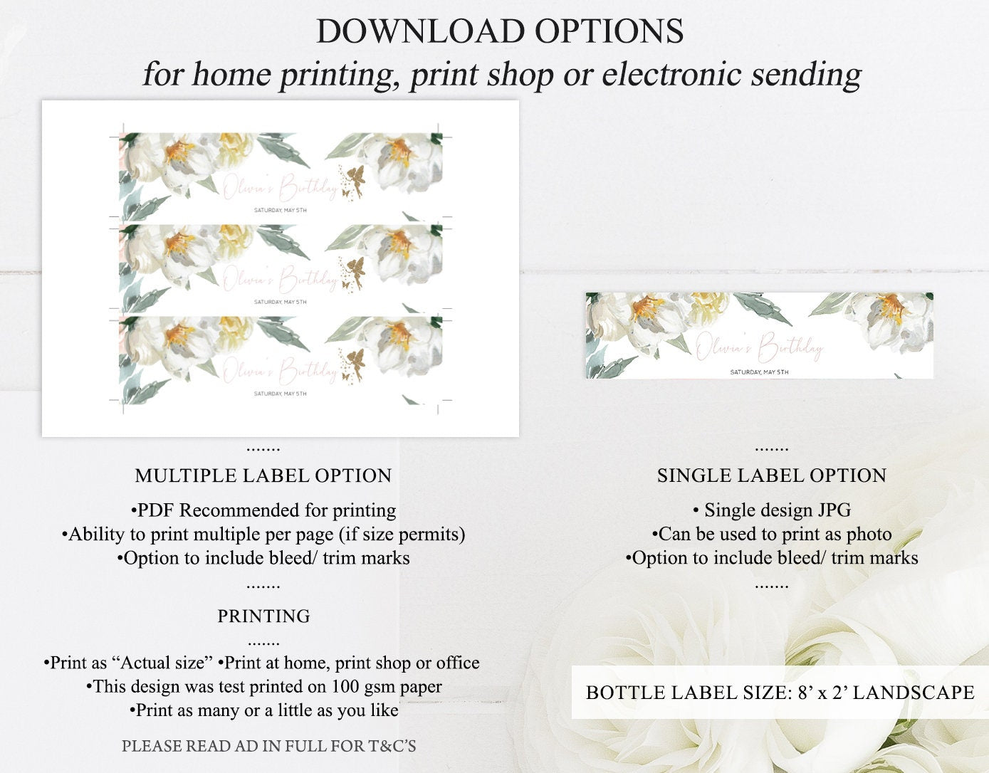 Fairy Water Bottle Label White Floral Garden Drink Label Fairy Whimsical Butterflies Glitter Pixie Magic Floral Garden Bottle Label 108