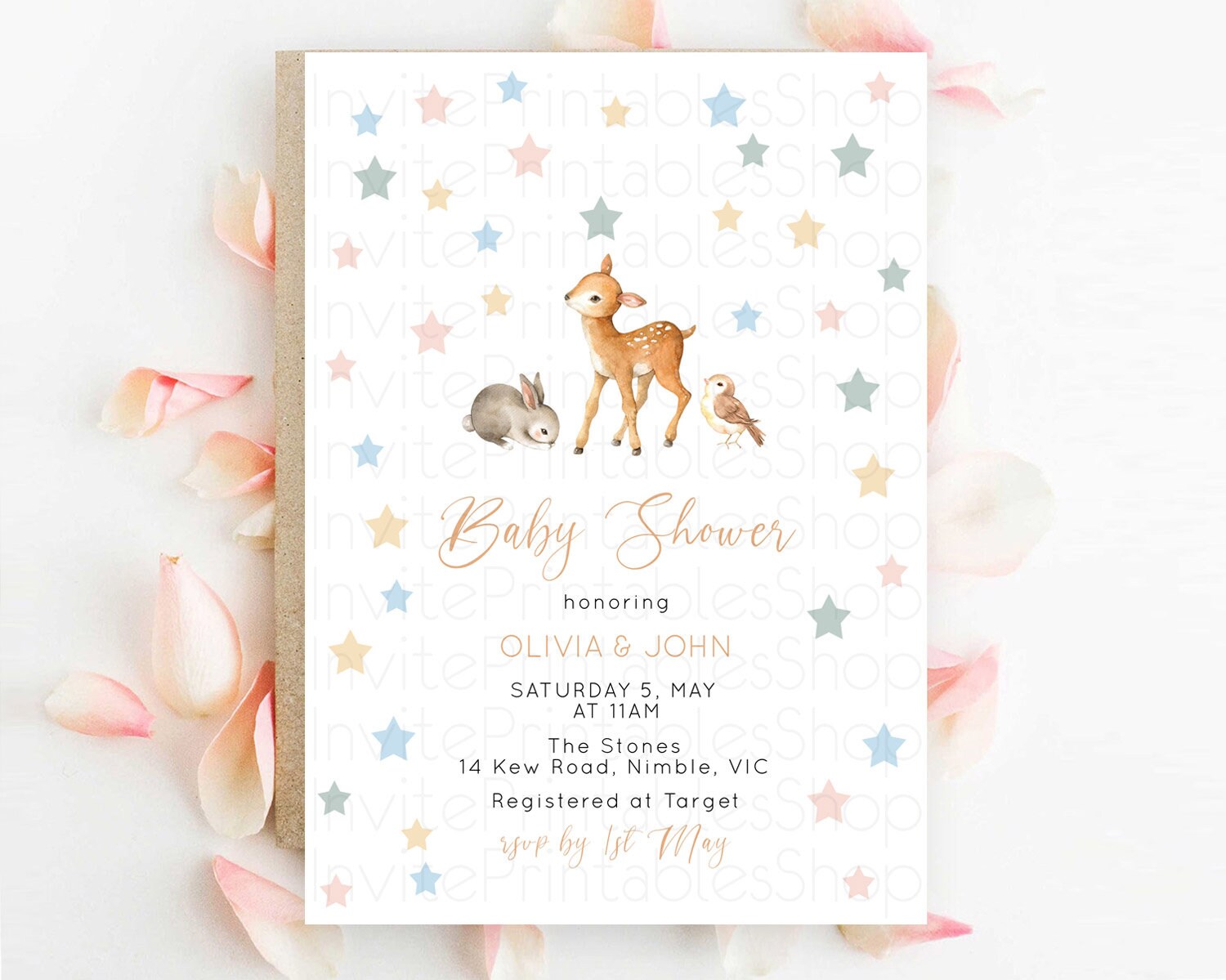 Fawn Baby Shower Invitation, : Baby Deer, Bunny, and Forest Animals with Pastel Blue Green Confetti Stars - Whimsical Woodland Theme D10918