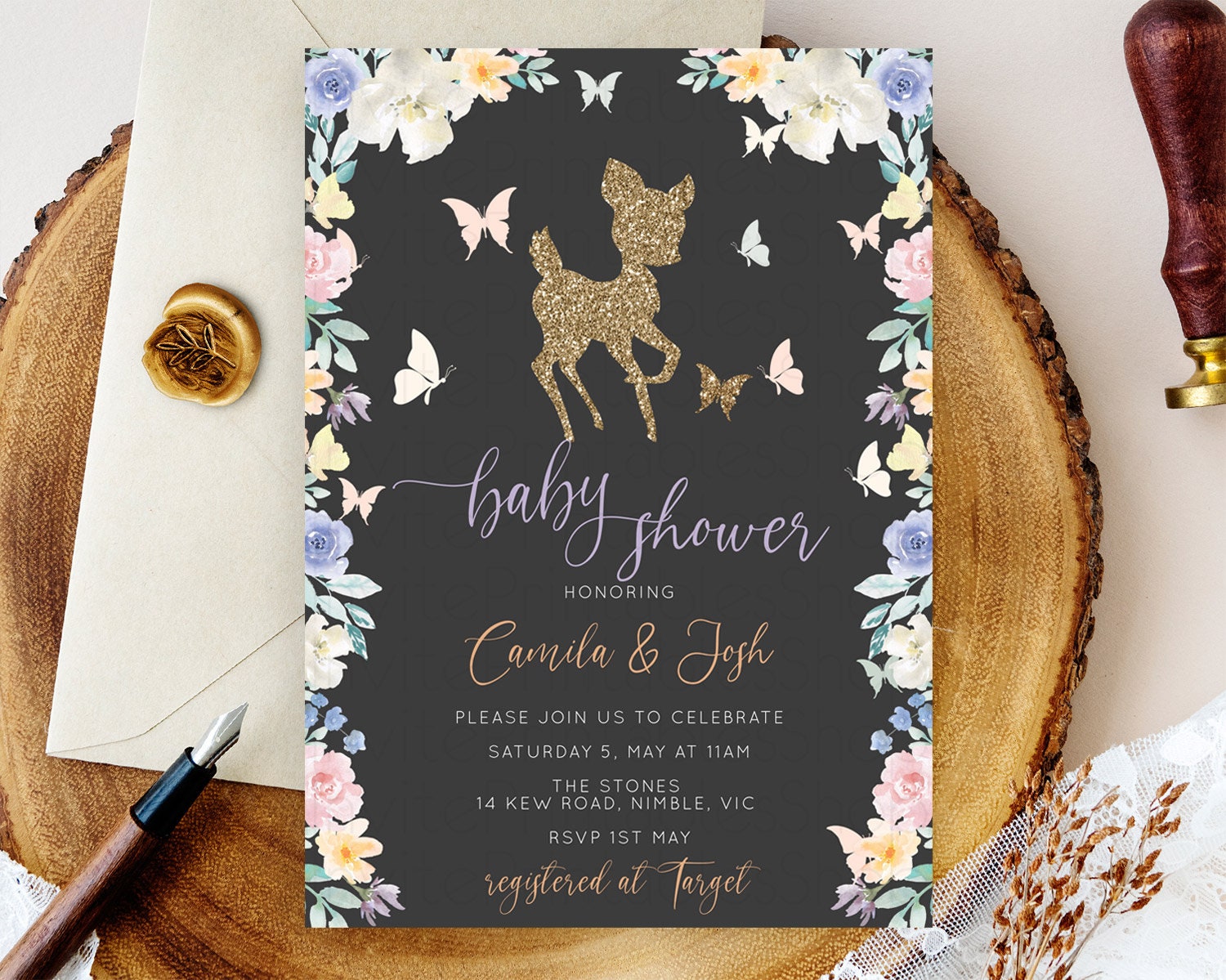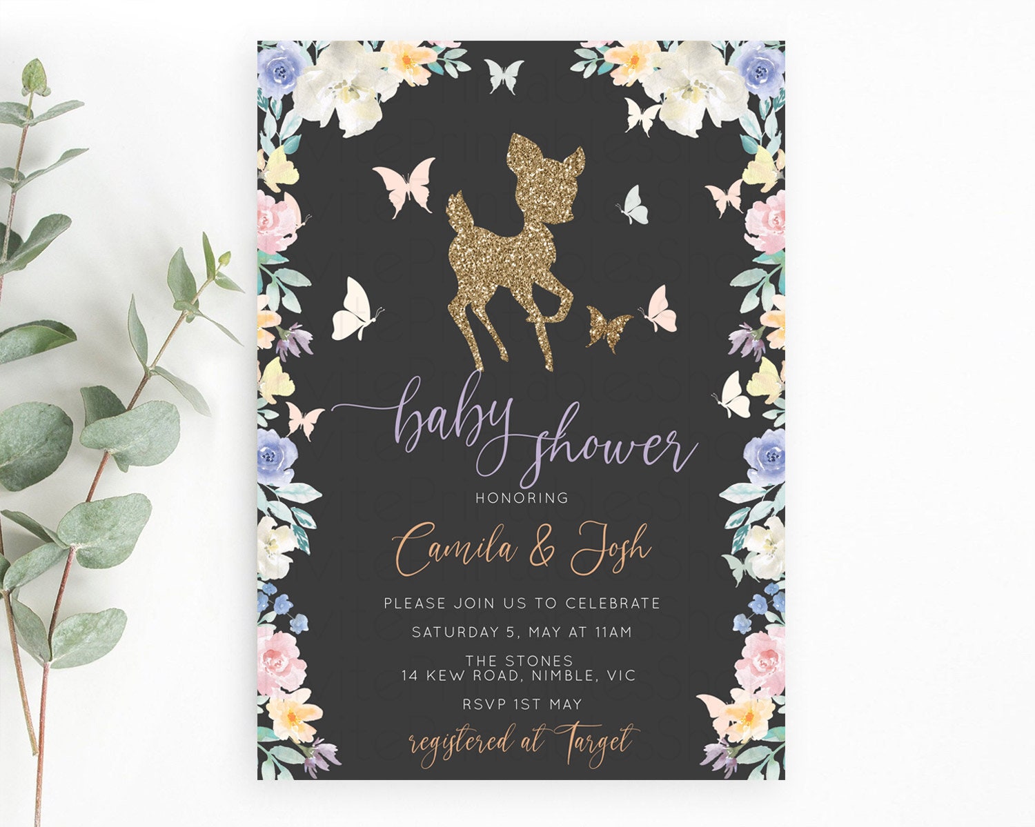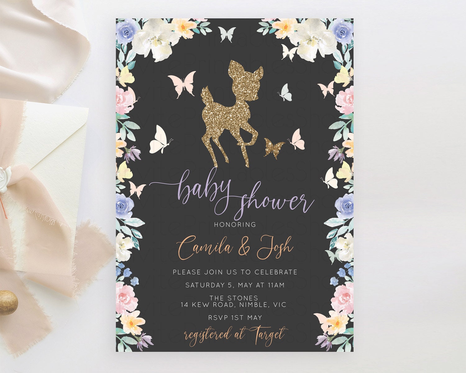 Fawn Baby Shower Invitation Deer Baby Shower Invites Enchanted Forest Theme Butterfly Pastel Flowers Whimsical Baby Shower D10323