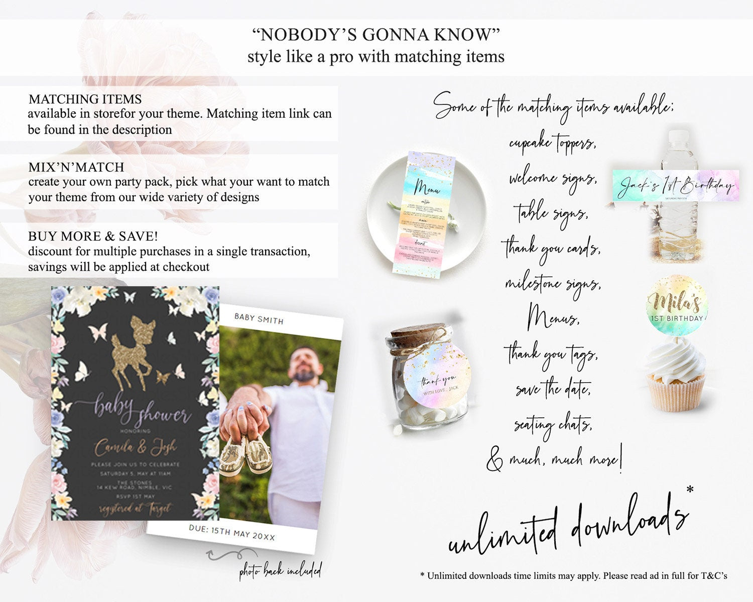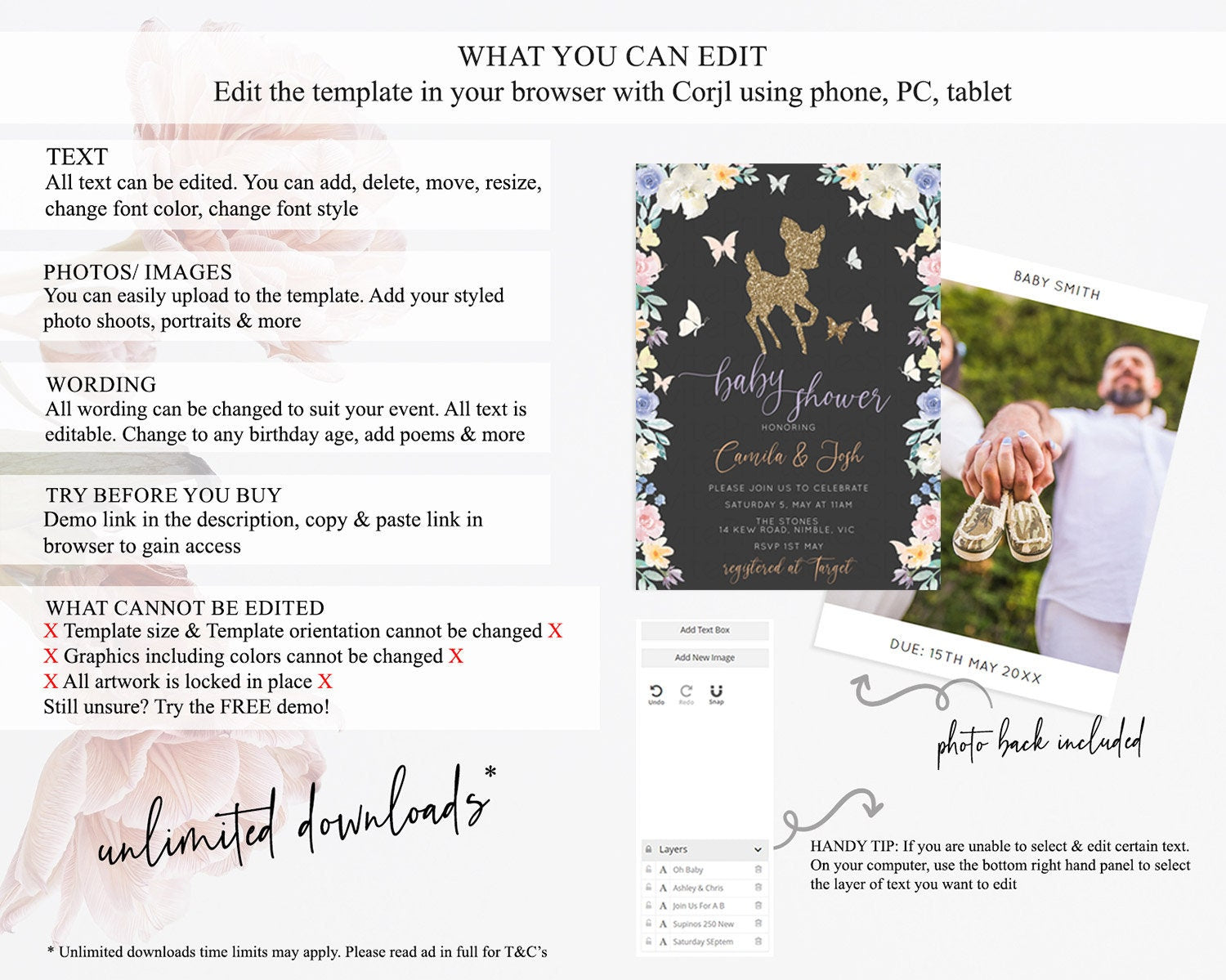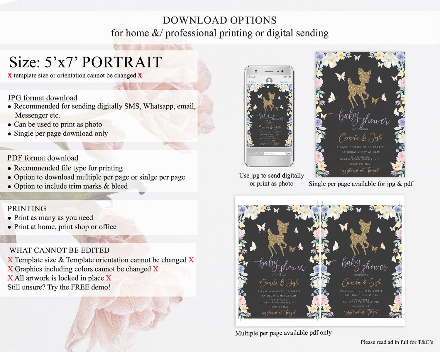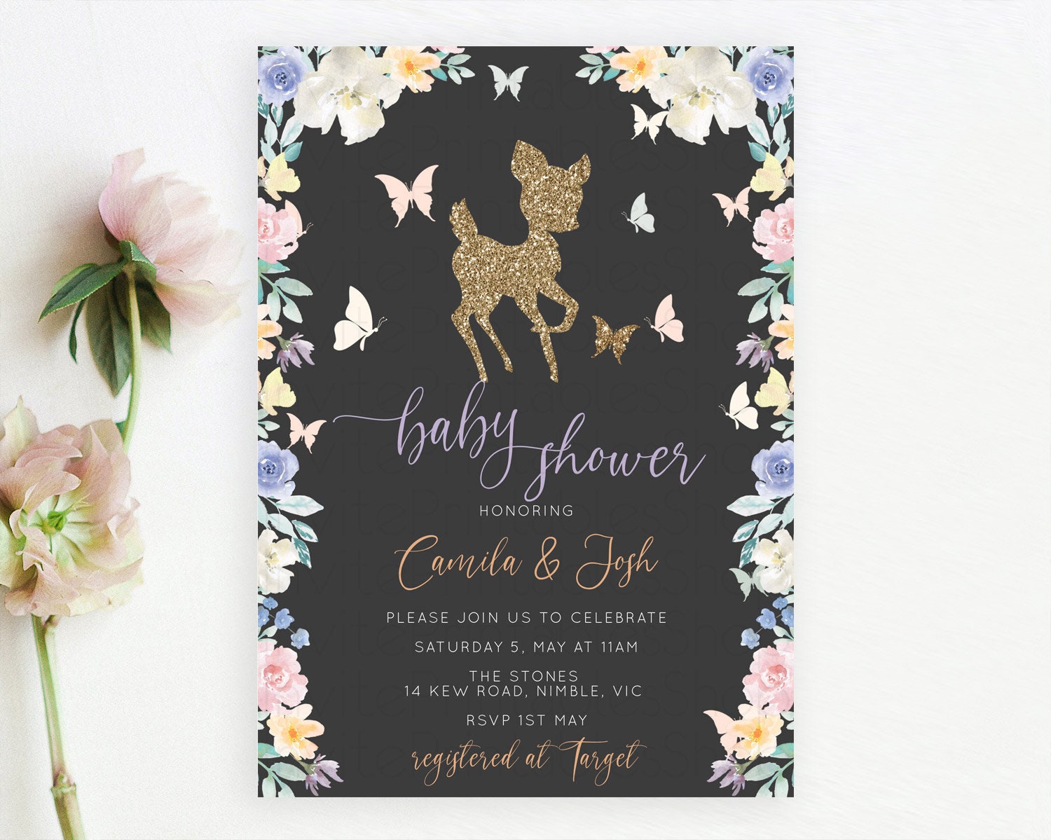 Fawn Baby Shower Invitation Deer Baby Shower Invites Enchanted Forest Theme Butterfly Pastel Flowers Whimsical Baby Shower D10323