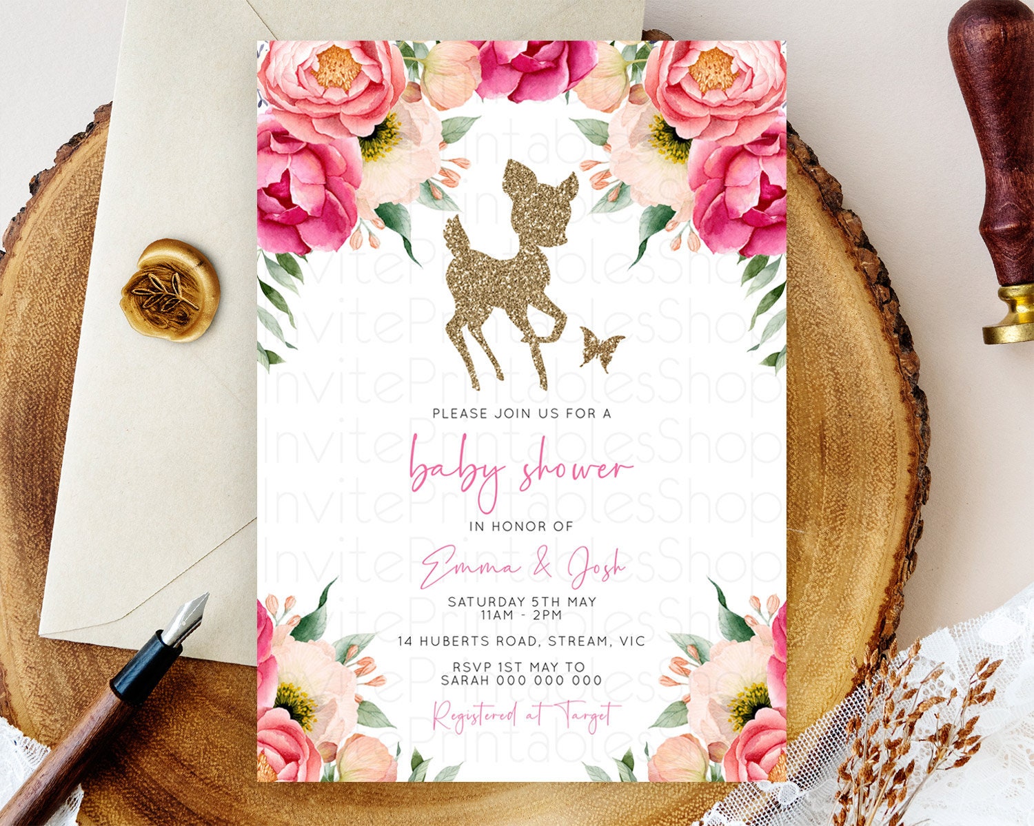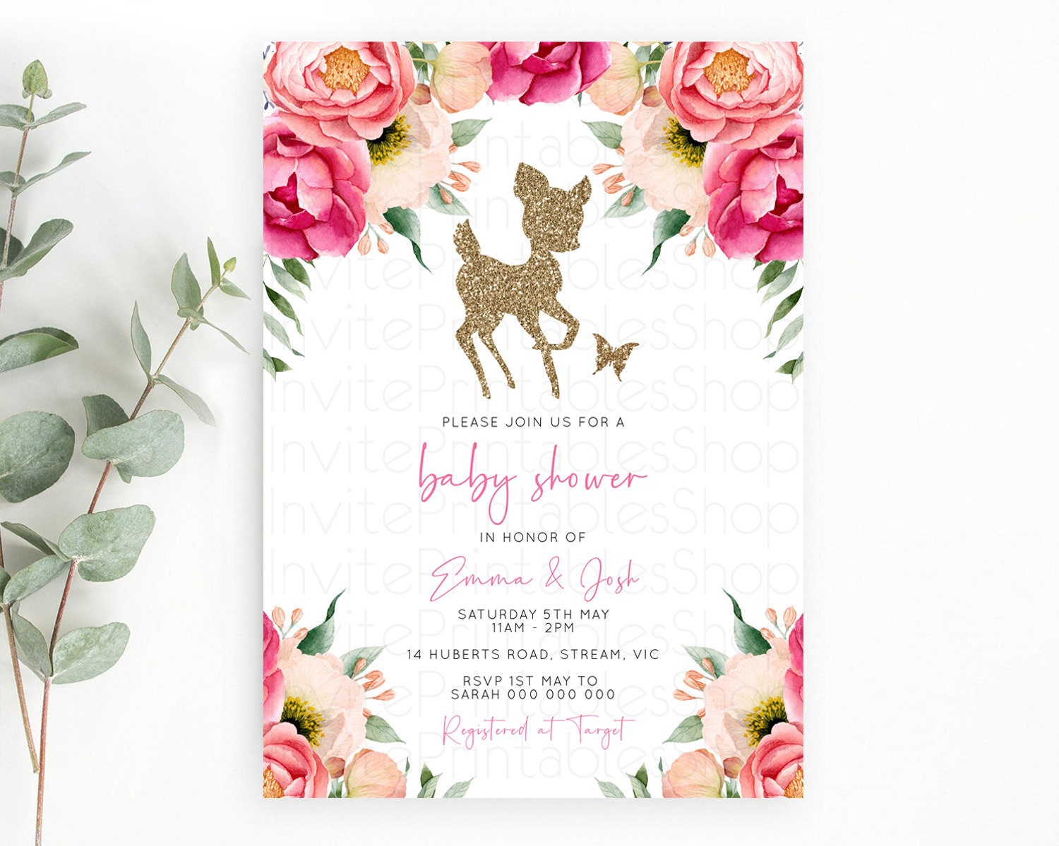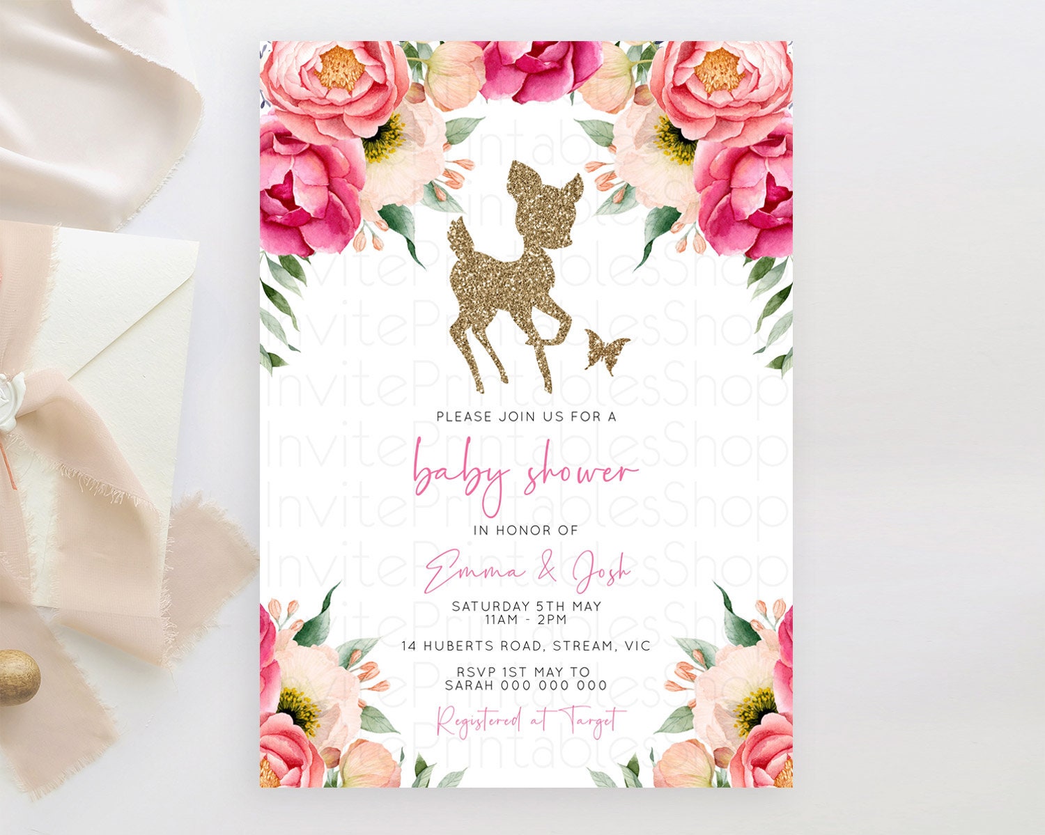 Fawn Baby Shower Invitation Deer Baby Shower Invites Enchanted Forest Theme Butterfly Pastel Flowers Whimsical Baby Shower D10326