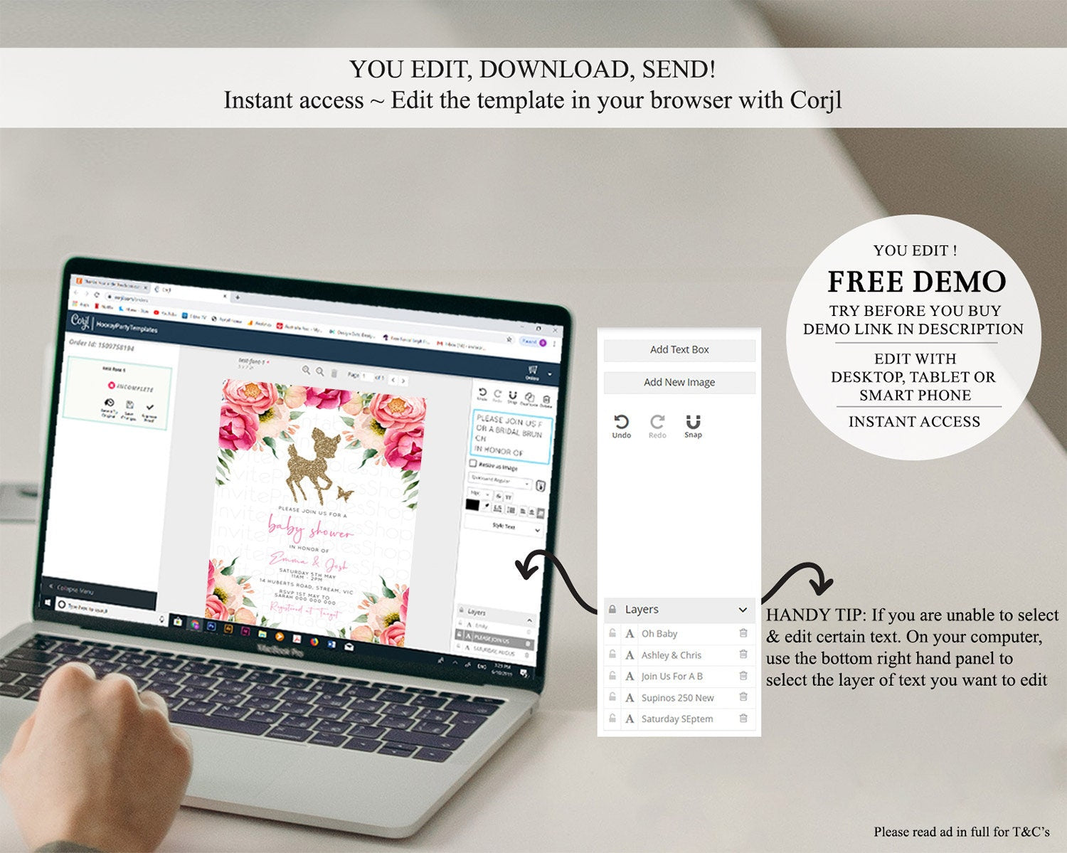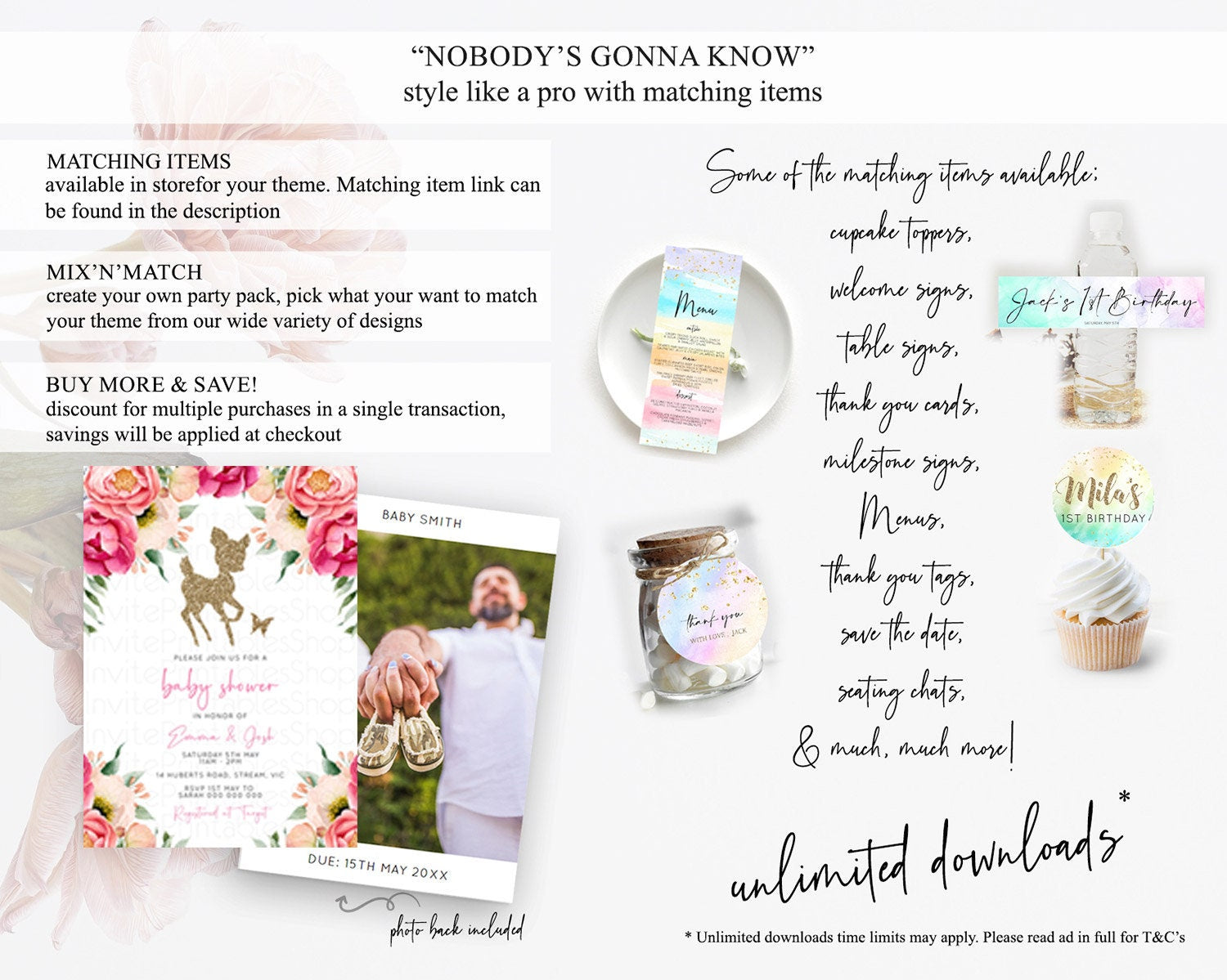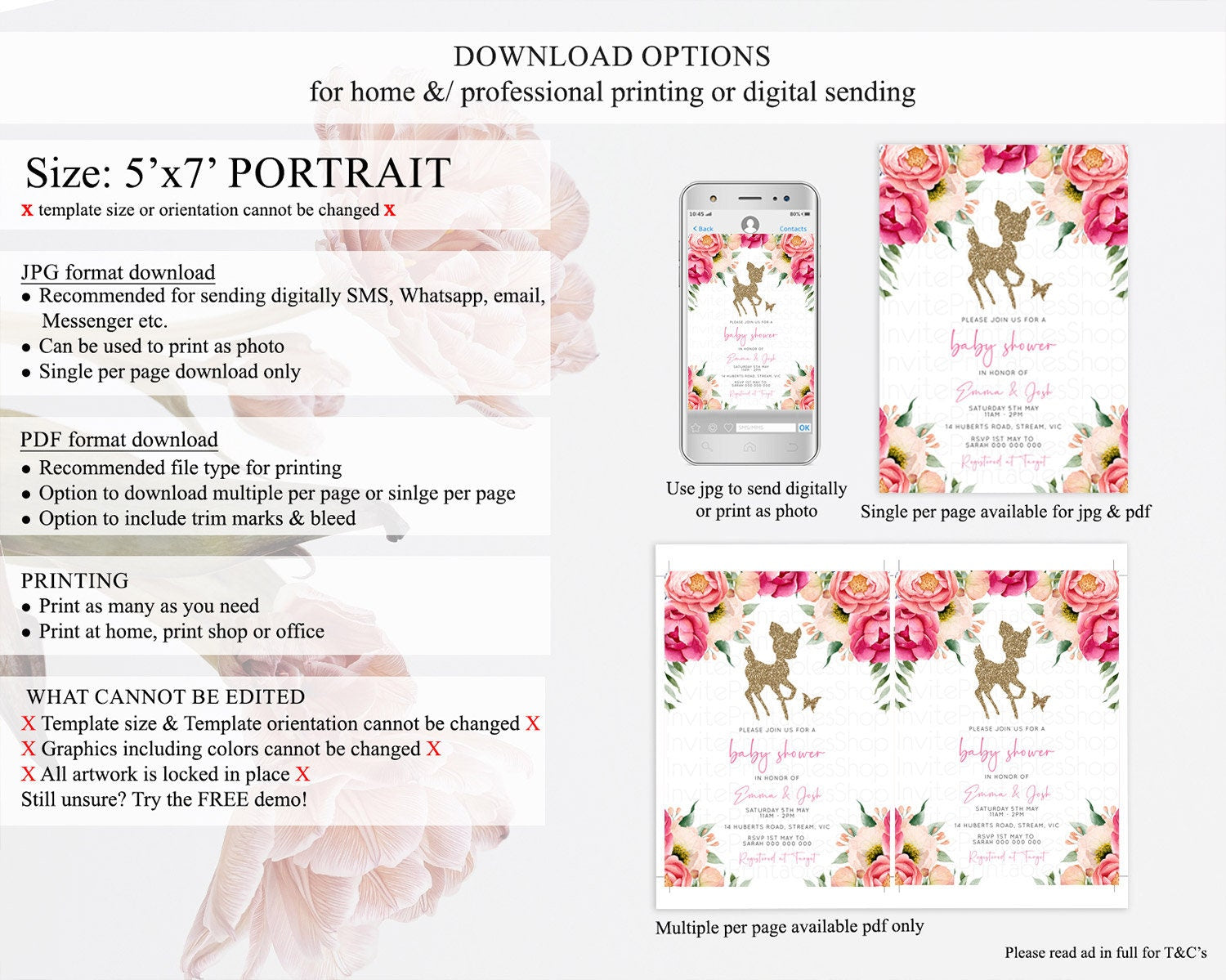 Fawn Baby Shower Invitation Deer Baby Shower Invites Enchanted Forest Theme Butterfly Pastel Flowers Whimsical Baby Shower D10326