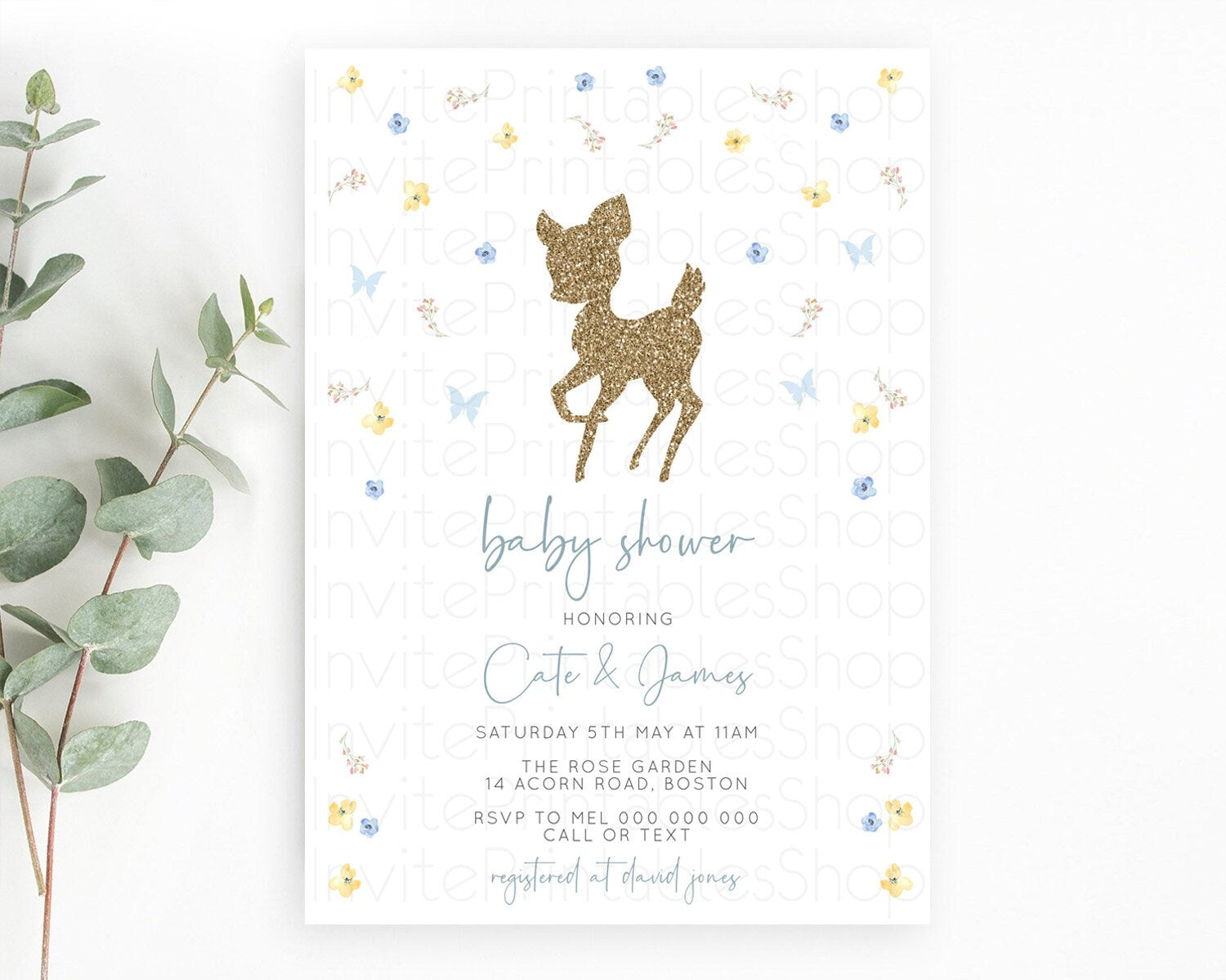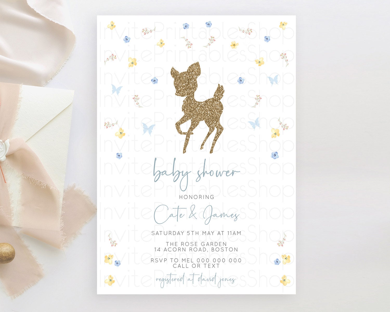 Fawn Baby Shower Invitation Deer Baby Shower Invites Enchanted Forest Theme Butterfly Pastel Flowers Whimsical Baby Shower D10360