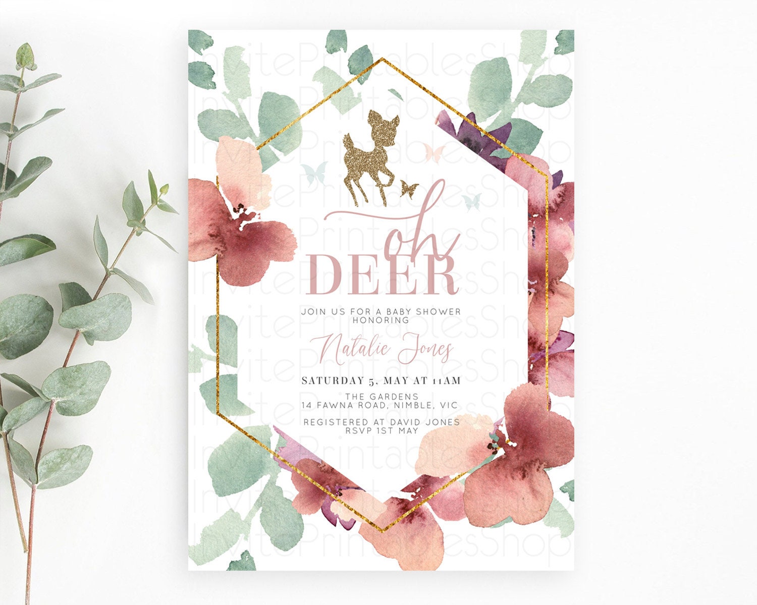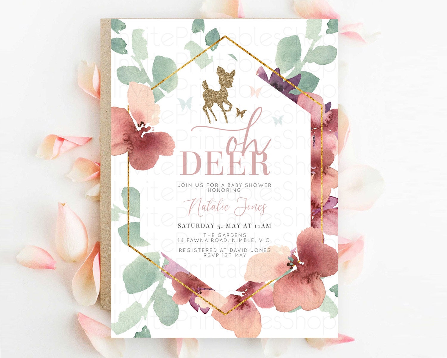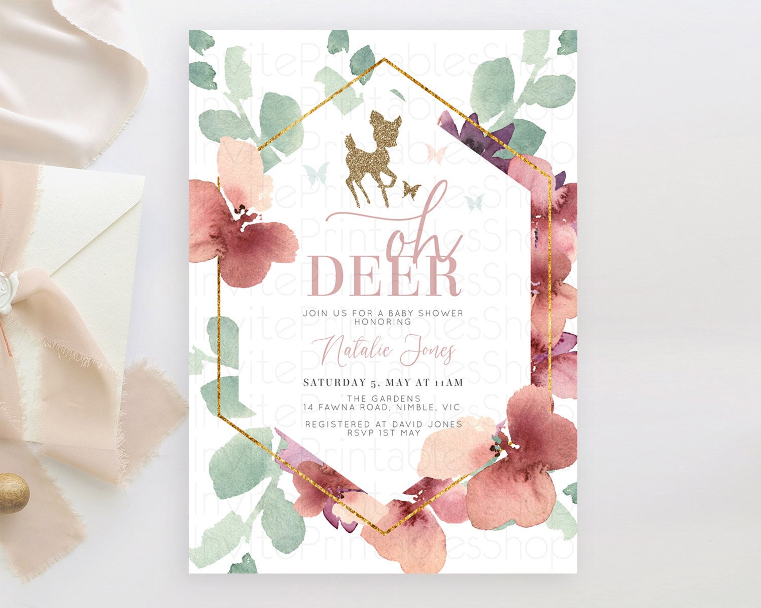 Fawn Baby Shower Invitation Deer Baby Shower Invites Enchanted Forest Theme Butterfly Pastel Flowers Whimsical Baby Shower D10459