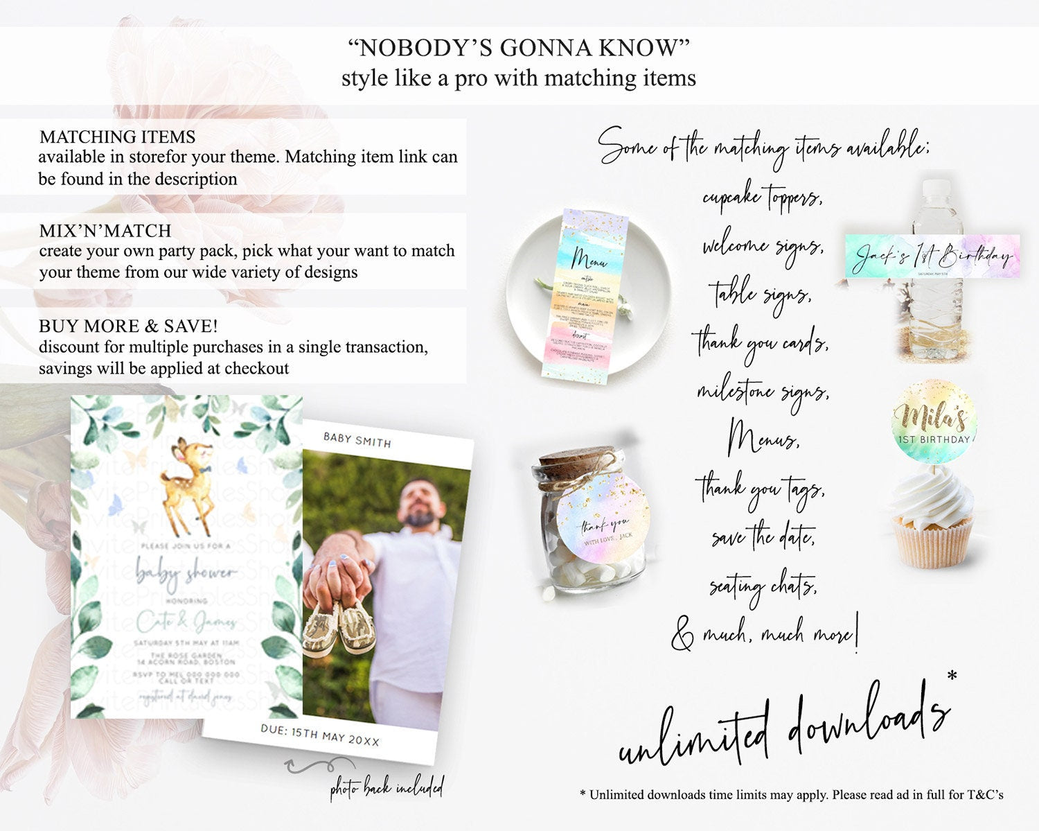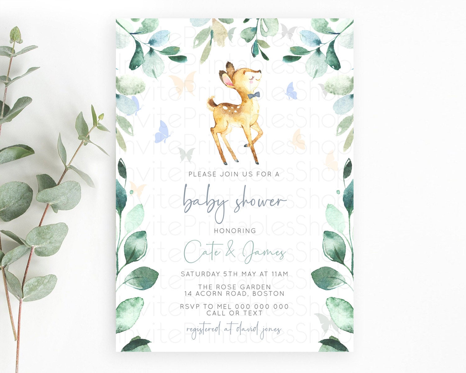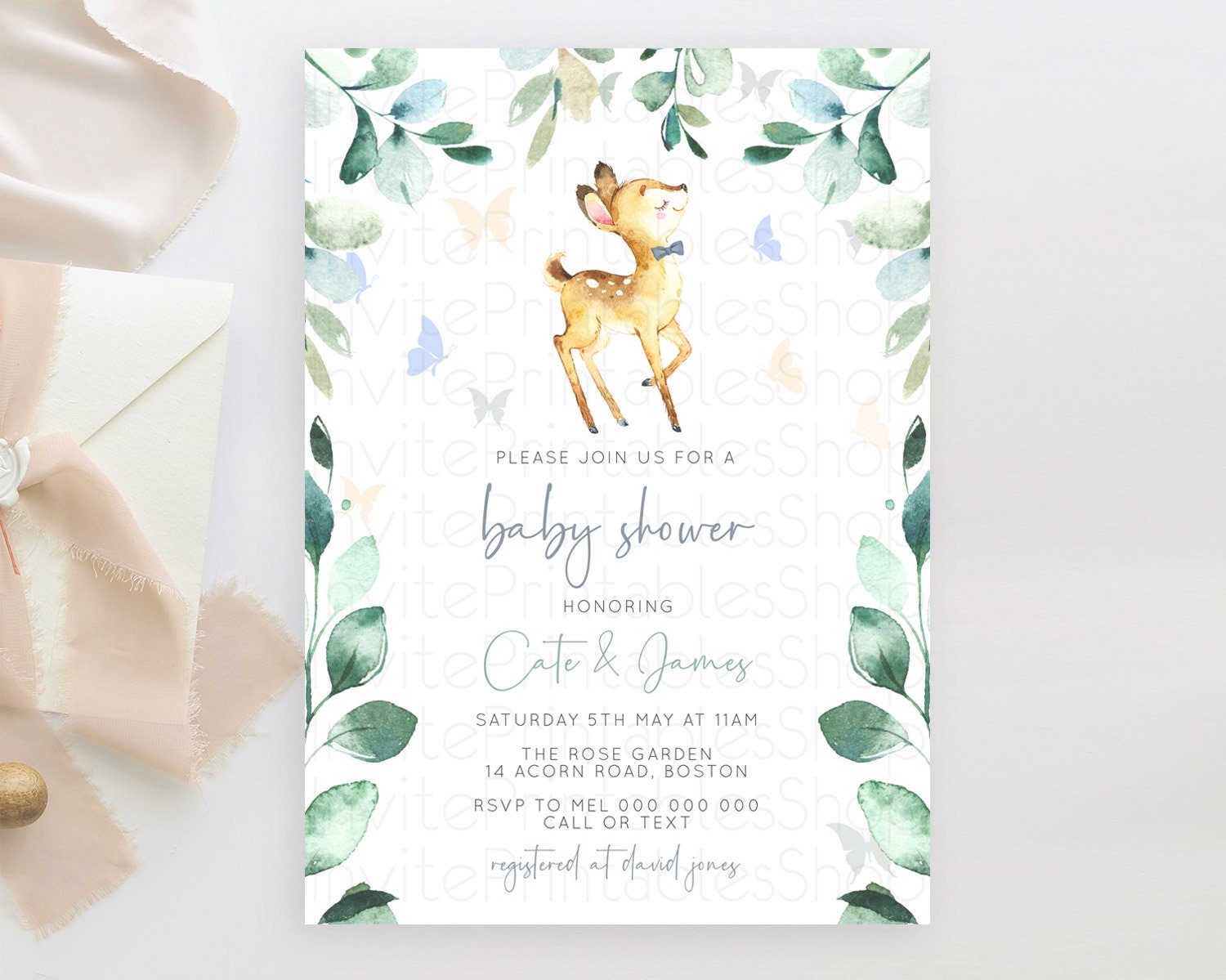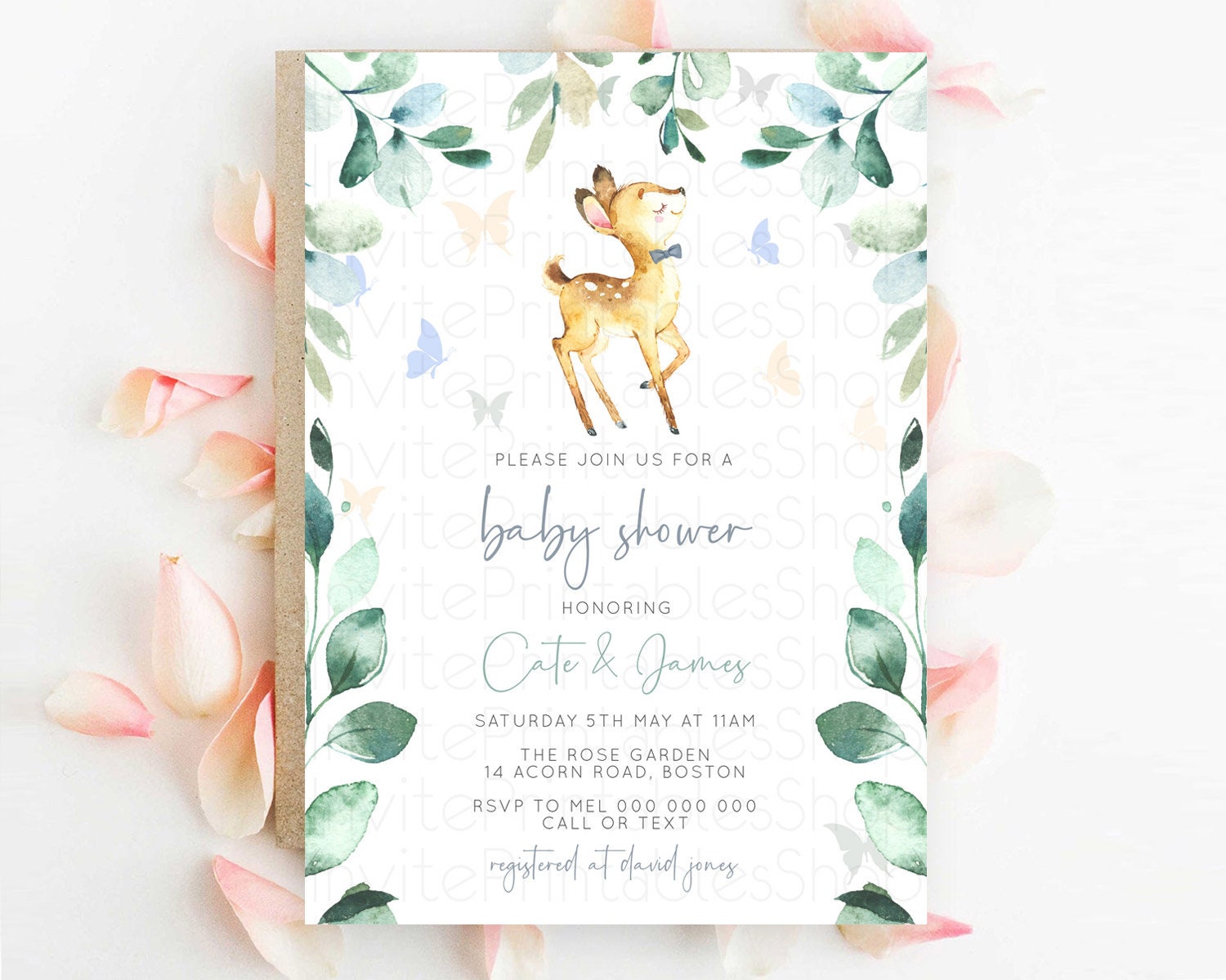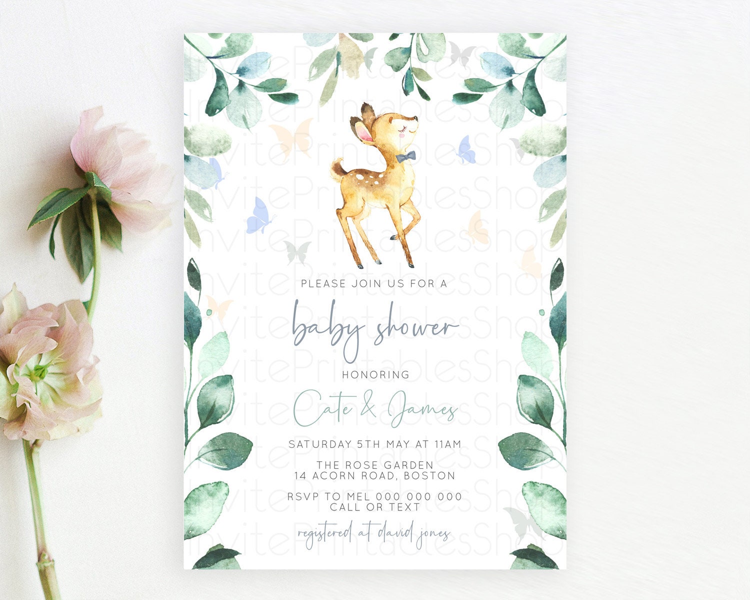 Fawn Baby Shower Invitation Deer Baby Shower Invites Enchanted Forest Theme Butterfly Pastel Flowers Whimsical Baby Shower D10767