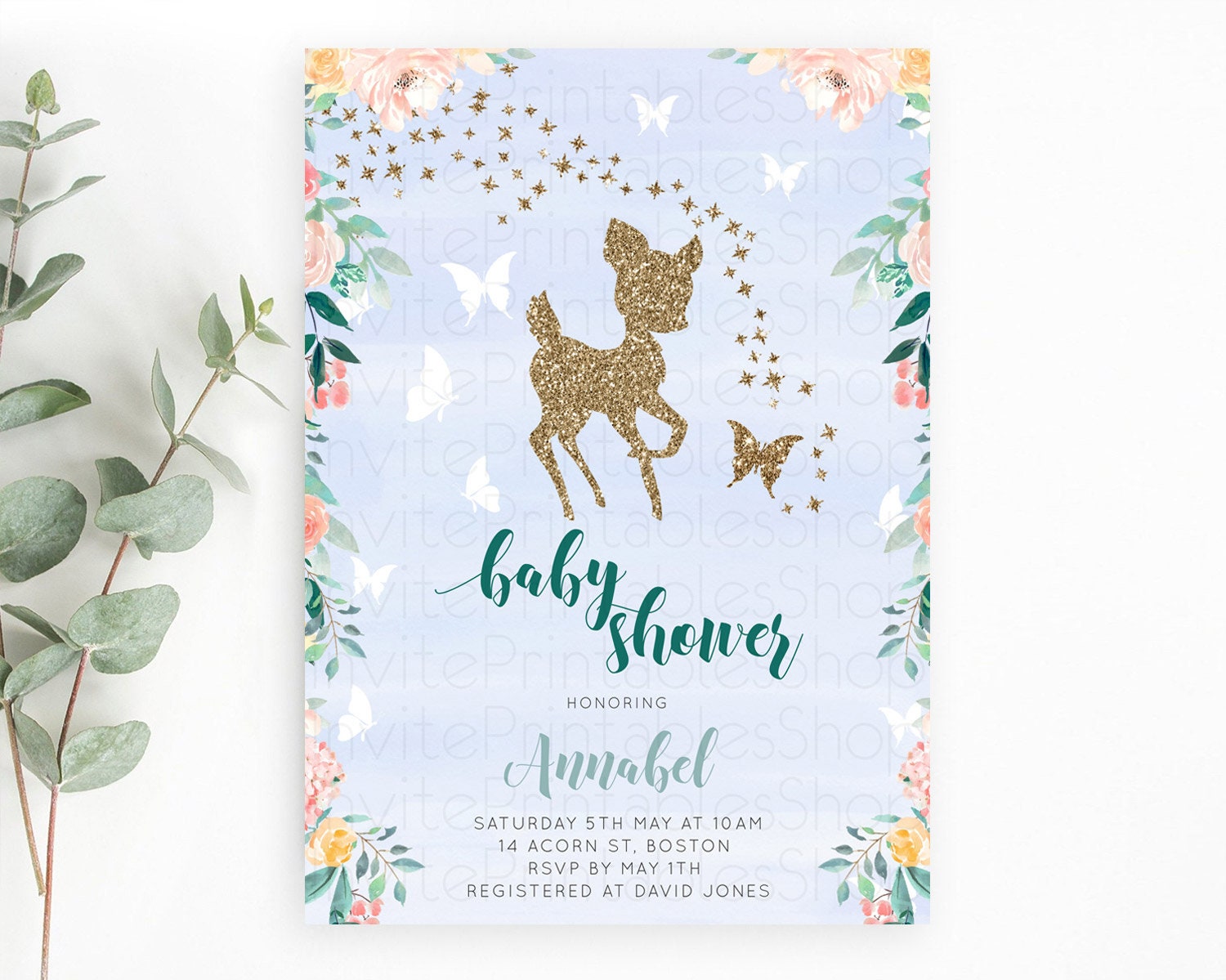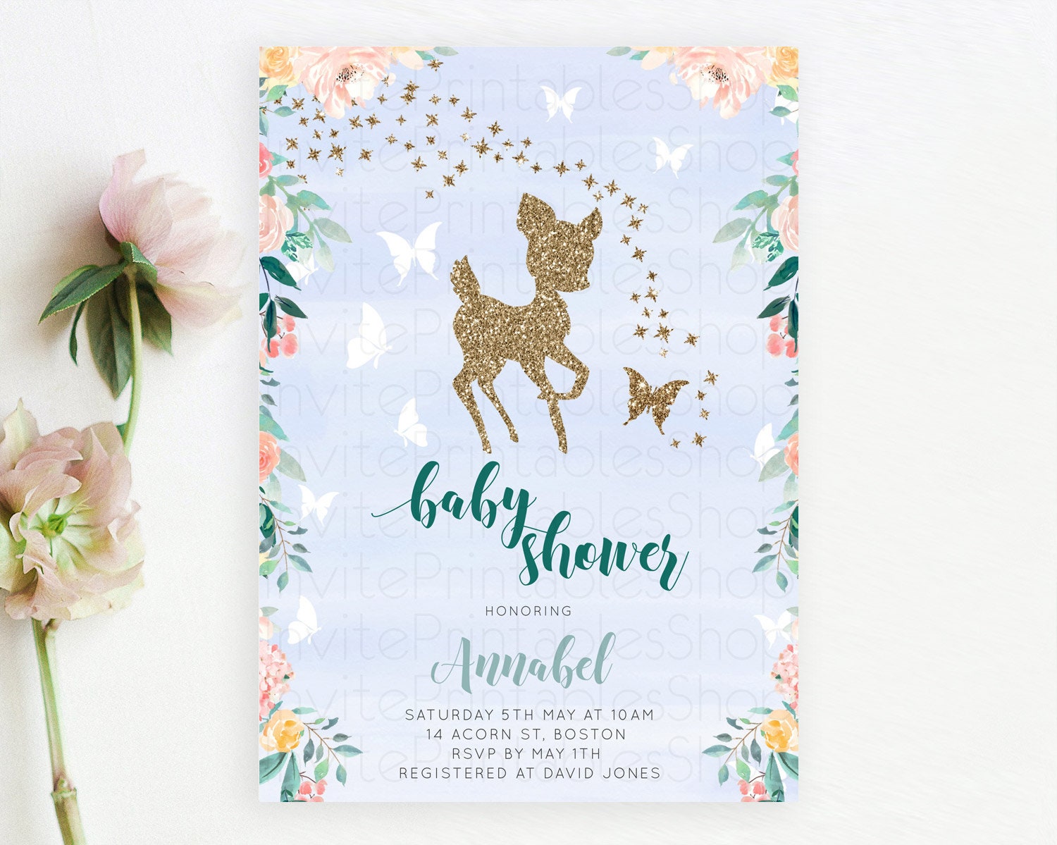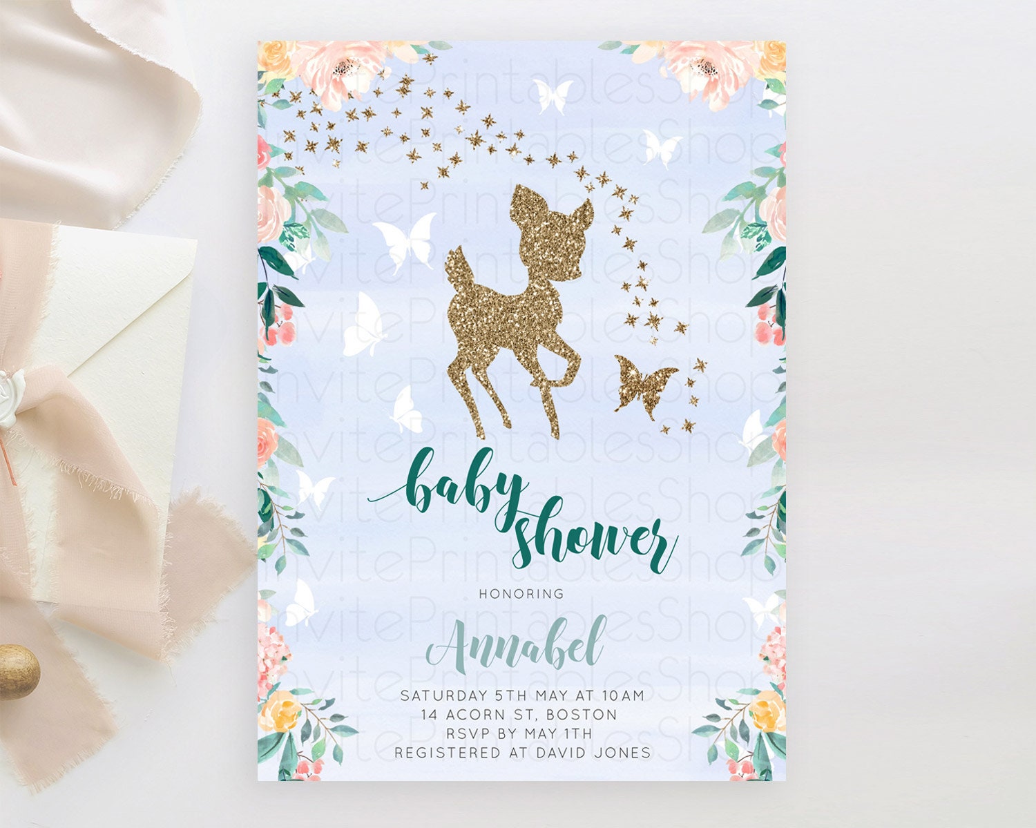 Fawn Baby Shower Invitation Deer Baby Shower Invites Enchanted Forest Theme Butterfly Pastel Flowers Whimsical Baby Shower D10875