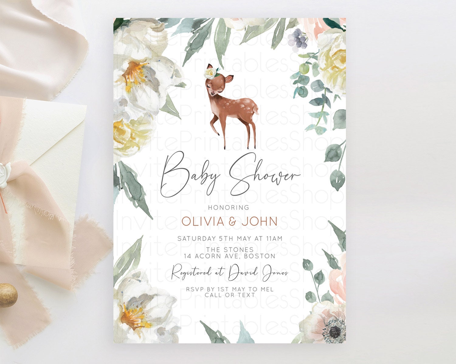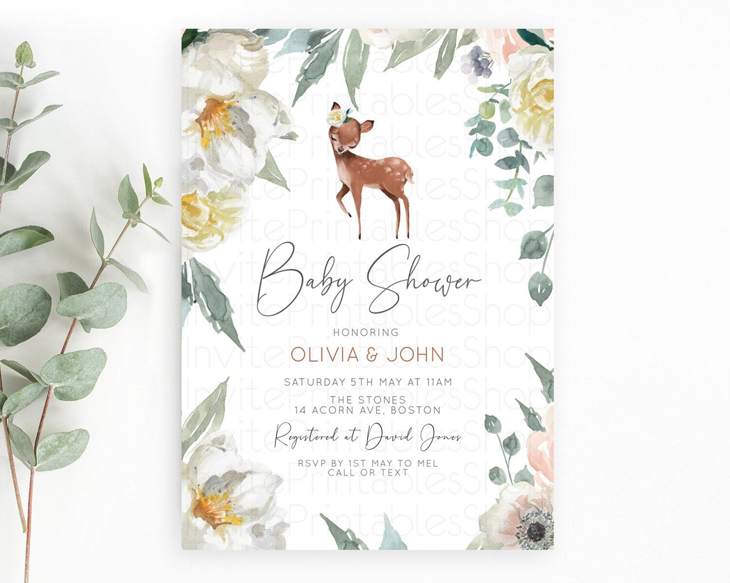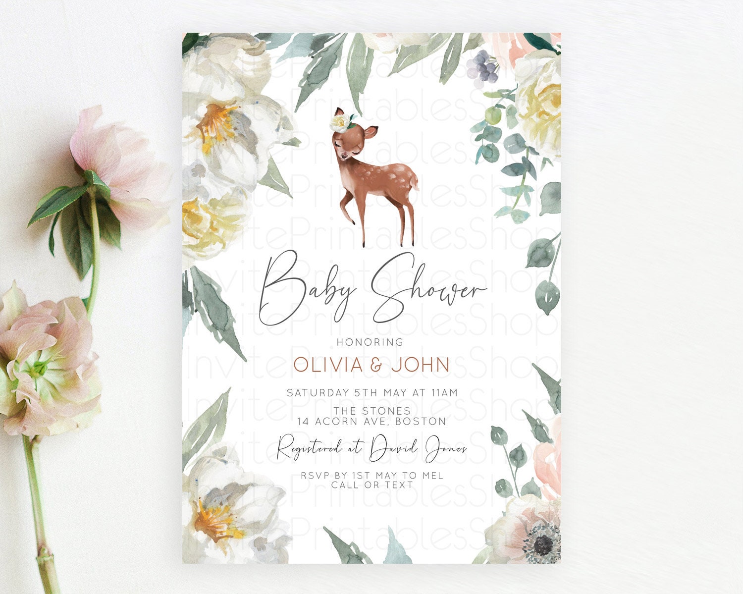 Fawn Baby Shower Invitation Deer Baby Shower Invites Enchanted Forest Theme Butterfly Pastel Flowers Whimsical Baby Shower D11030