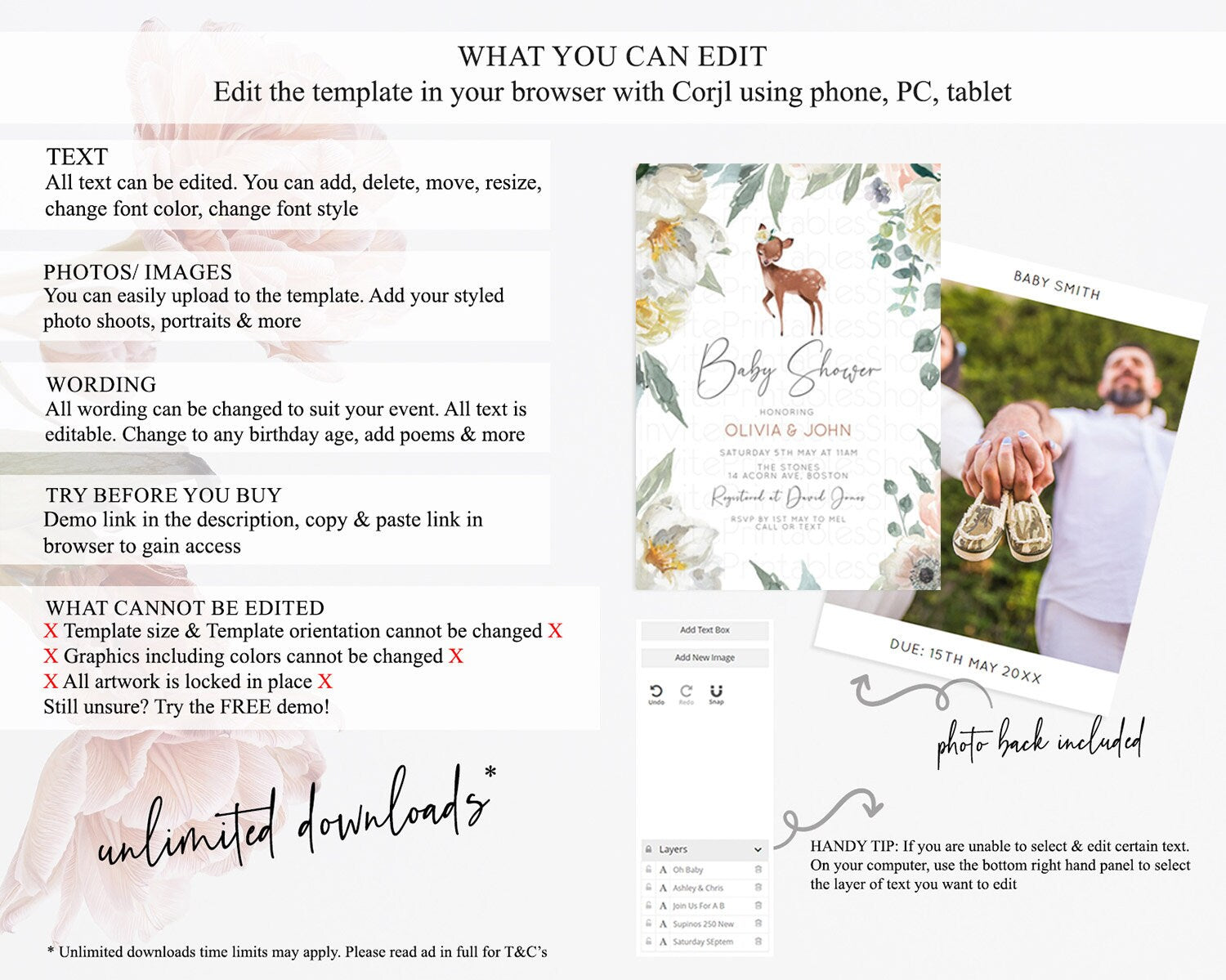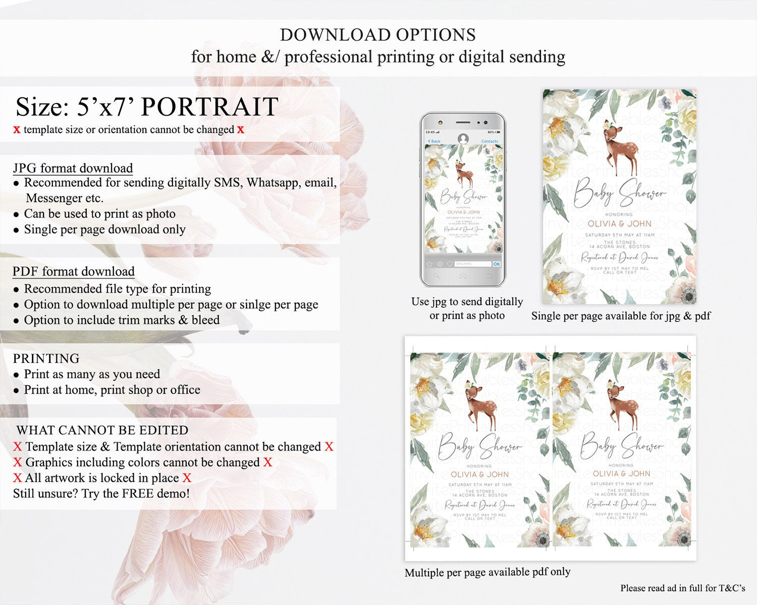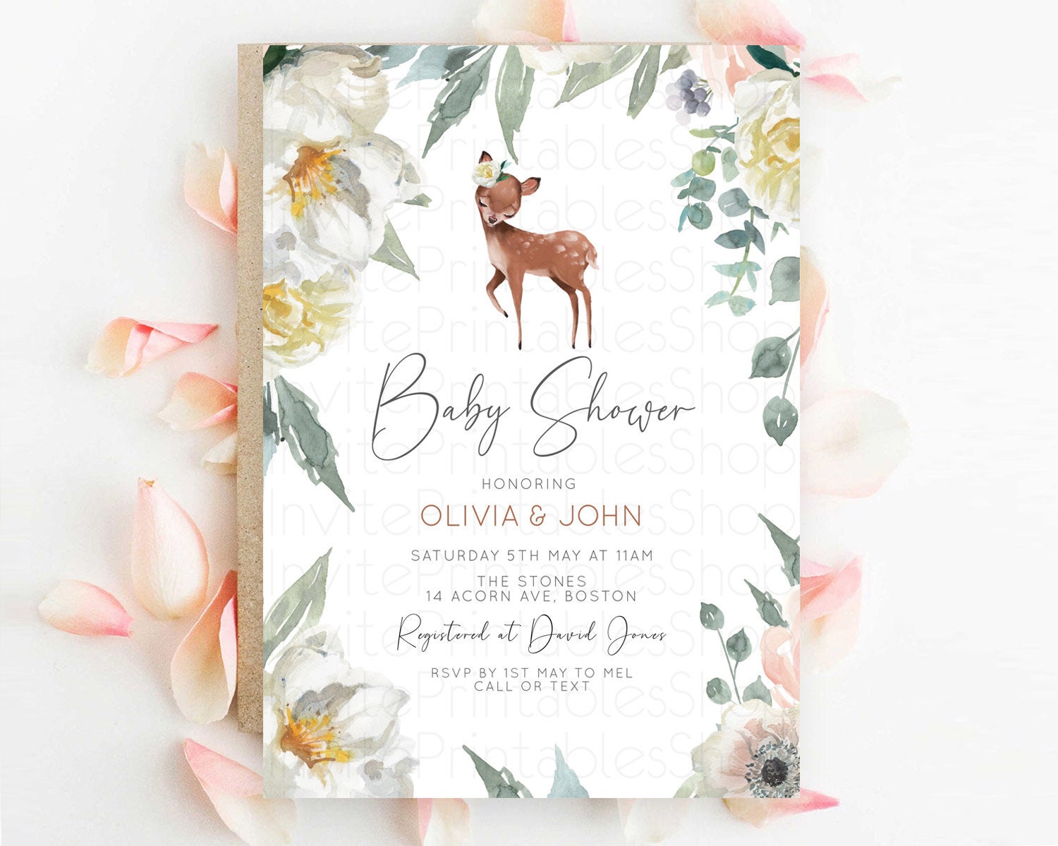 Fawn Baby Shower Invitation Deer Baby Shower Invites Enchanted Forest Theme Butterfly Pastel Flowers Whimsical Baby Shower D11030