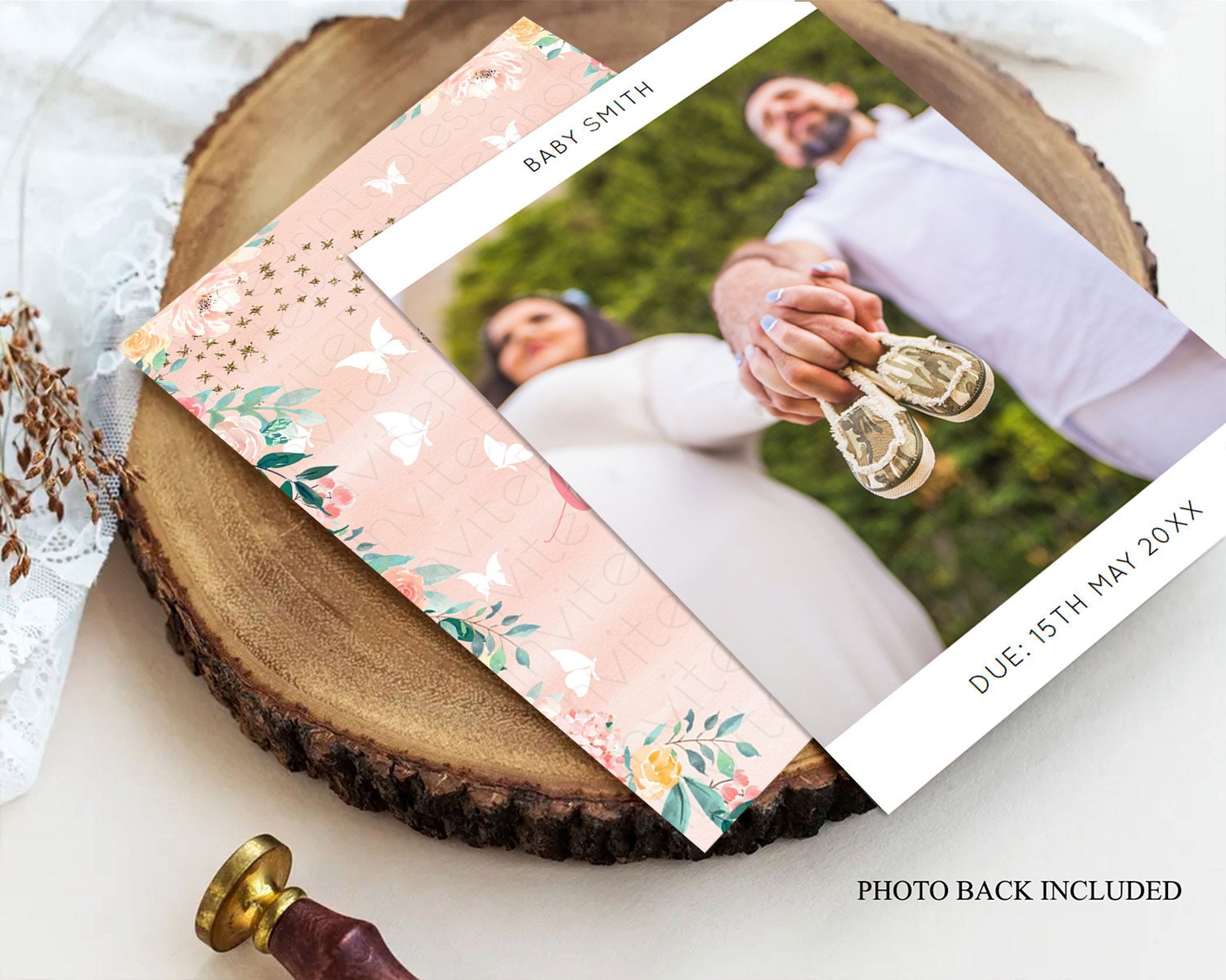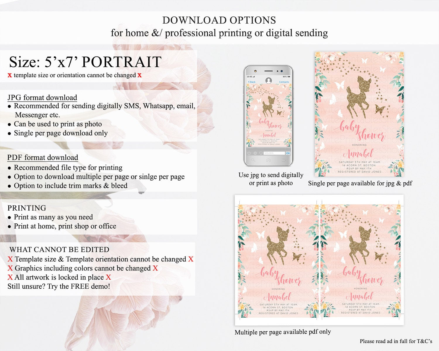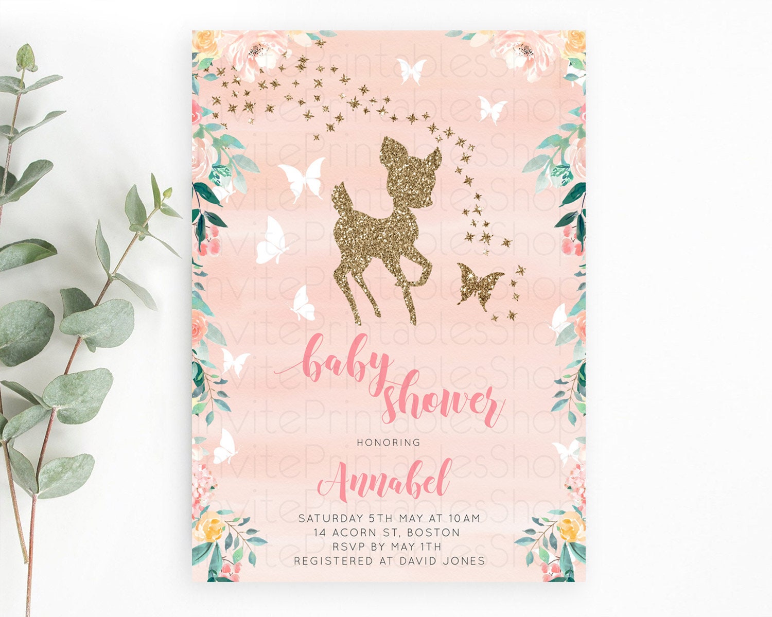 Fawn Baby Shower Invitation, Enchanted Forest, Deer, Whimsical Butterfly, Pastel Flowers, Orange Watercolor, Glitter, Magical Accents D10873