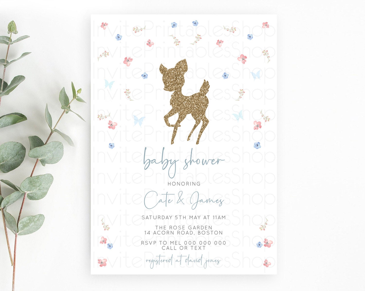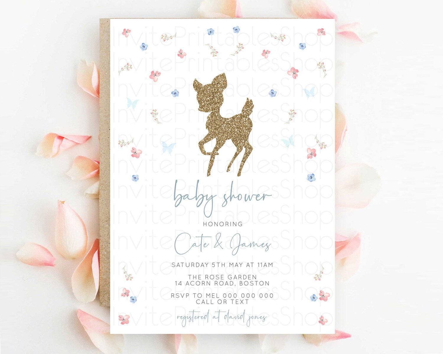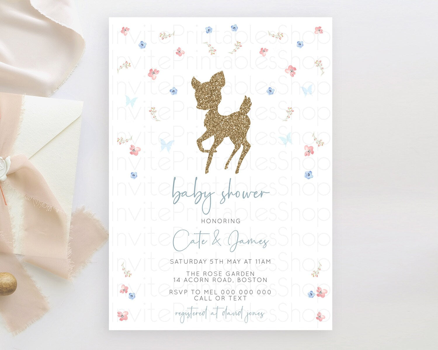 Fawn Baby Shower Invitation: Enchanted Forest Theme with Butterflies and Pastel Blue Pink Flowers - Whimsical Woodland Gender Reveal D10359