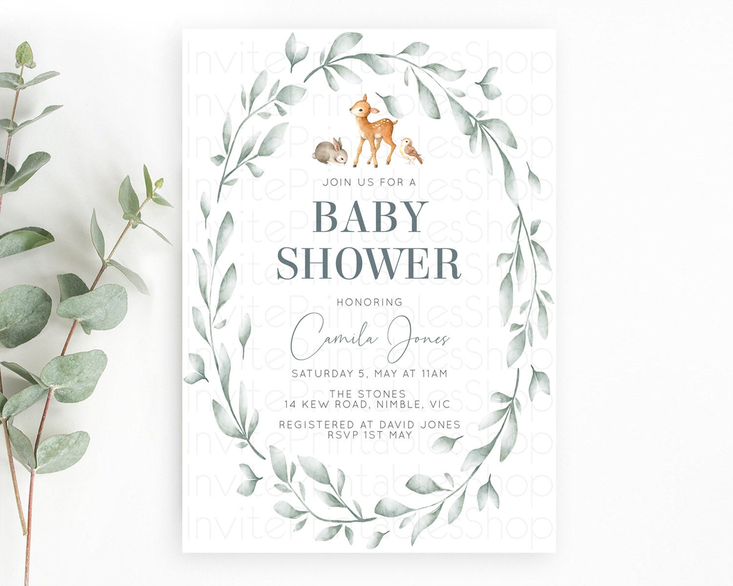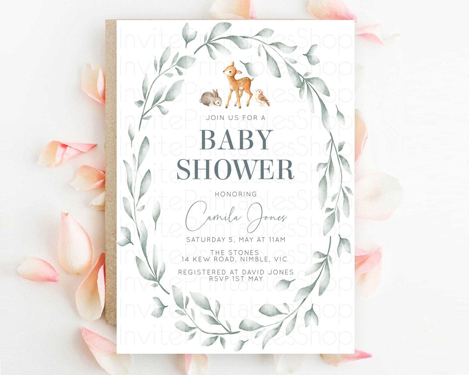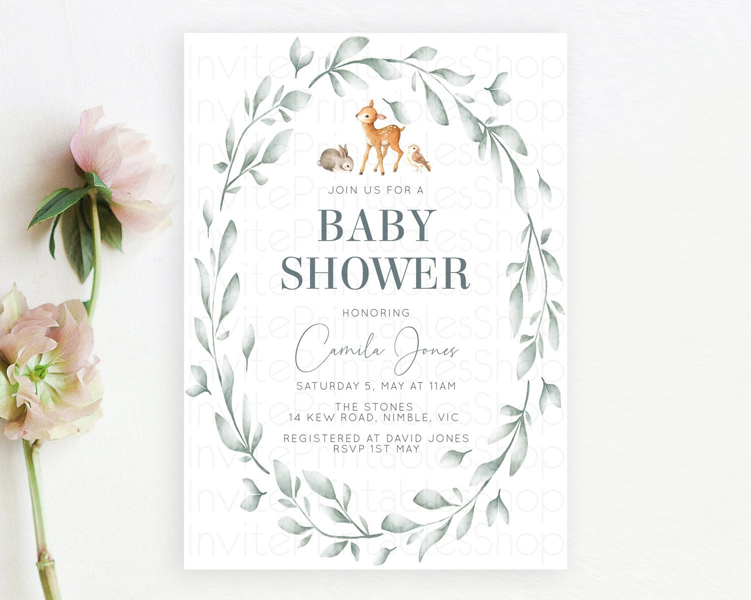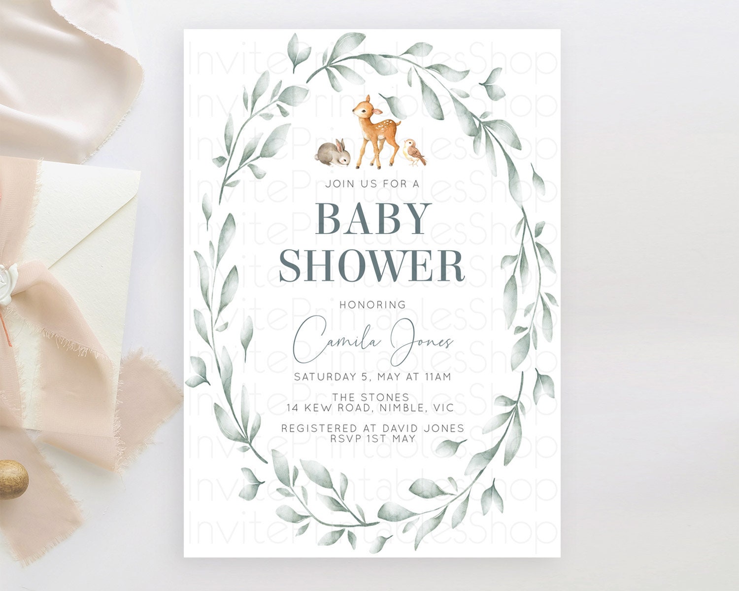 Fawn Baby Shower Invitation, Enchanted Forest, Whimsical Deer, Cute Bunny And Bird, Woodland, Leafy Crown, Organic Green Tone D10872