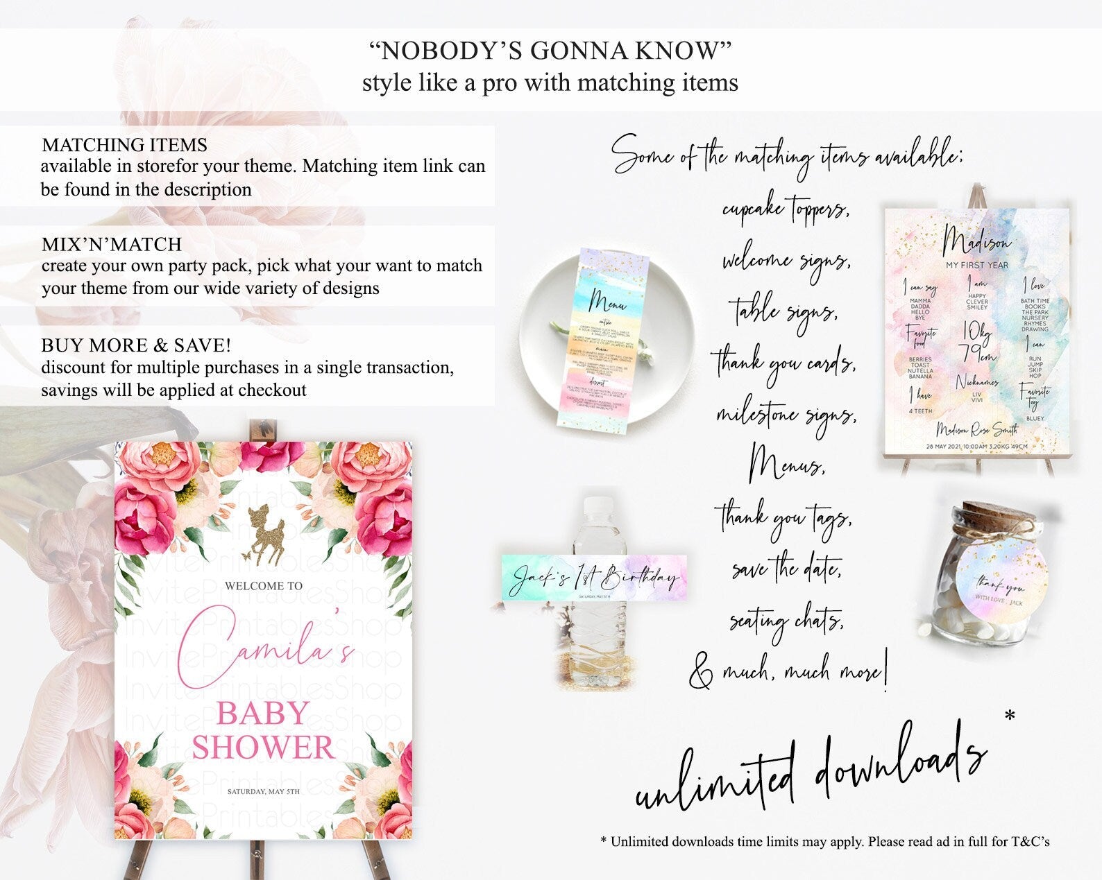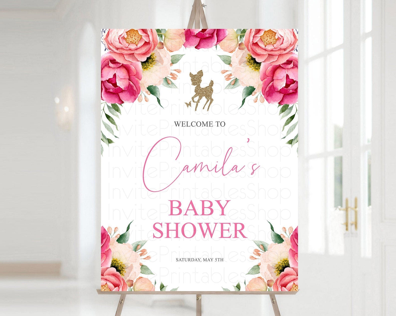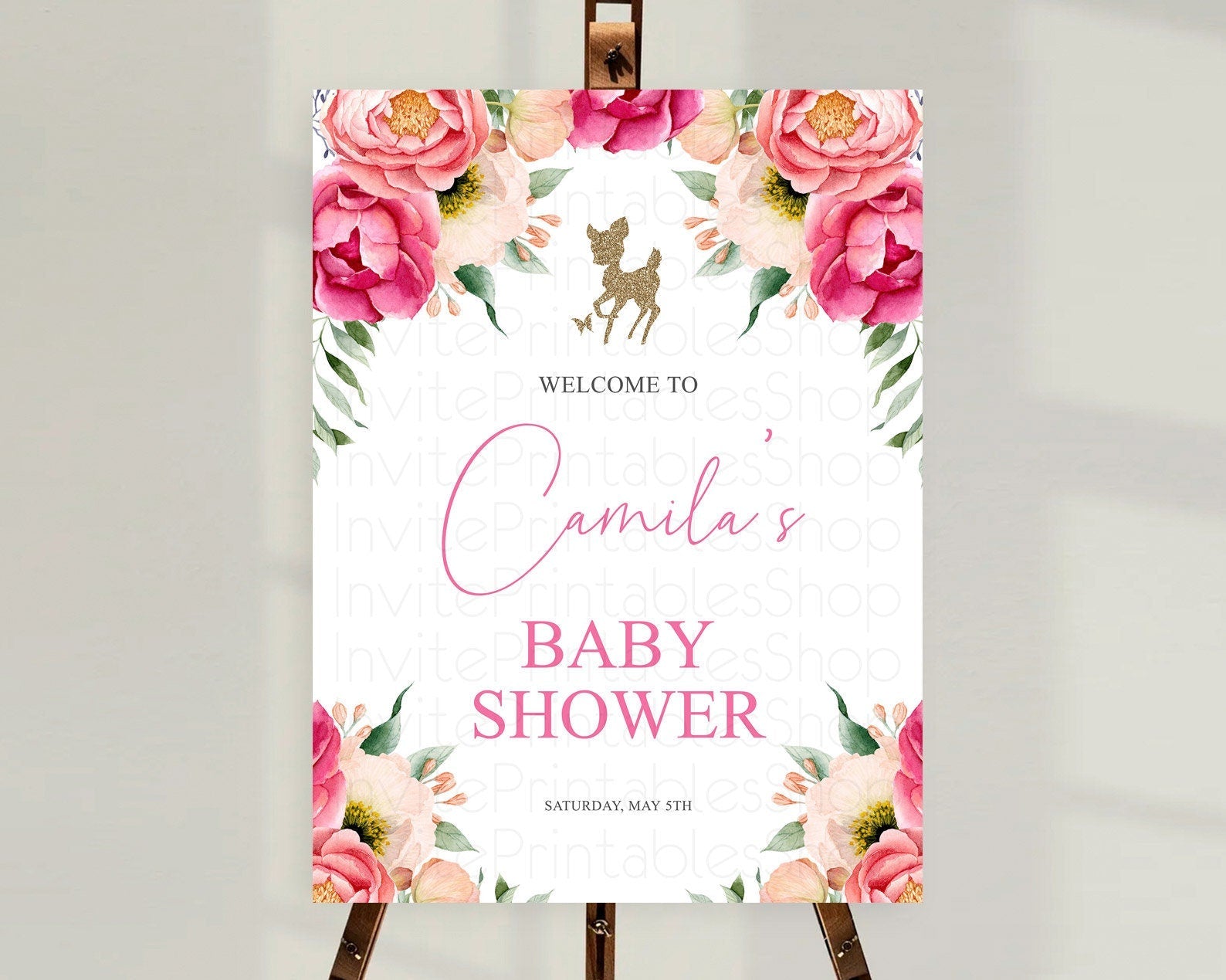 Fawn Baby Shower Welcome Sign Deer Welcome Board Floral Deer Welcome Poster Enchanted Forest Butterfly Pastel Floral Welcome Sign D10326