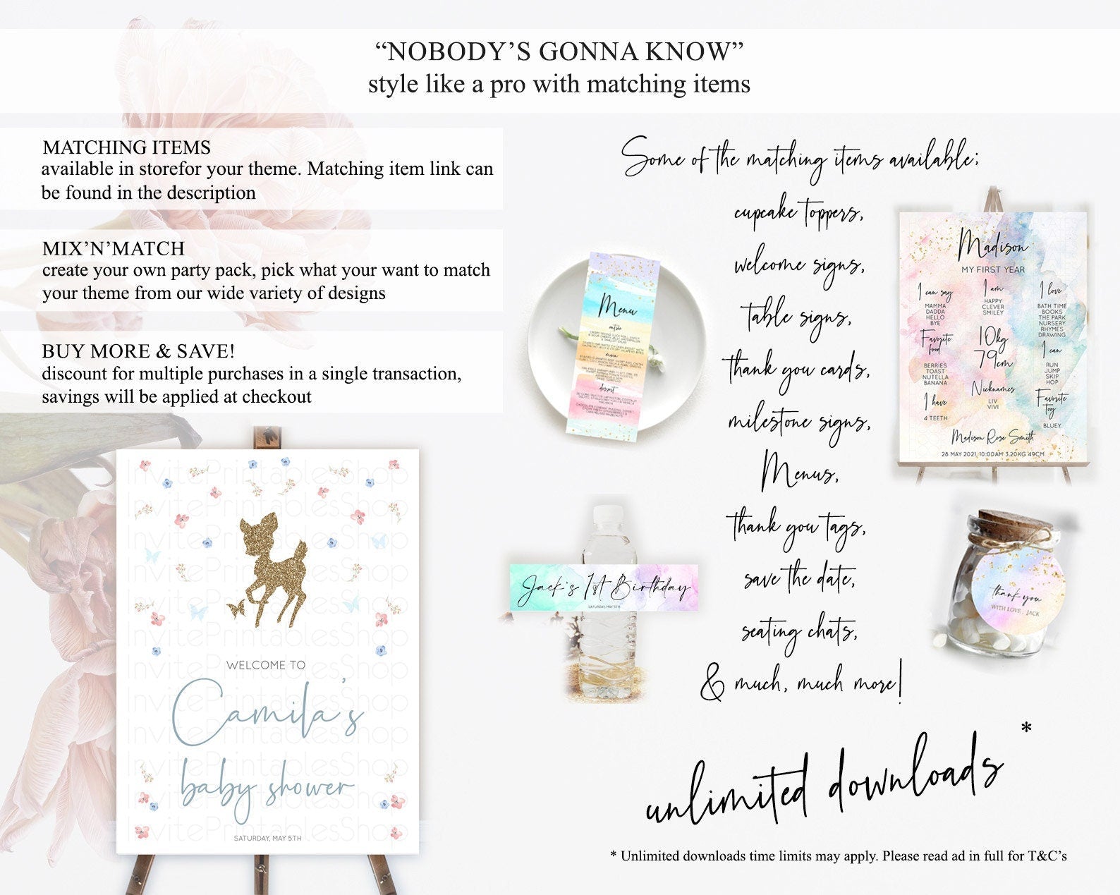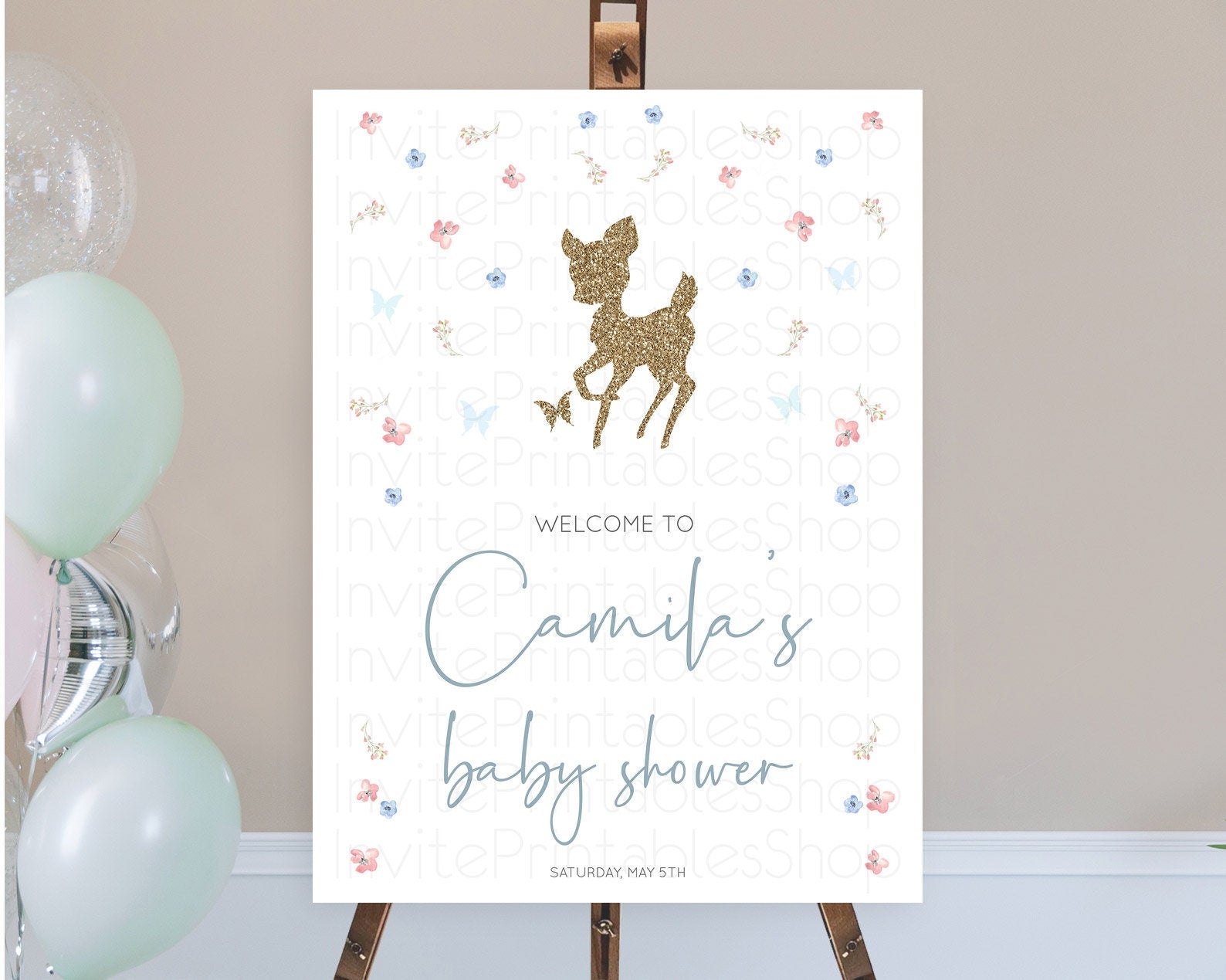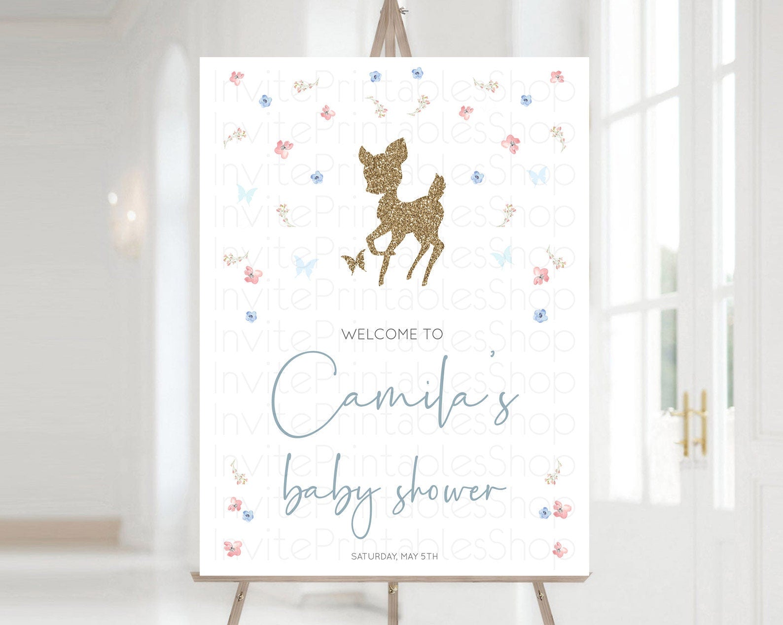 Fawn Baby Shower Welcome Sign Deer Welcome Board Floral Deer Welcome Poster Enchanted Forest Butterfly Pastel Floral Welcome Sign D10359