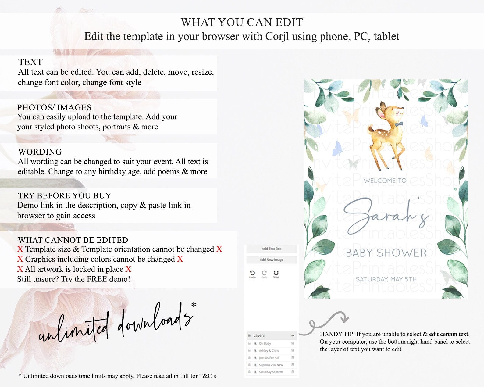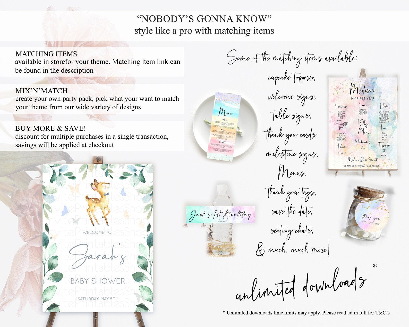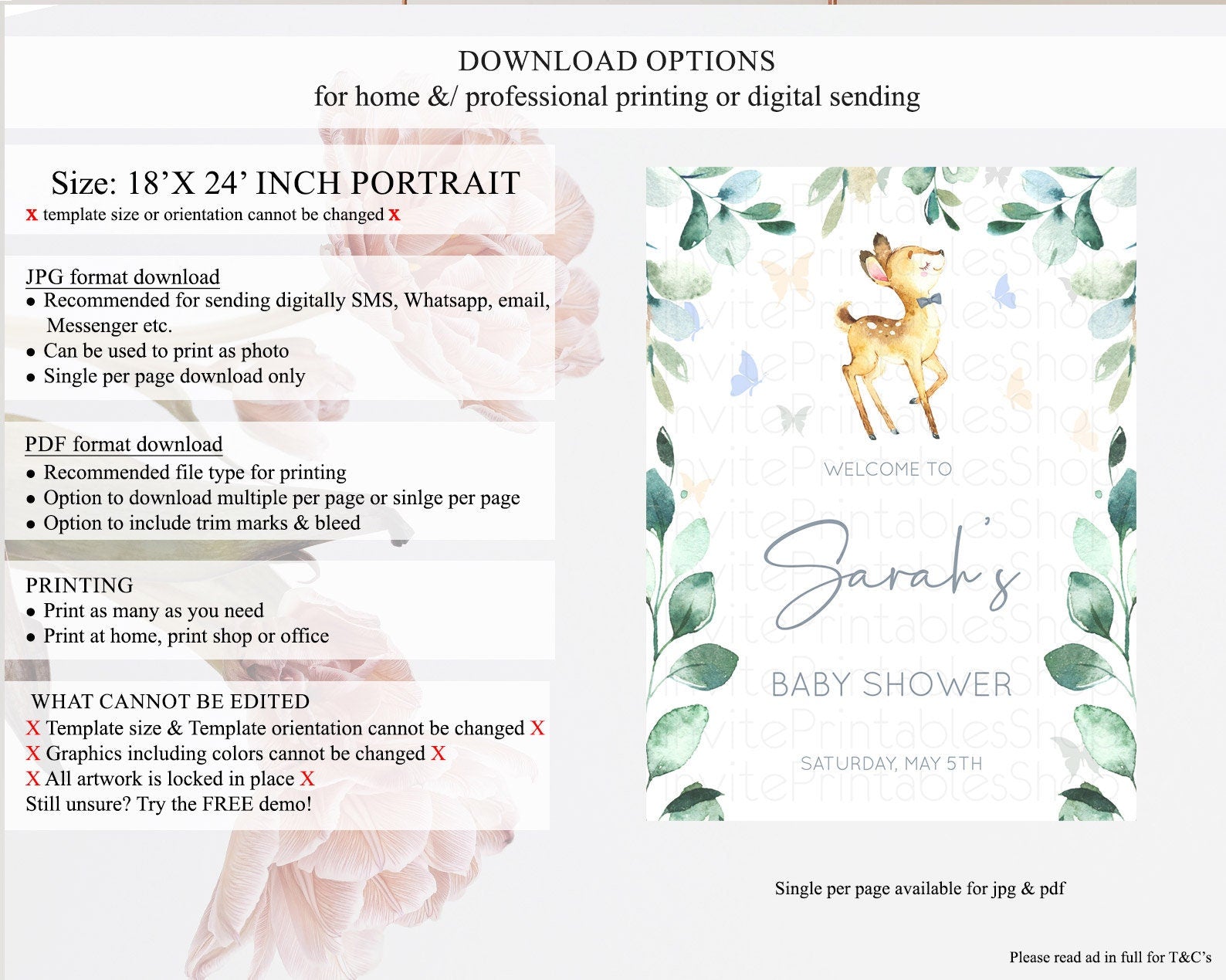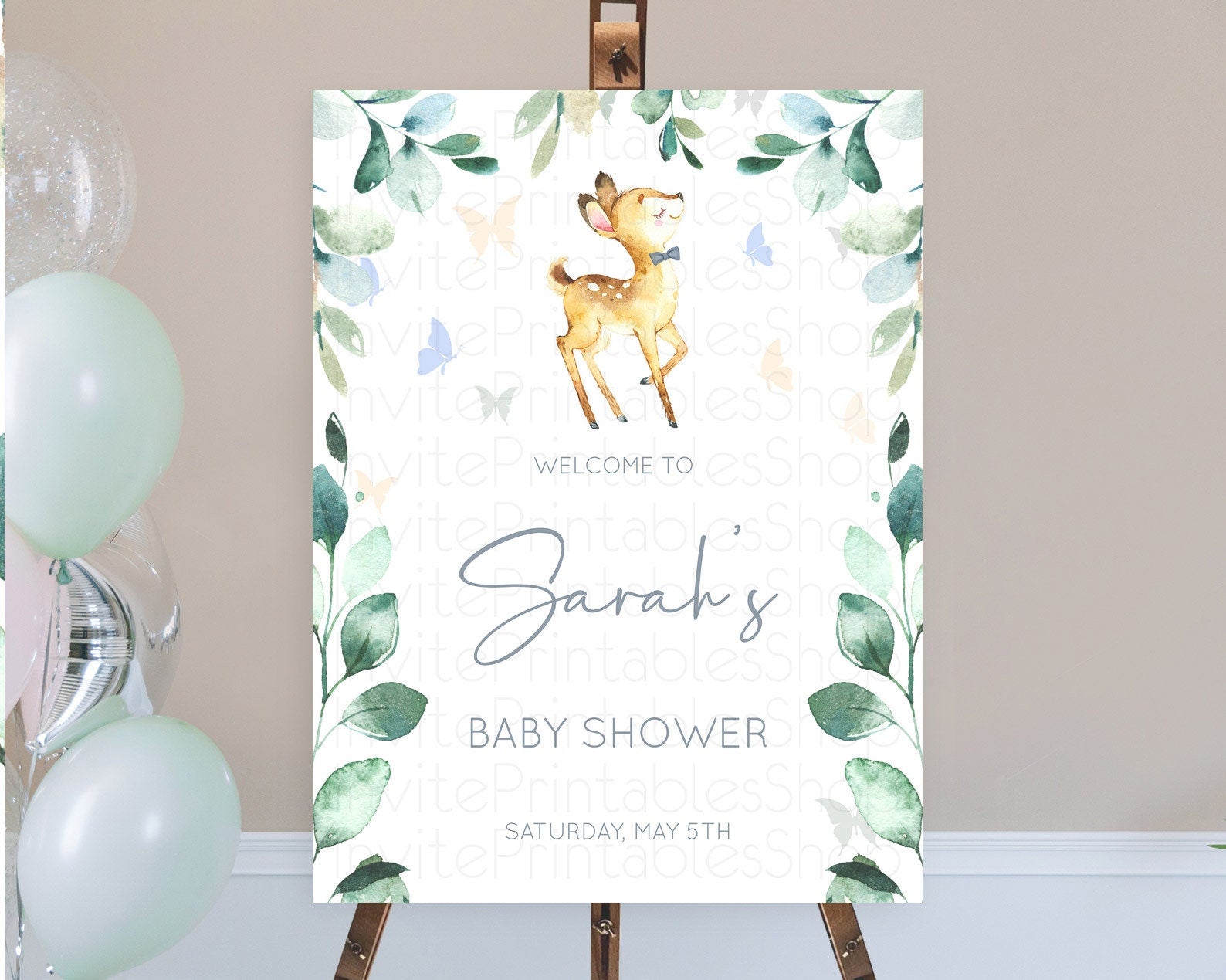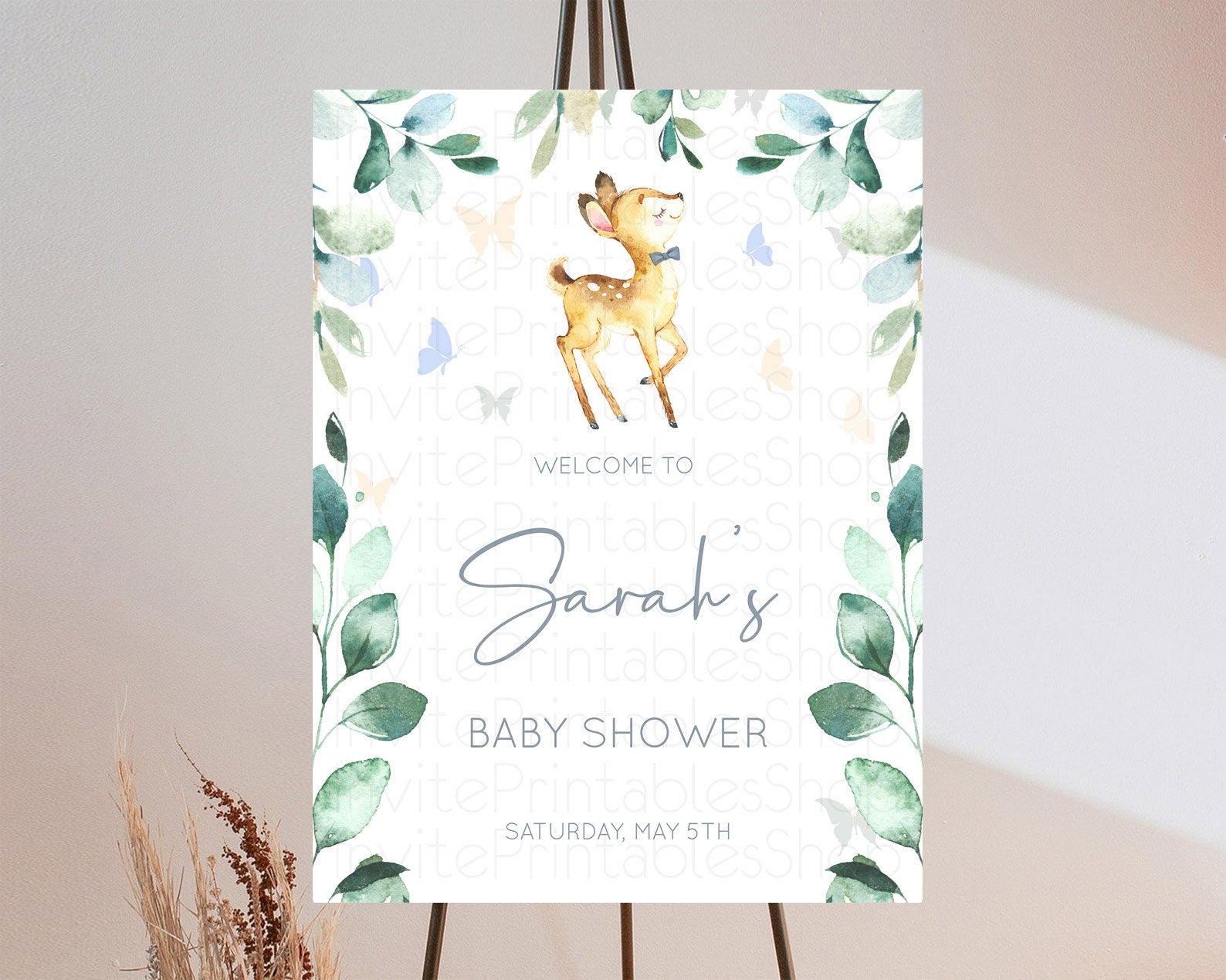 Fawn Baby Shower Welcome Sign Deer Welcome Board Floral Deer Welcome Poster Enchanted Forest Butterfly Pastel Floral Welcome Sign D10767