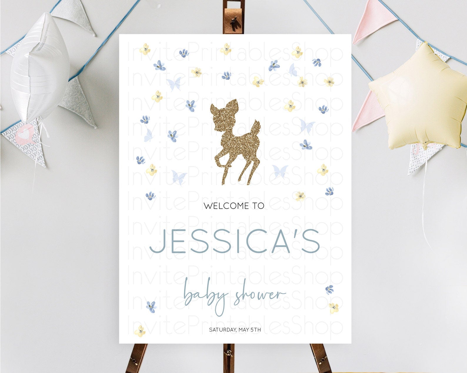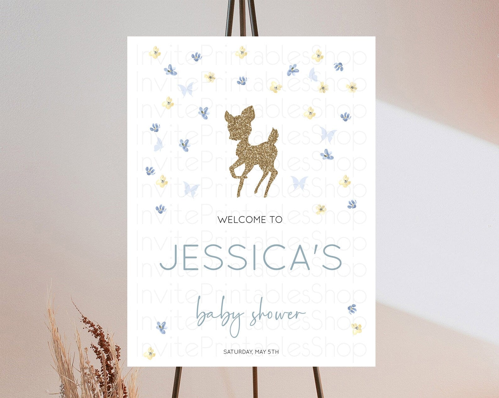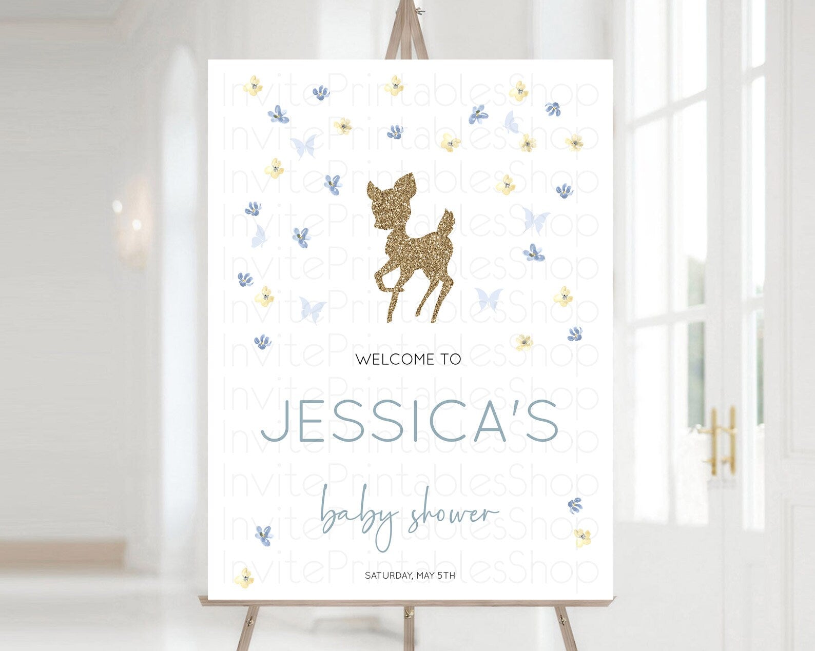 Fawn Baby Shower Welcome Sign Deer Welcome Board Floral Deer Welcome Poster Enchanted Forest Butterfly Pastel Floral Welcome Sign D10864