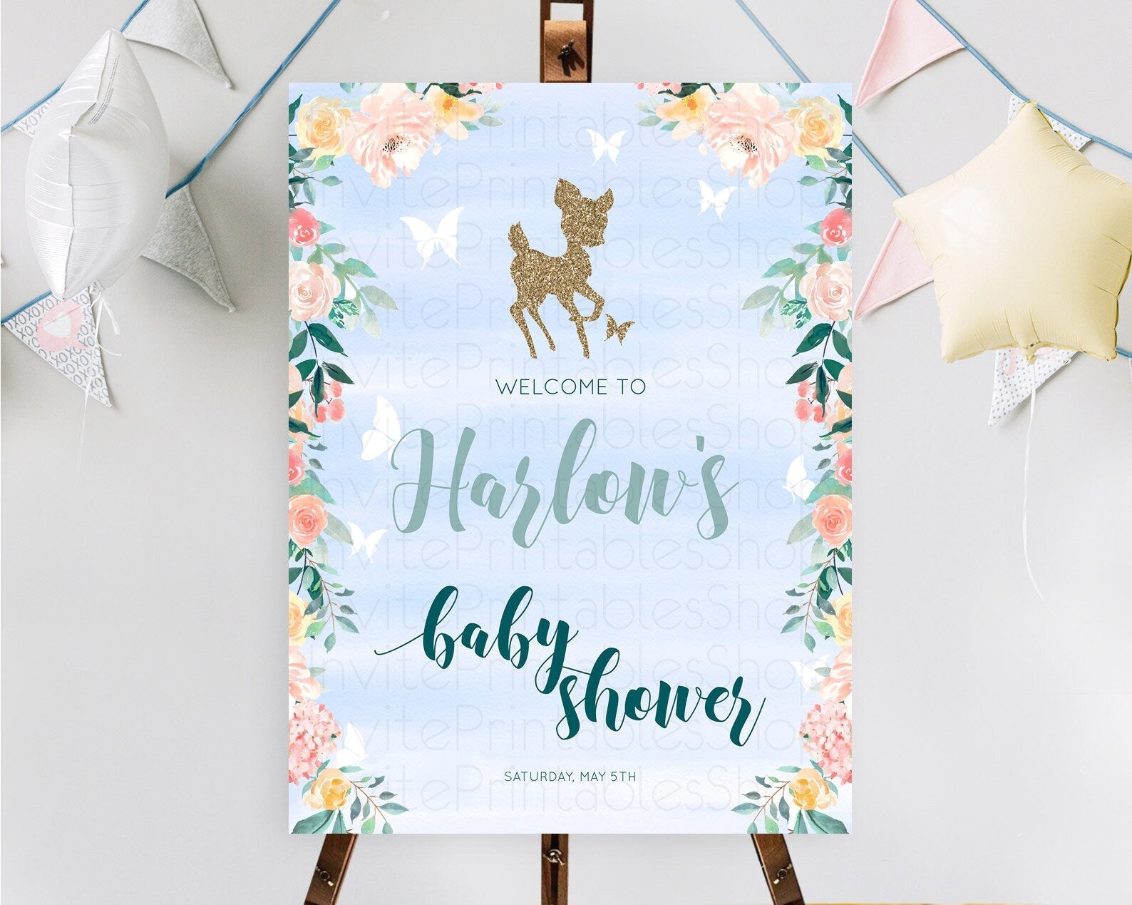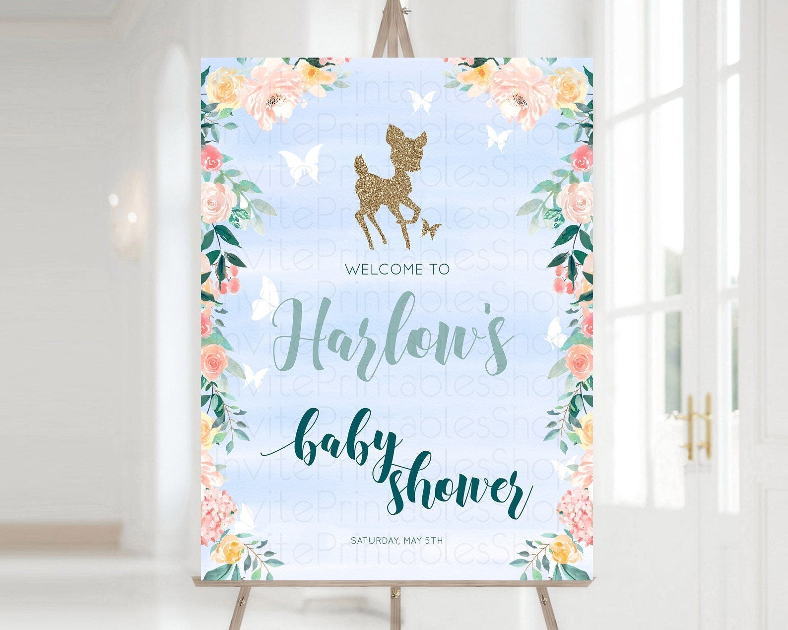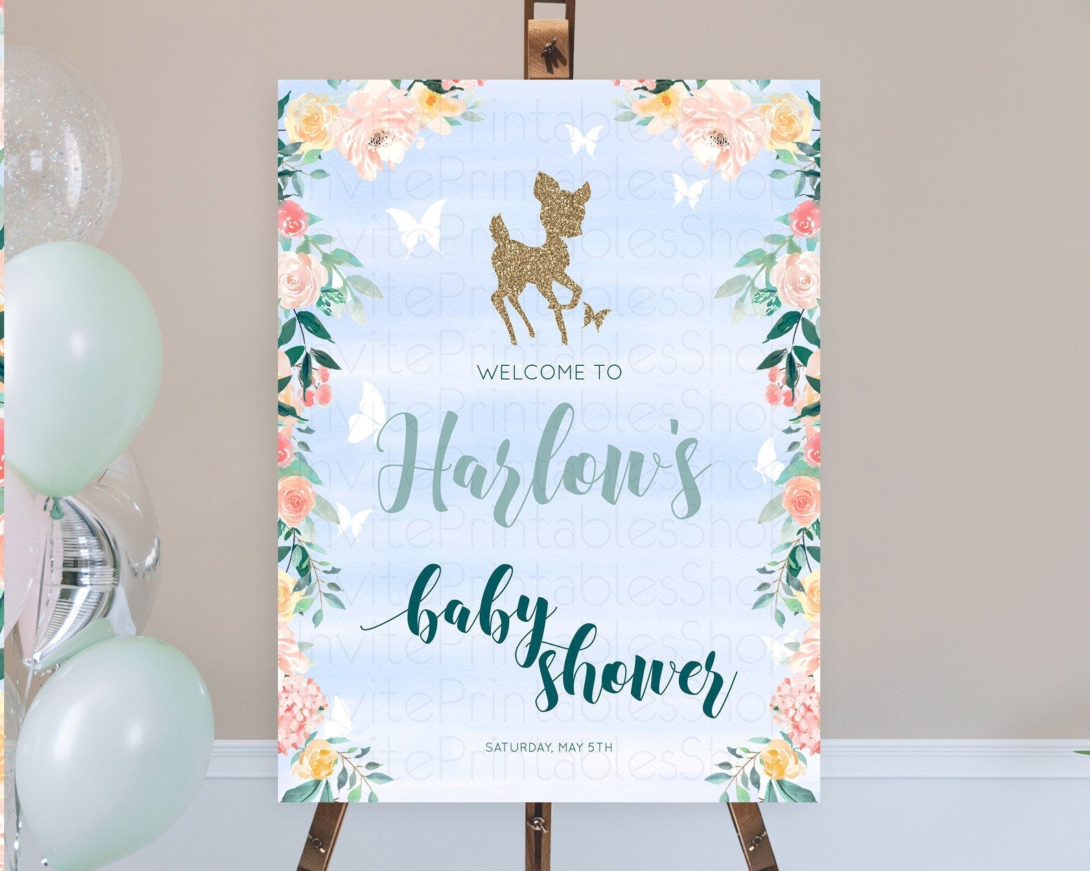 Fawn Baby Shower Welcome Sign Deer Welcome Board Floral Deer Welcome Poster Enchanted Forest Butterfly Pastel Floral Welcome Sign D10875