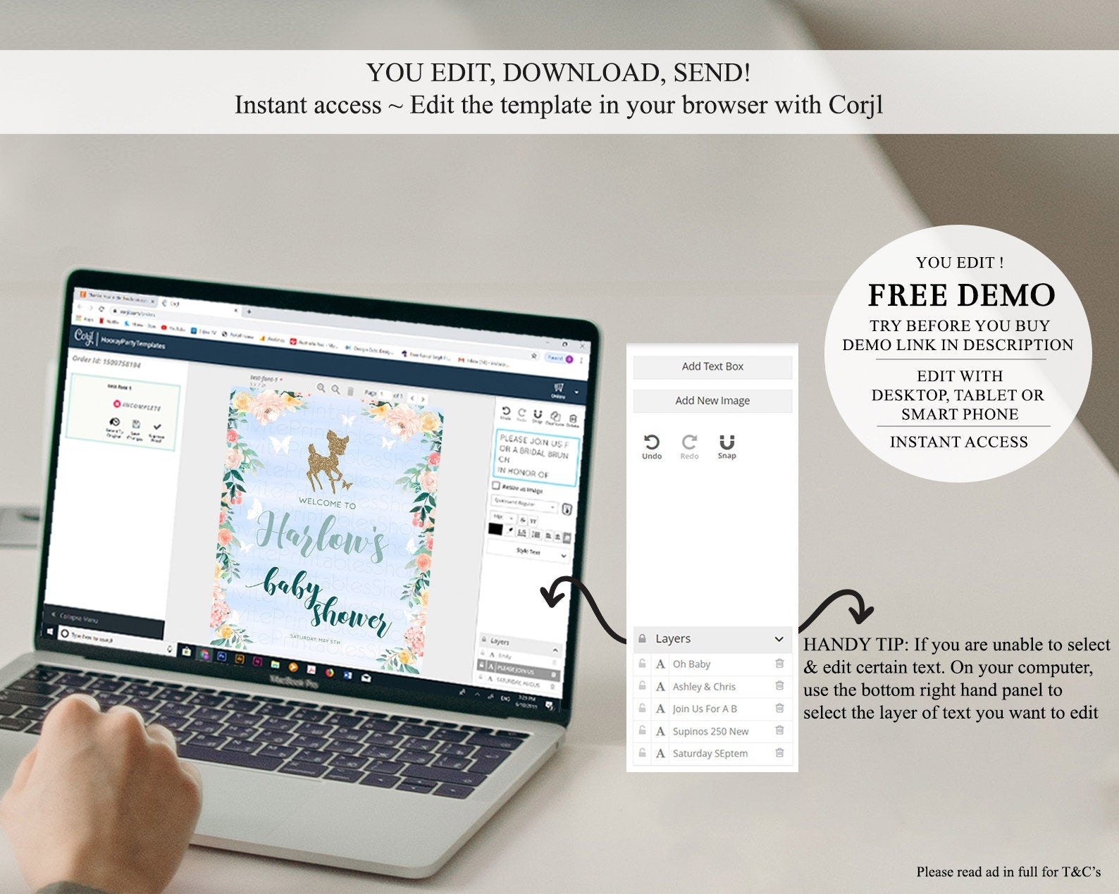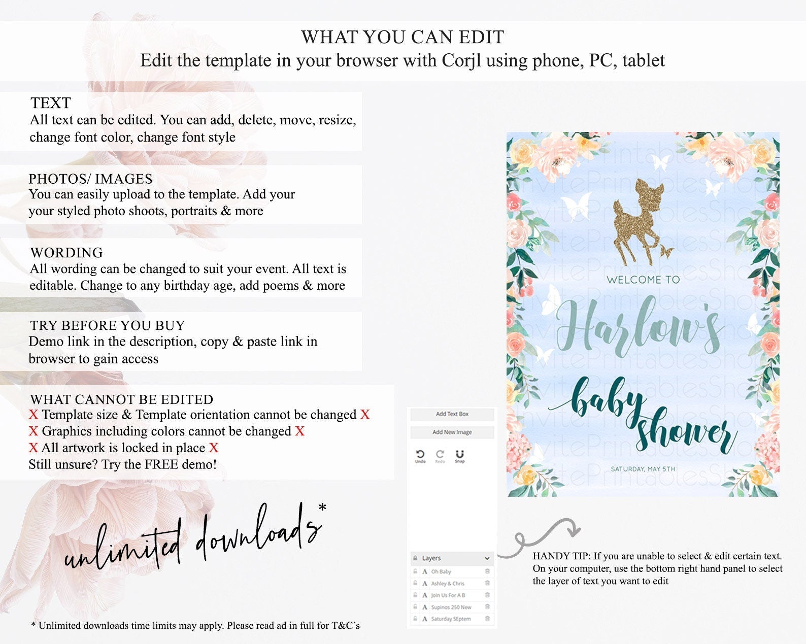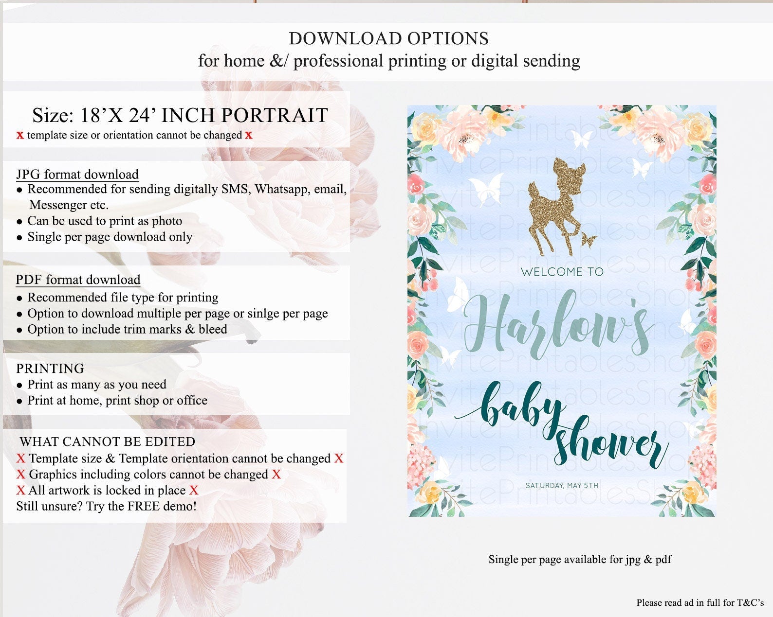 Fawn Baby Shower Welcome Sign Deer Welcome Board Floral Deer Welcome Poster Enchanted Forest Butterfly Pastel Floral Welcome Sign D10875