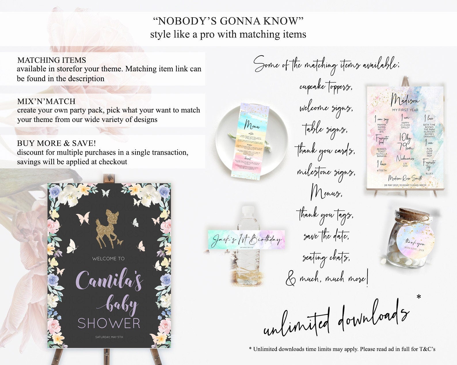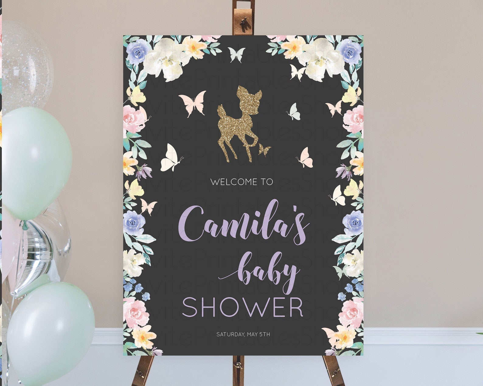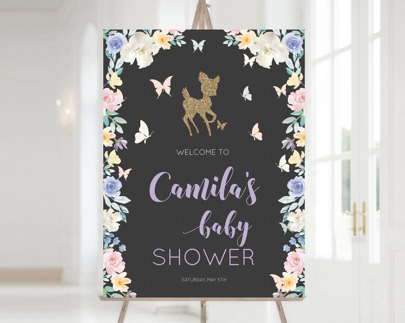 Fawn Baby Shower Welcome Sign Deer Welcome Board Floral Deer Welcome Poster Enchanted Forest Butterfly Pastel Floral Welcome Sign D10880