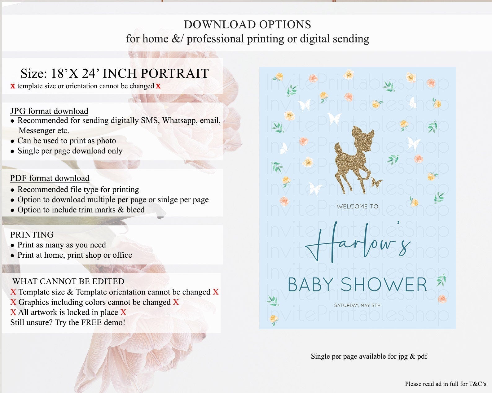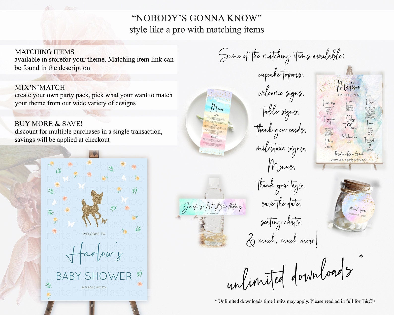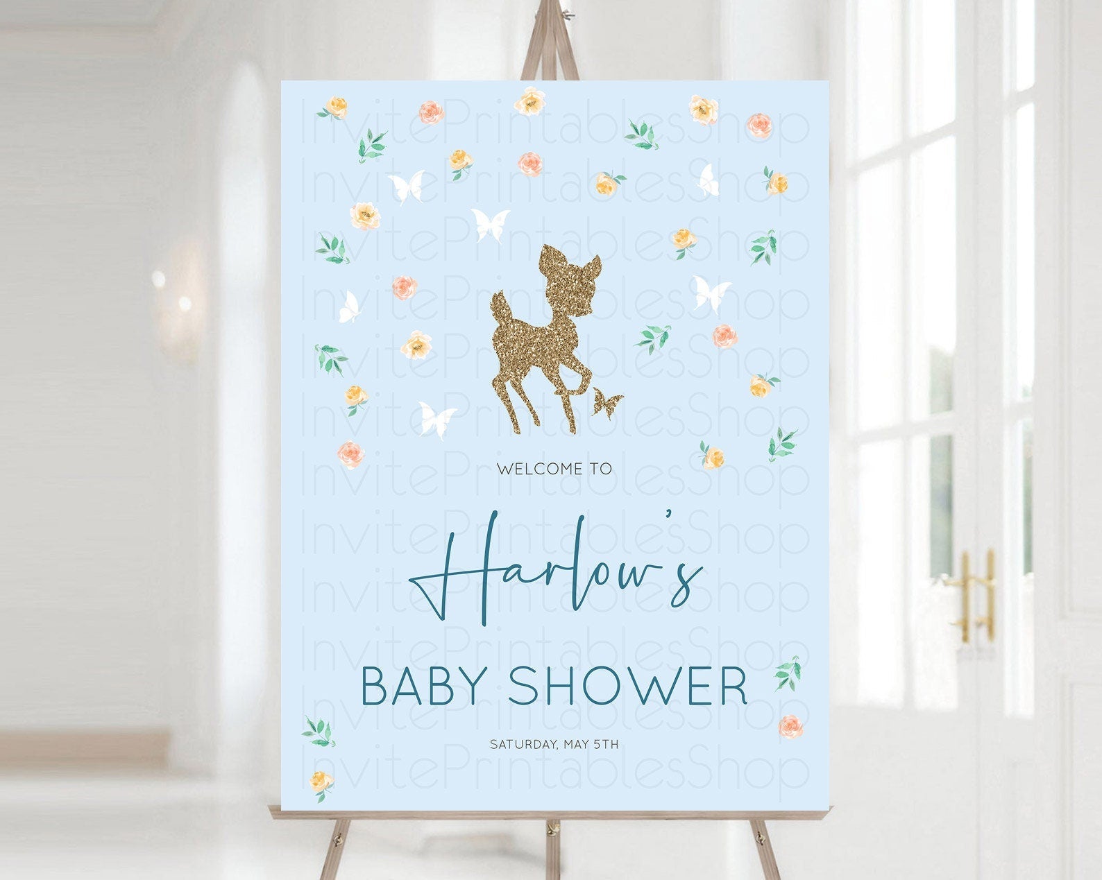 Fawn Baby Shower Welcome Sign Deer Welcome Board Floral Deer Welcome Poster Enchanted Forest Butterfly Pastel Floral Welcome Sign D10902