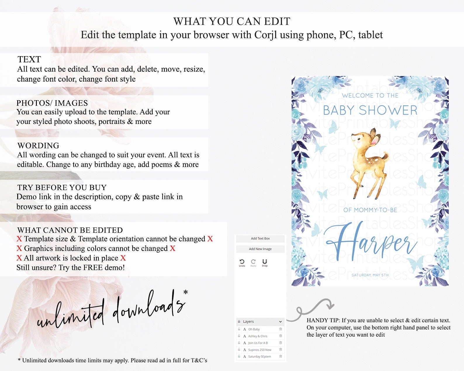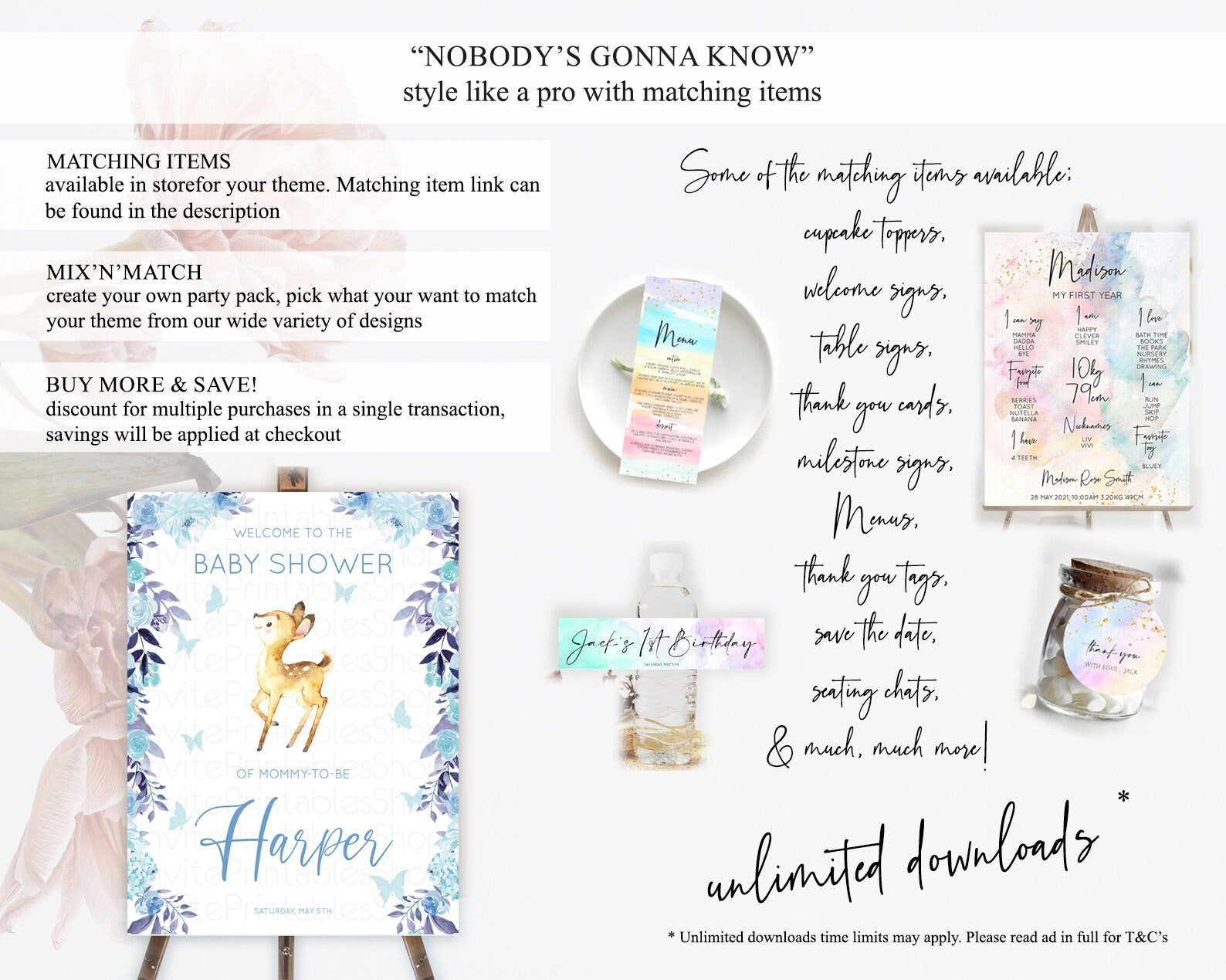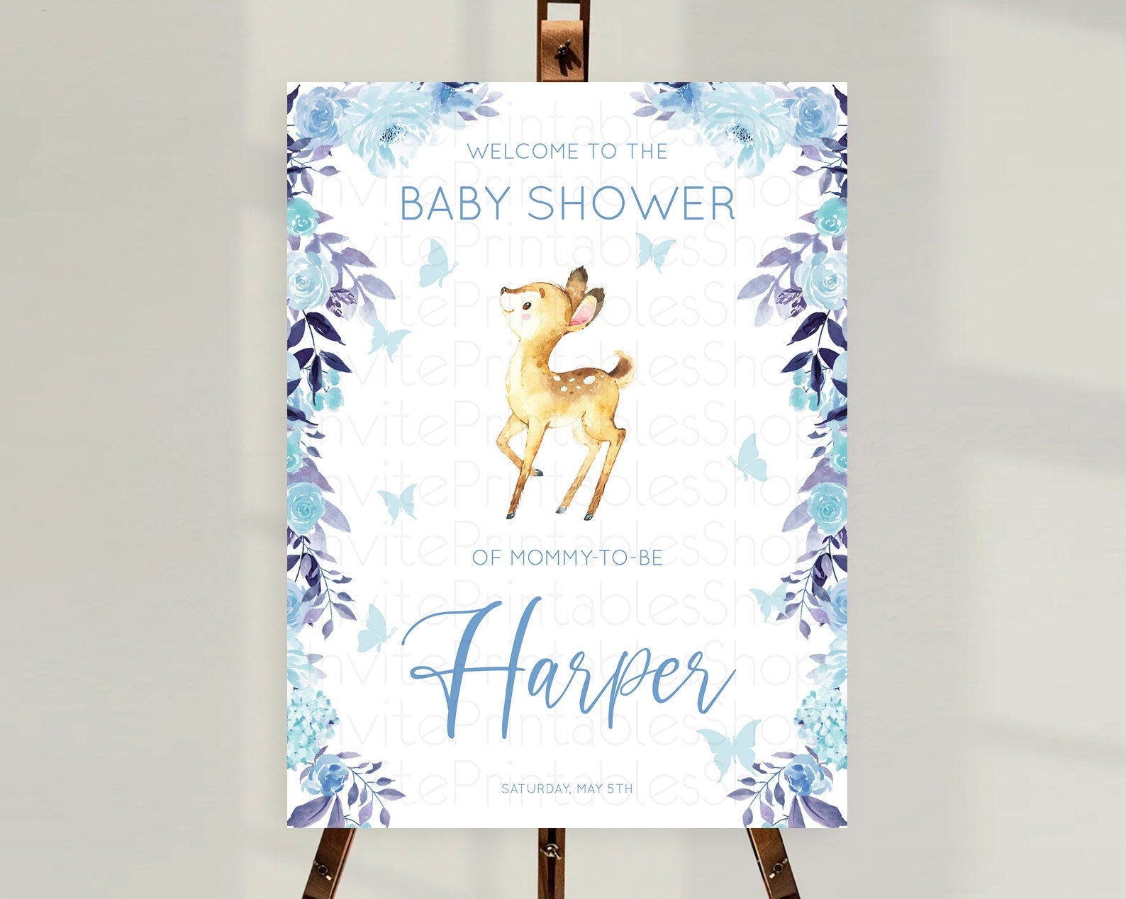 Fawn Baby Shower Welcome Sign Deer Welcome Board Floral Deer Welcome Poster Enchanted Forest Butterfly Pastel Floral Welcome Sign D10917