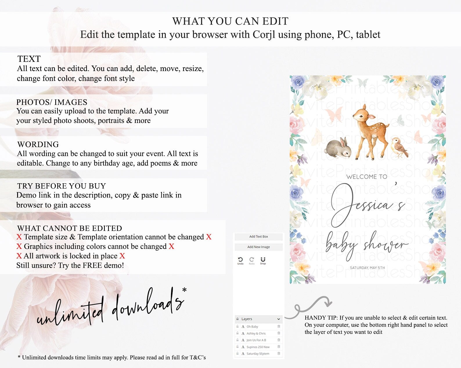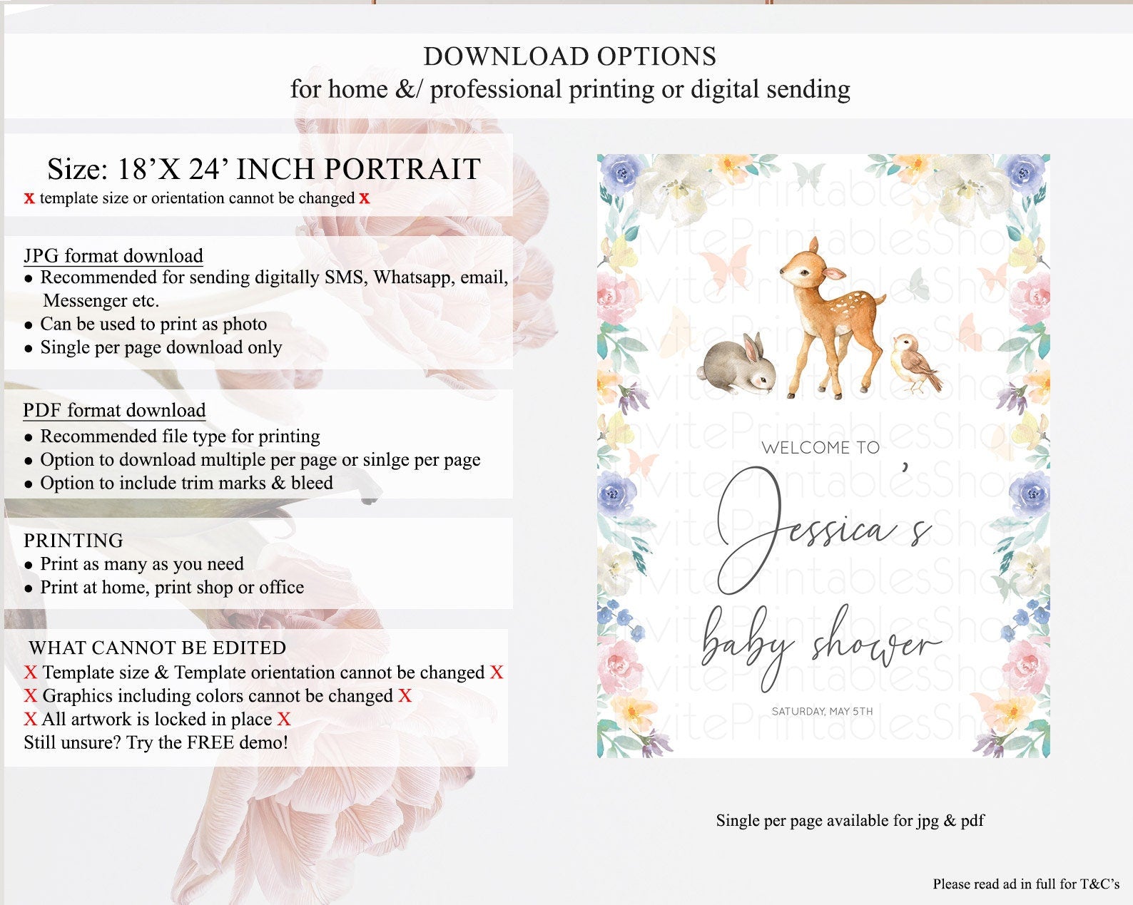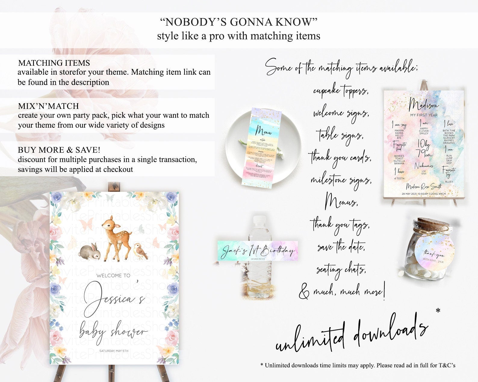 Fawn Baby Shower Welcome Sign Deer Welcome Board Floral Deer Welcome Poster Enchanted Forest Butterfly Pastel Floral Welcome Sign D10930