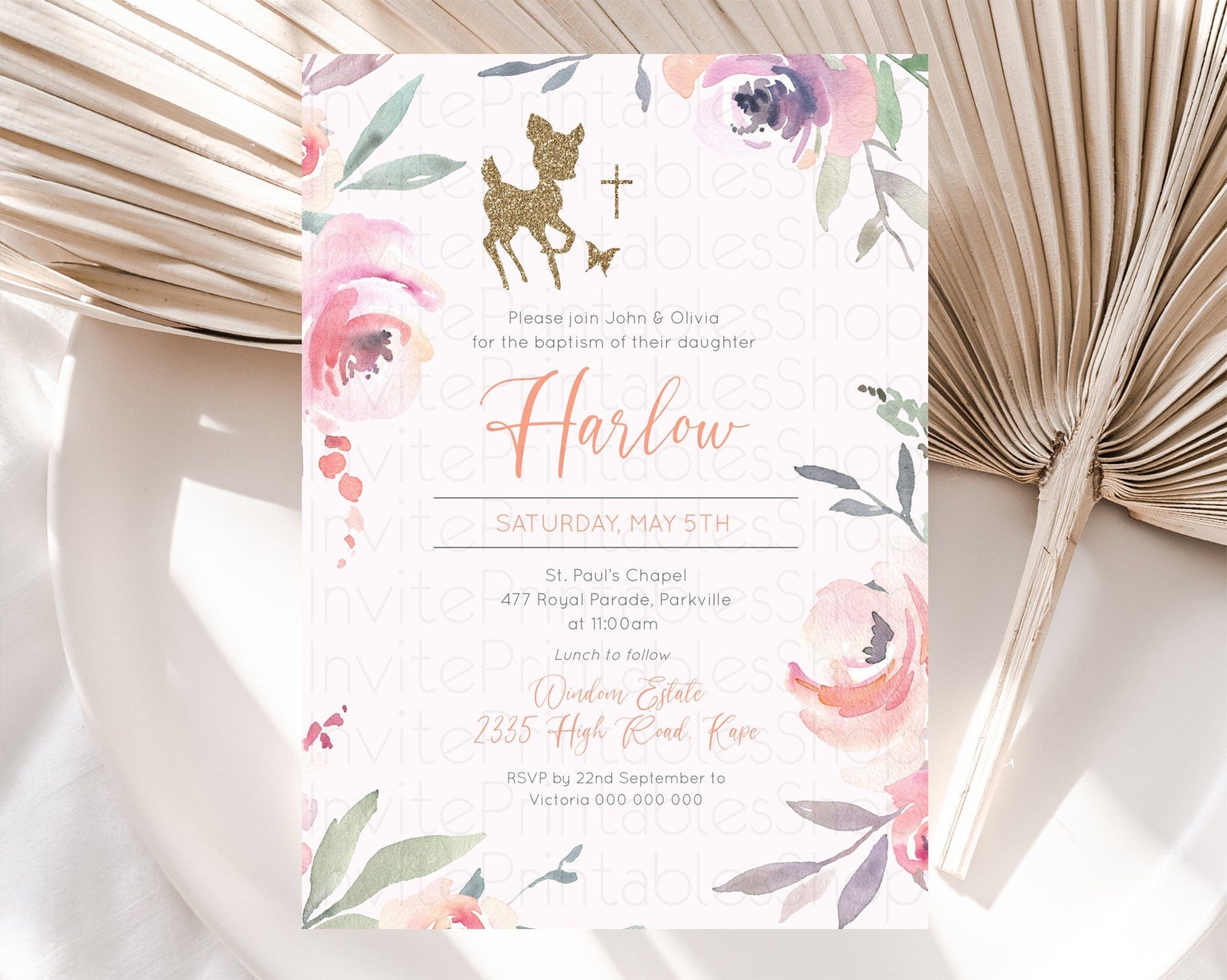 Fawn Baptism Invitation Deer Baptism 1st Birthday Invitation Enchanted Forest Christening Invitation Pastel Garden Butterfly Floral D10196