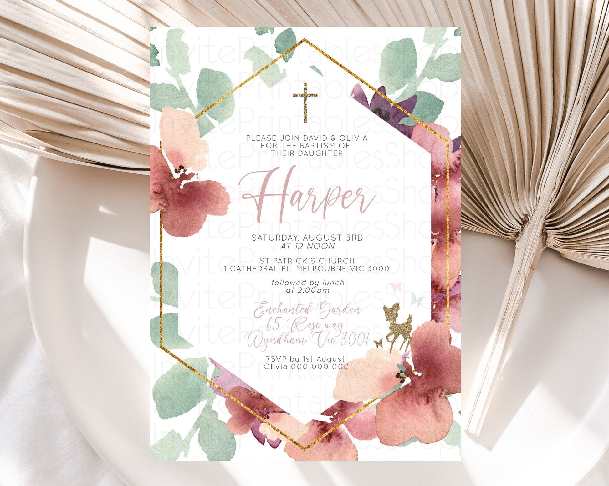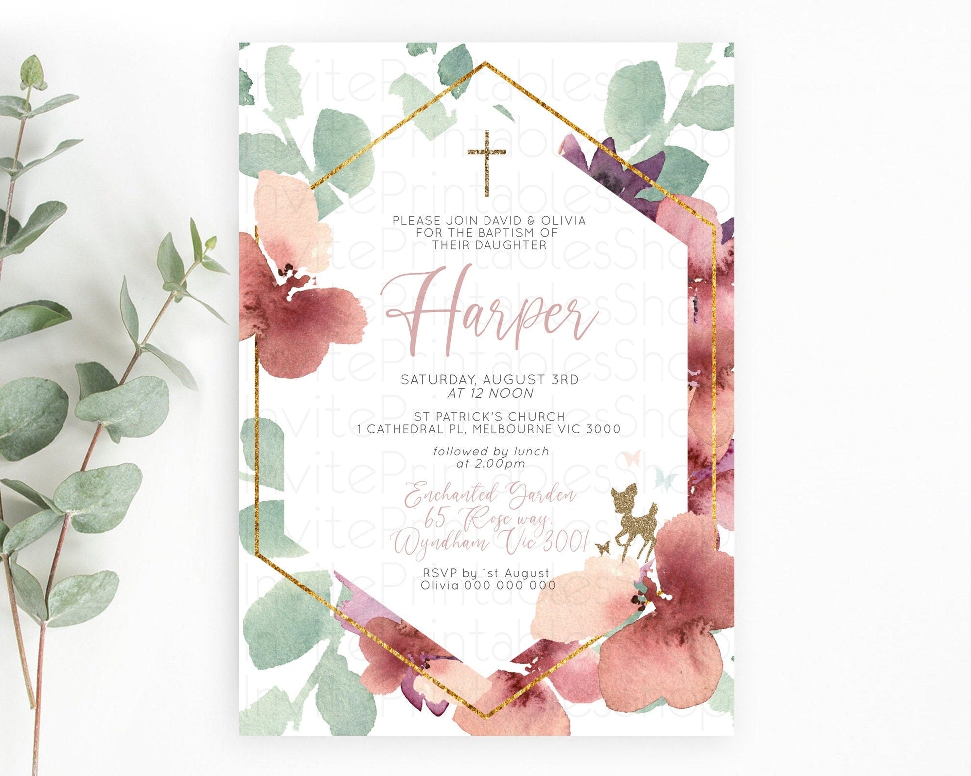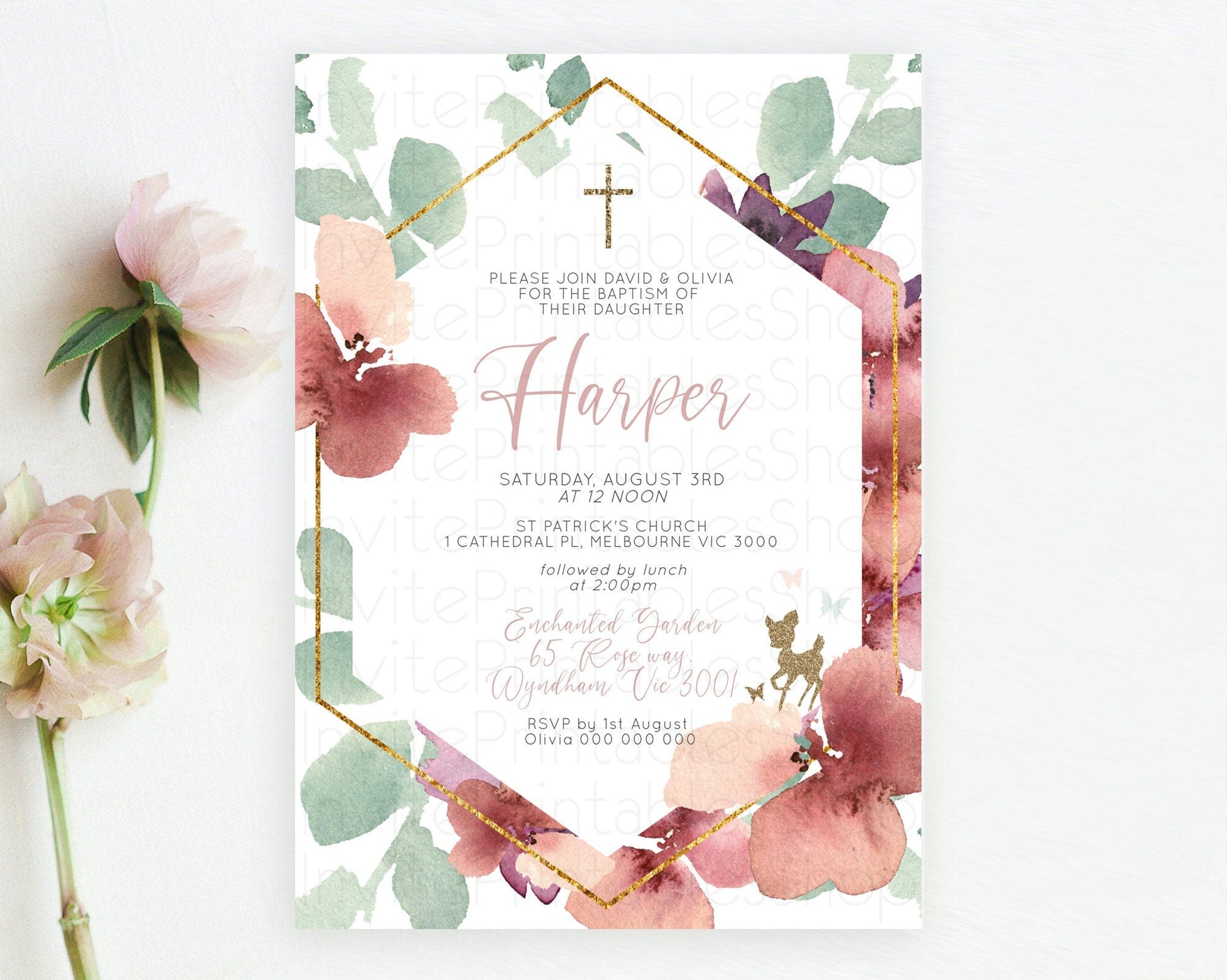 Fawn Baptism Invitation Deer Baptism 1st Birthday Invitation Enchanted Forest Christening Invitation Pastel Garden Butterfly Floral D10459