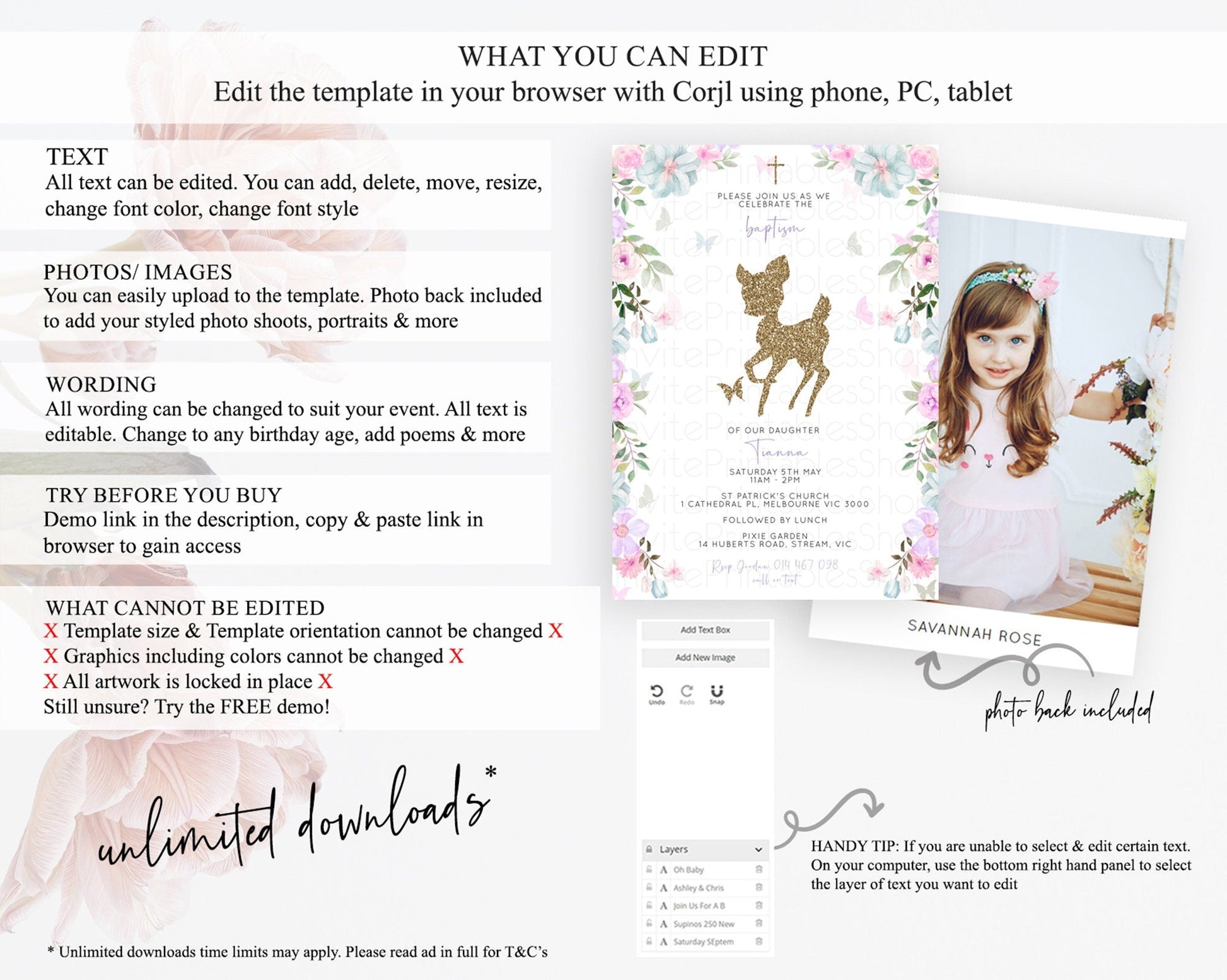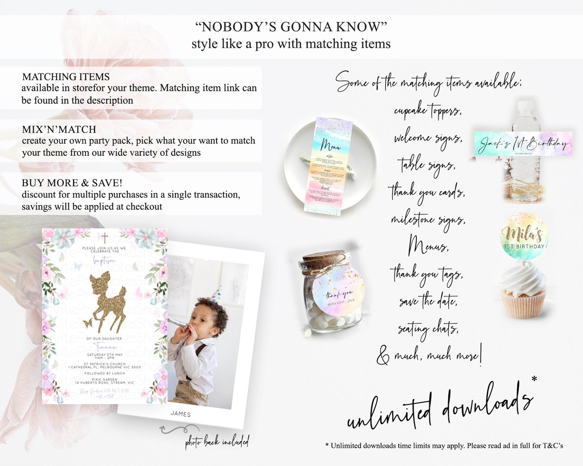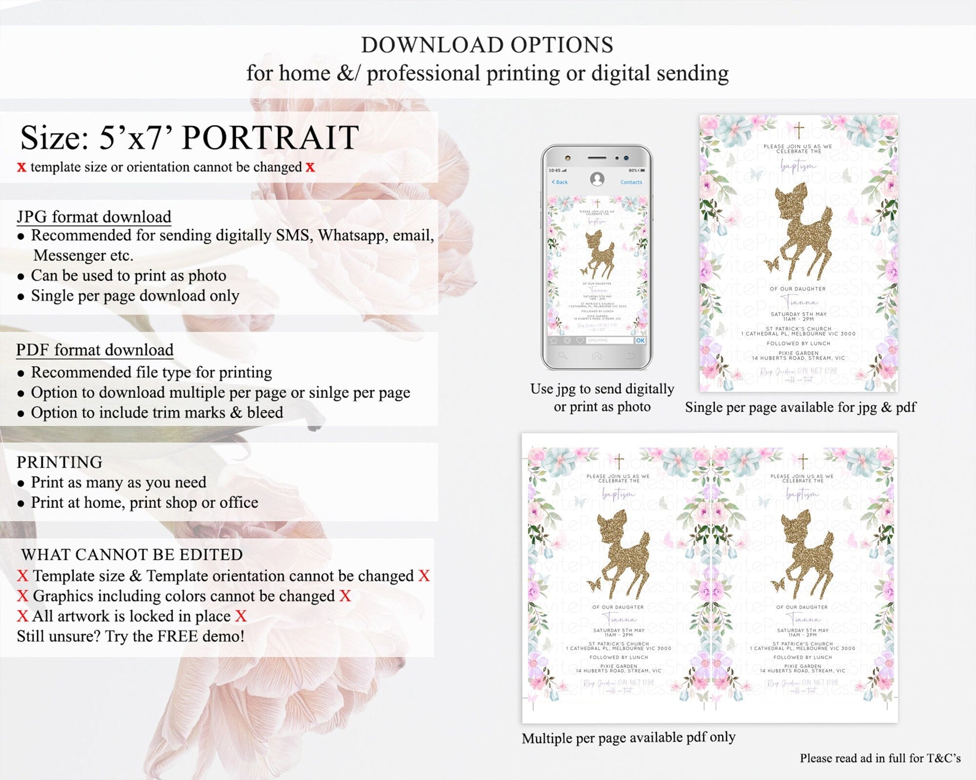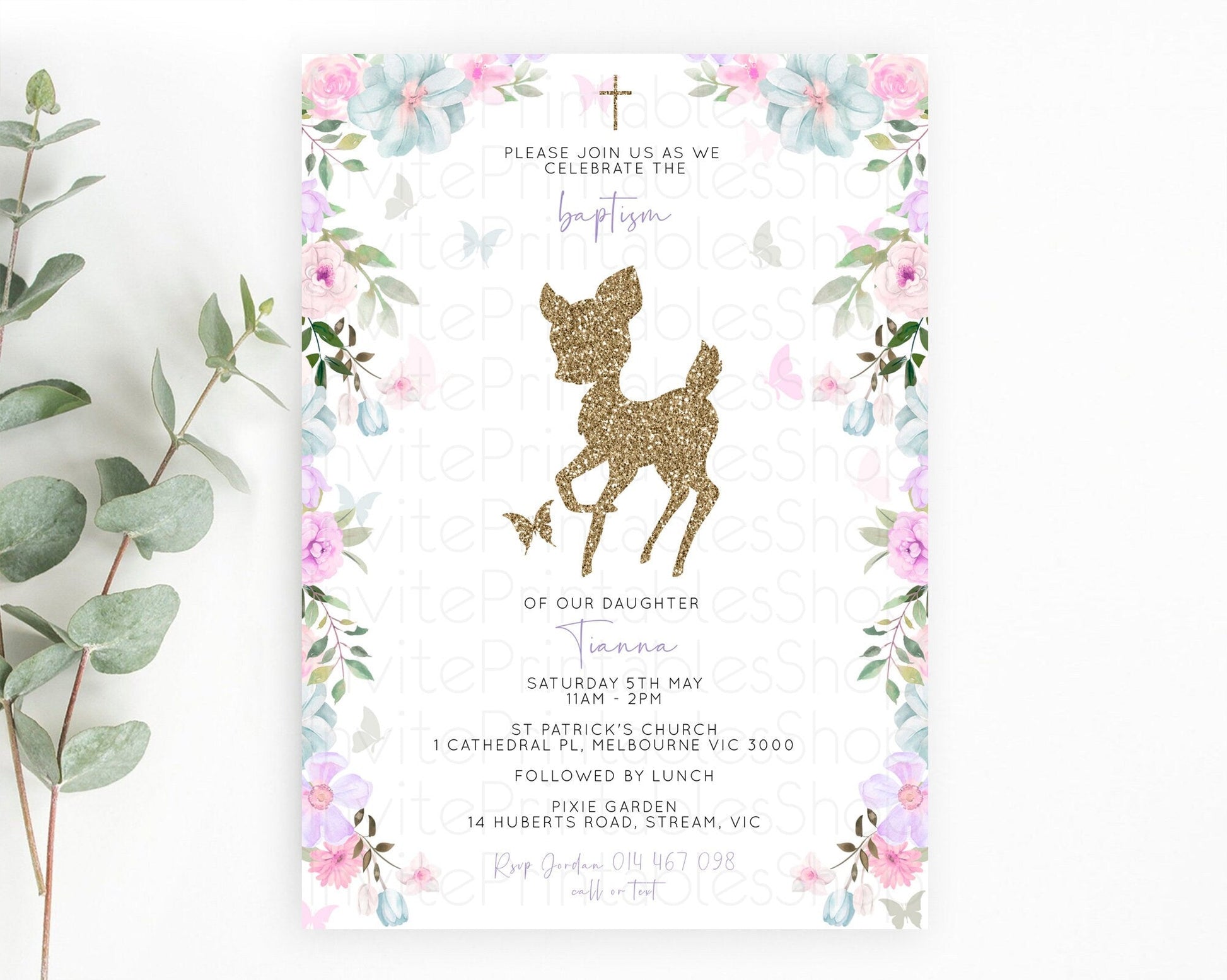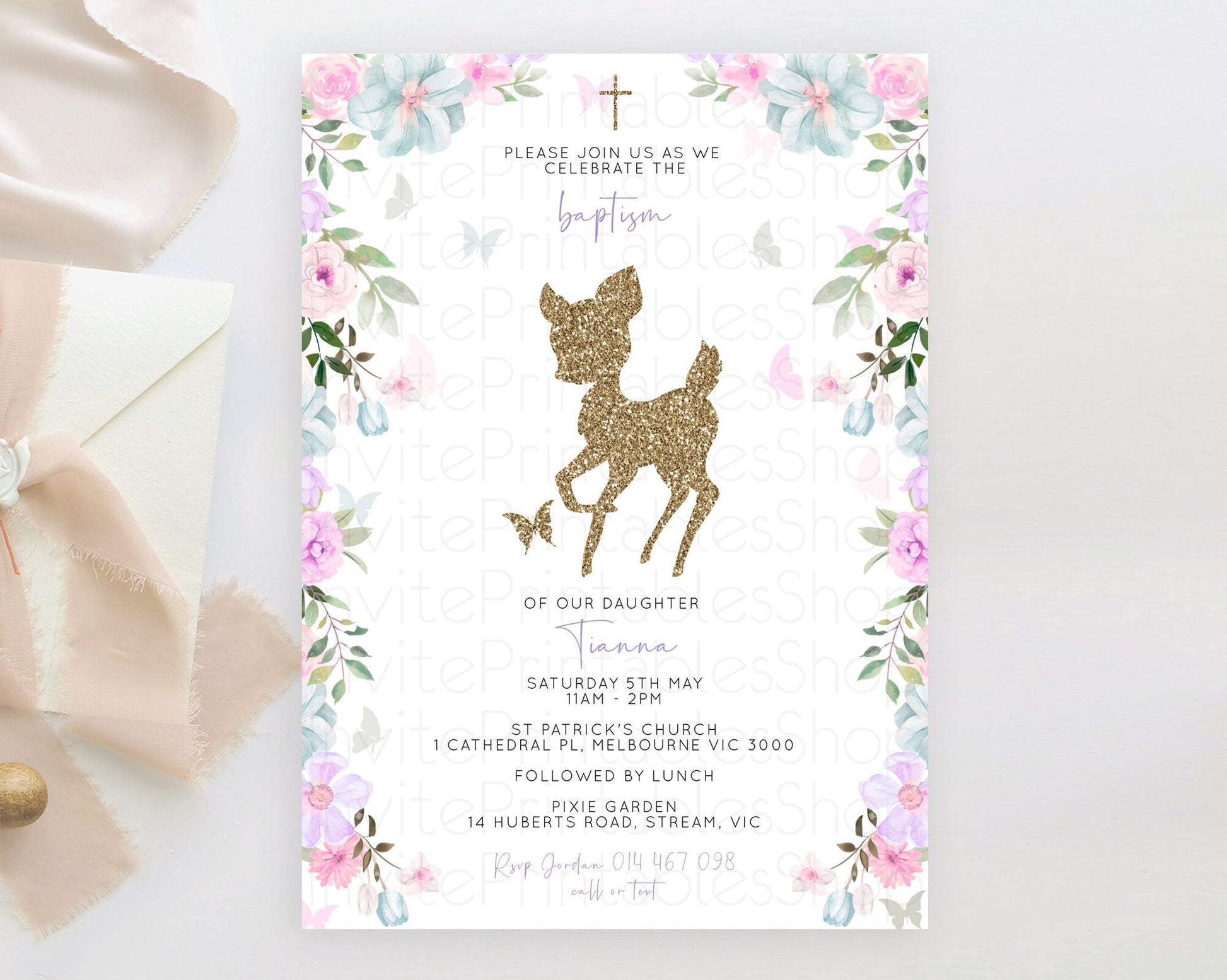 Fawn Baptism Invitation Deer Baptism 1st Birthday Invitation Enchanted Forest Christening Invitation Pastel Garden Butterfly Floral D10476
