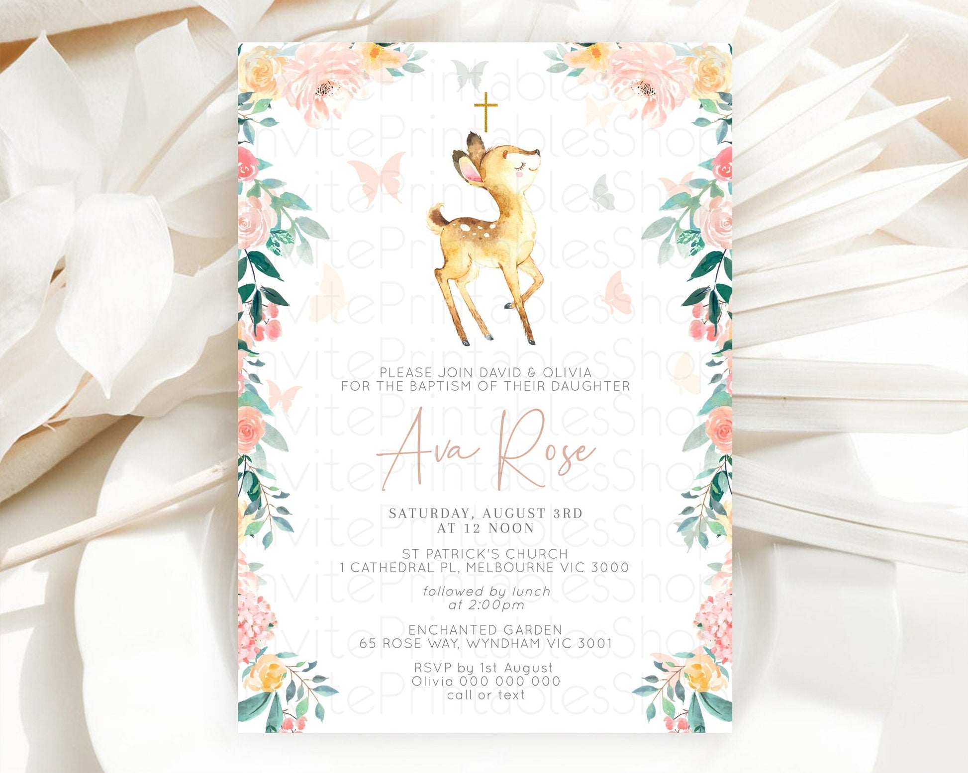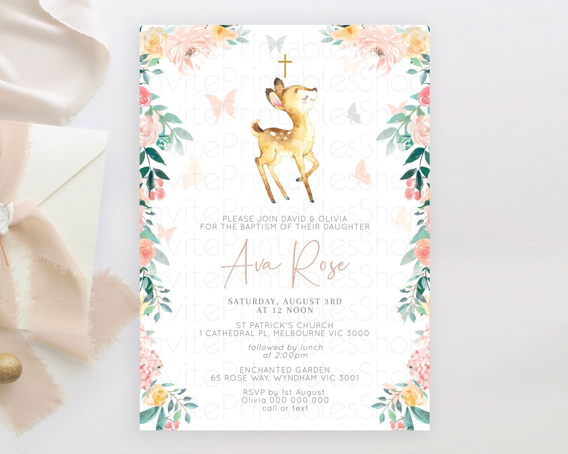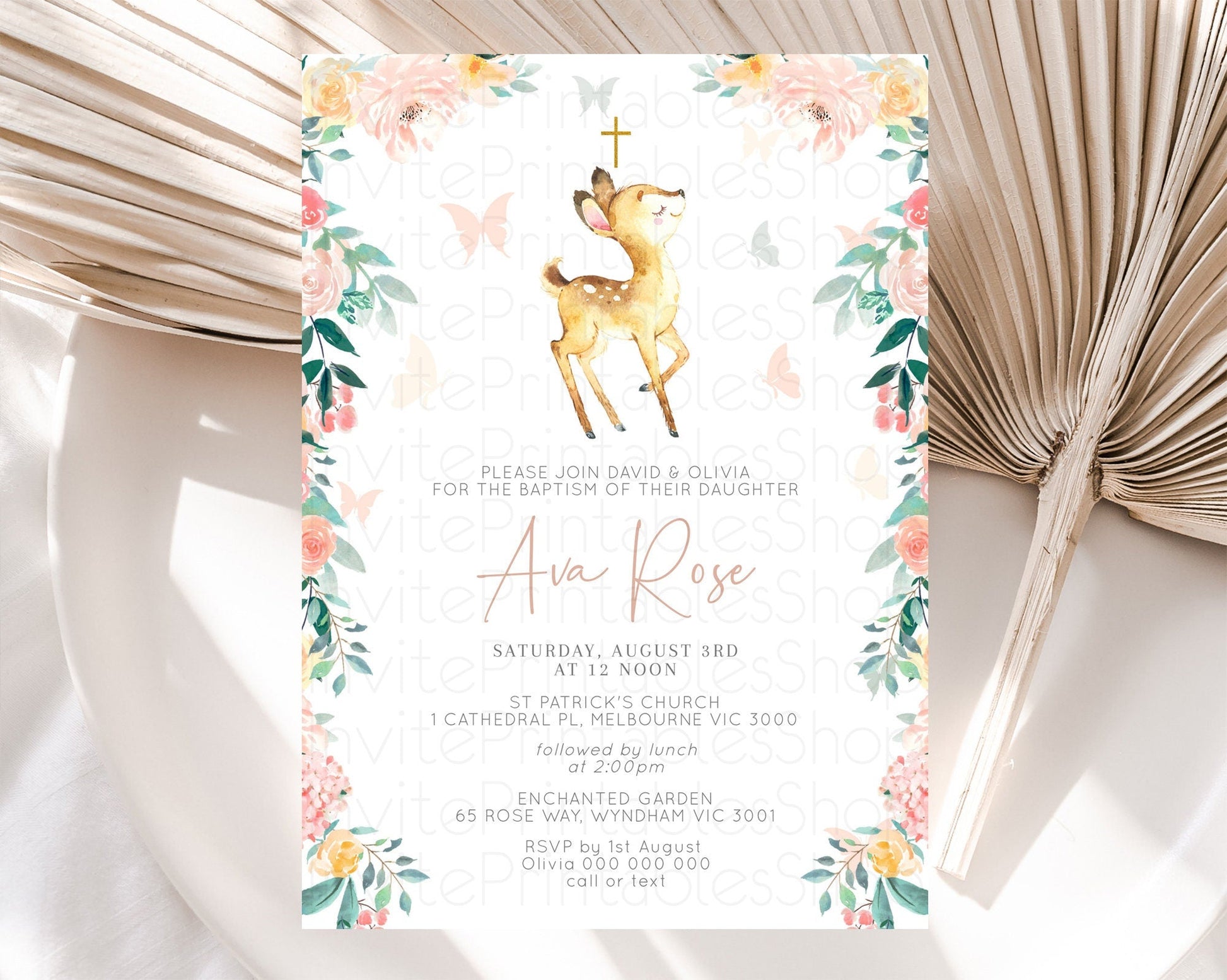 Fawn Baptism Invitation Deer Baptism 1st Birthday Invitation Enchanted Forest Christening Invitation Pastel Garden Butterfly Floral D10753