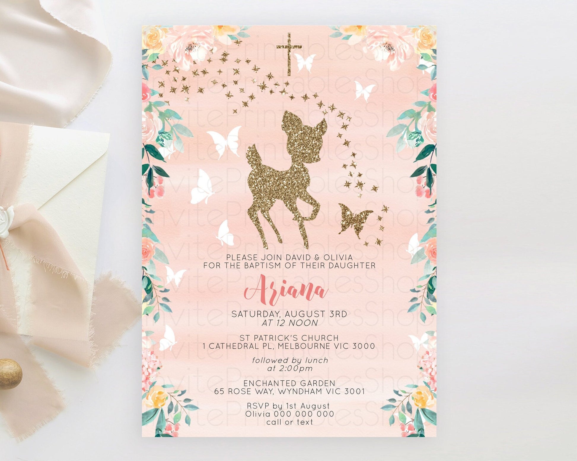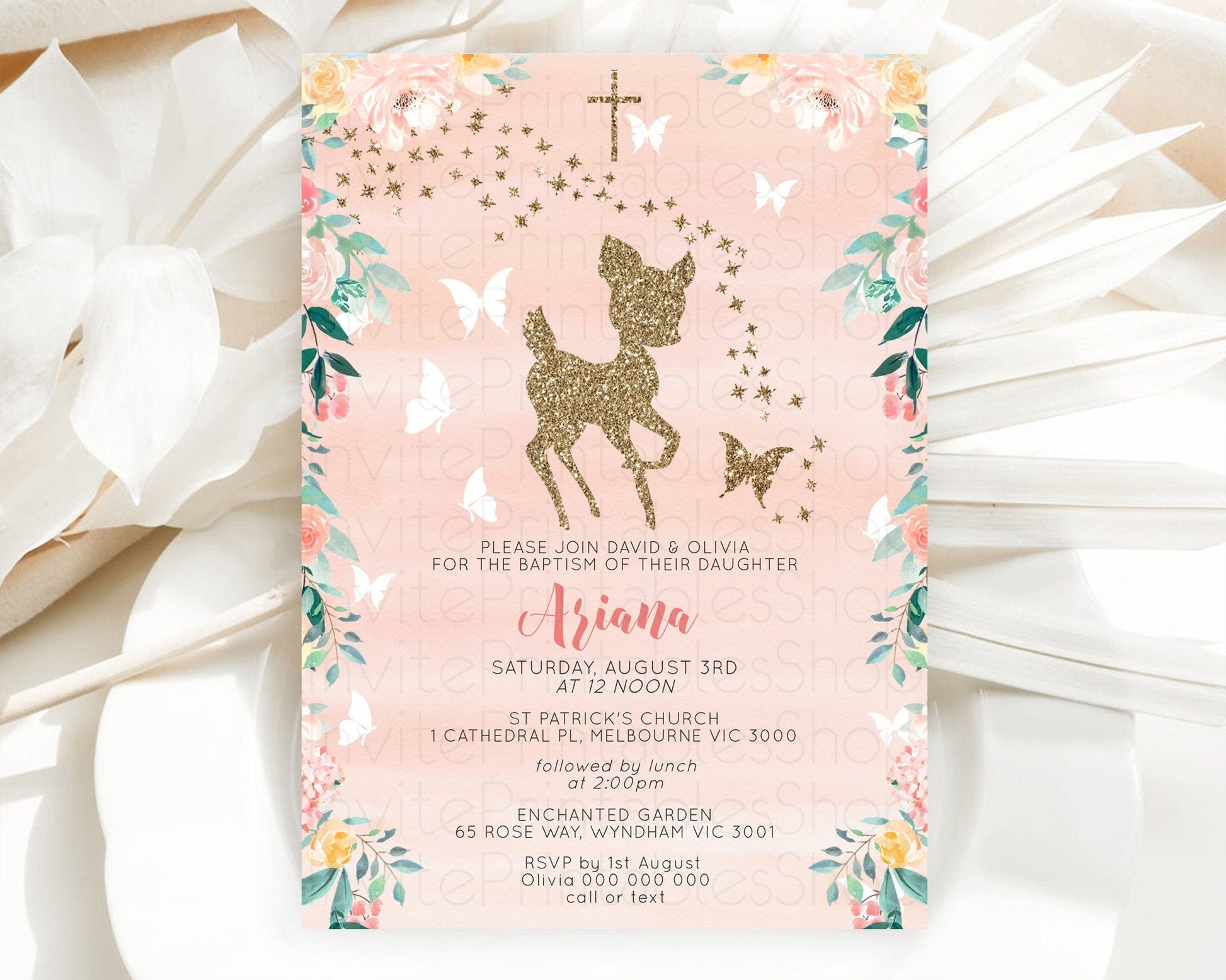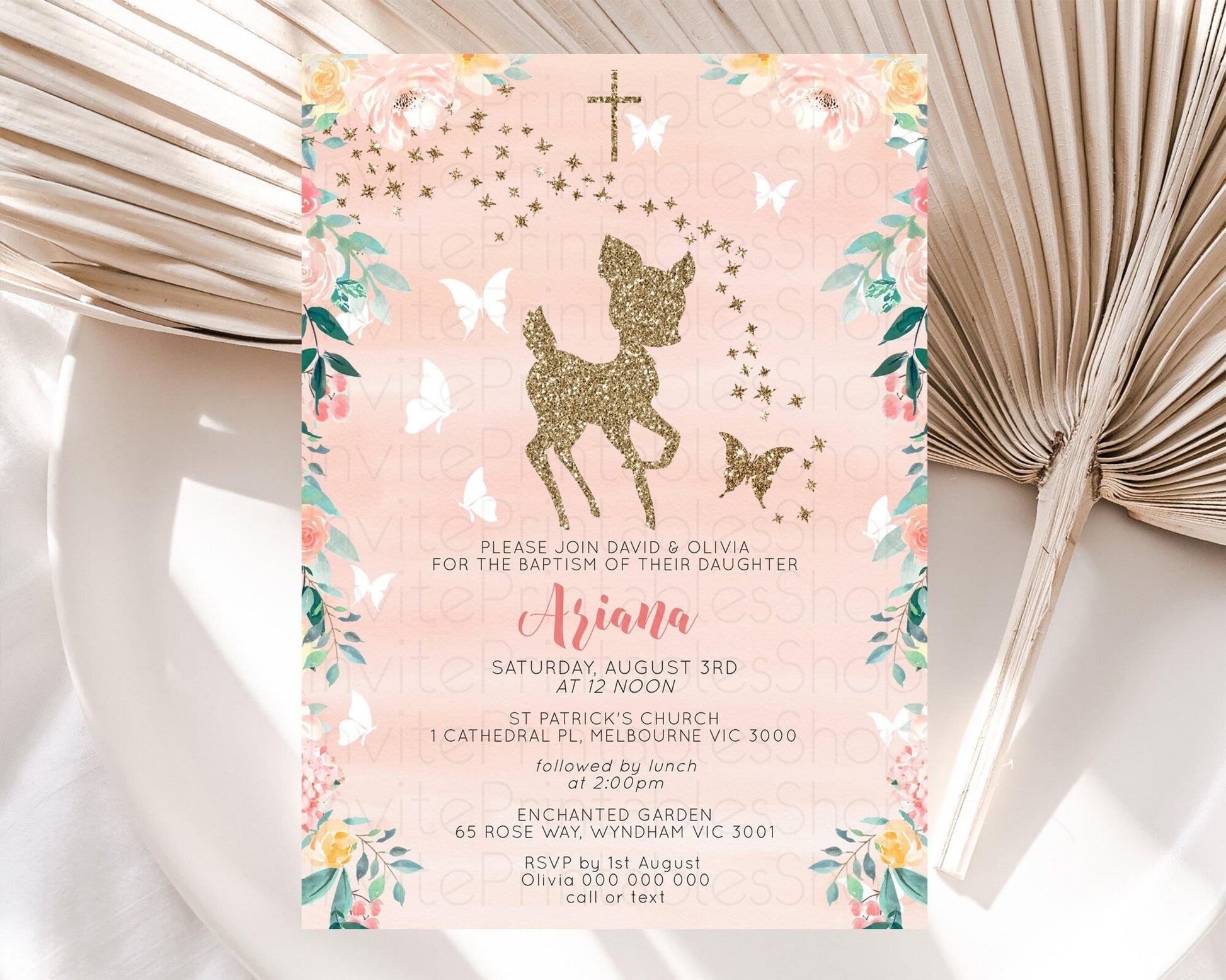 Fawn Baptism Invitation Deer Baptism 1st Birthday Invitation Enchanted Forest Christening Invitation Pastel Garden Butterfly Floral D10873