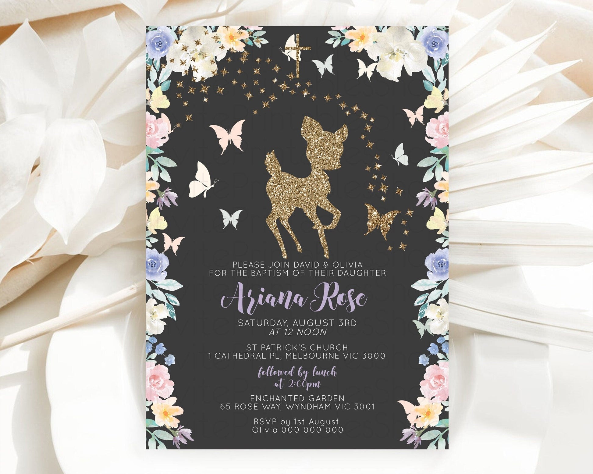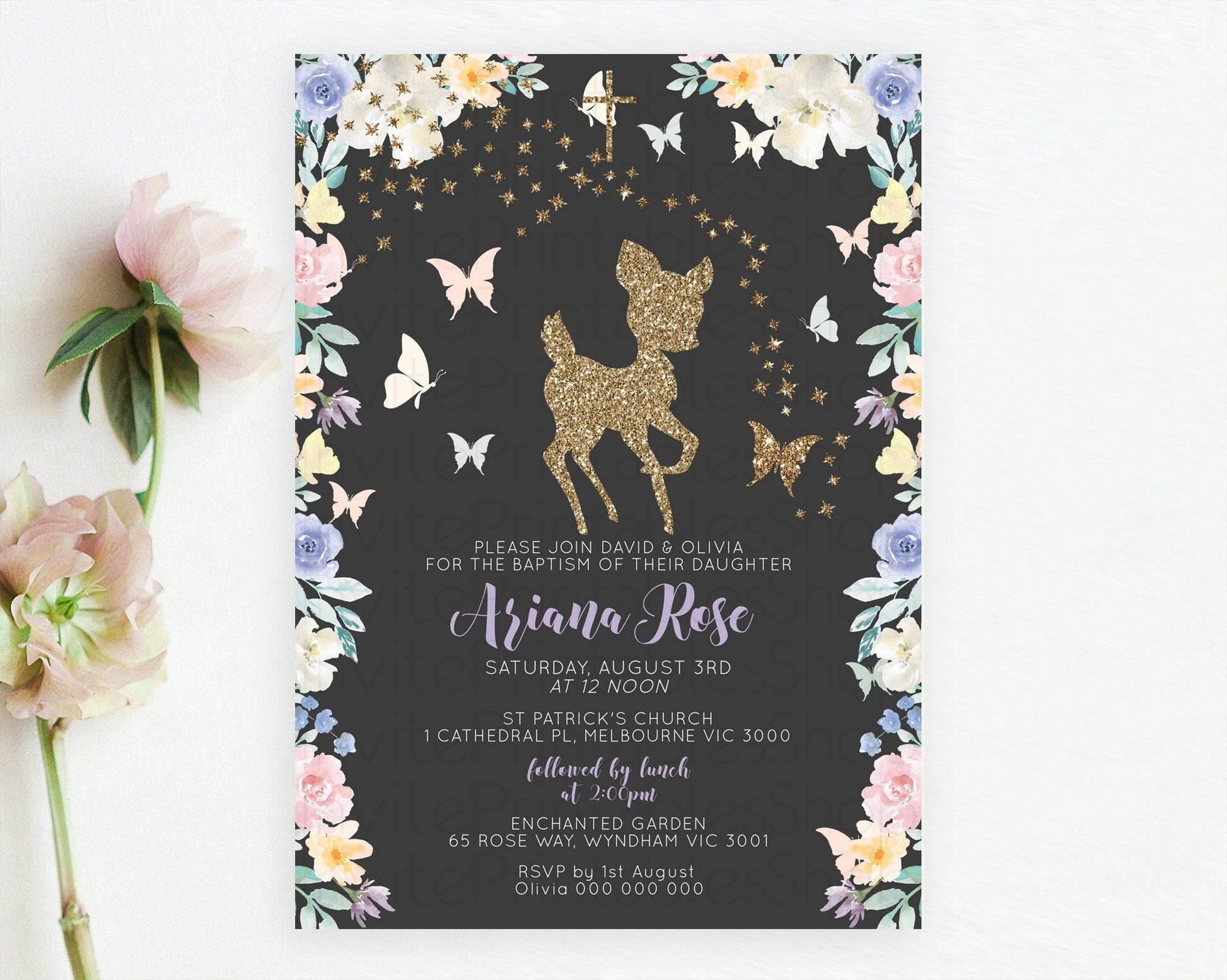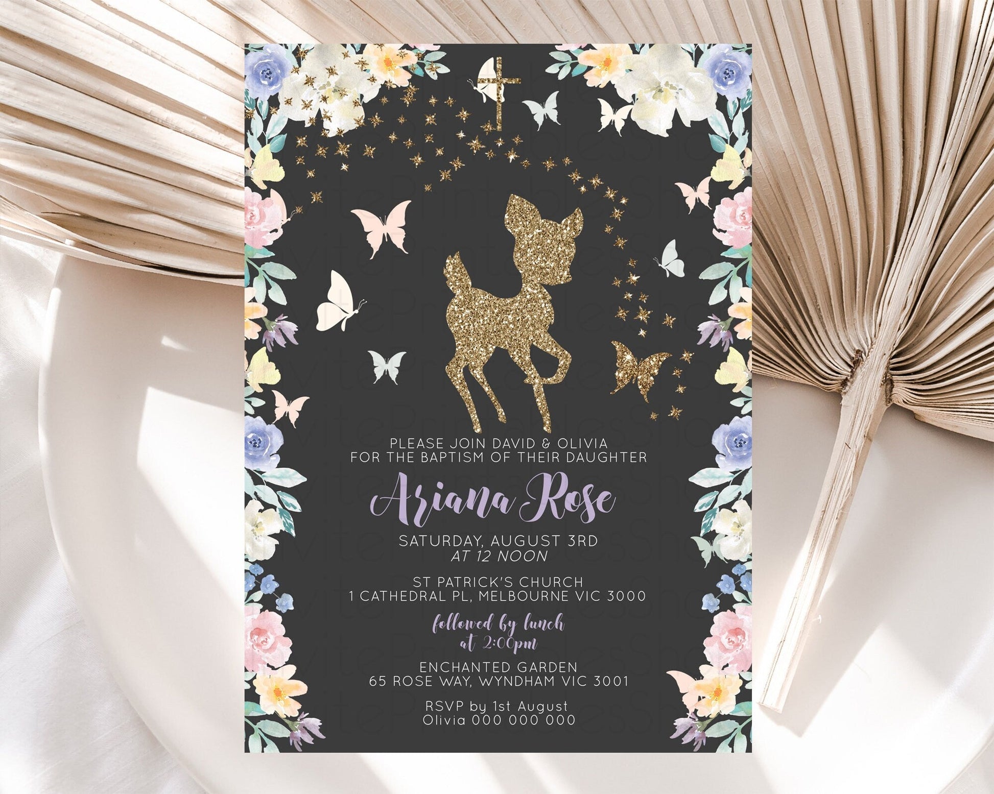 Fawn Baptism Invitation Deer Baptism 1st Birthday Invitation Enchanted Forest Christening Invitation Pastel Garden Butterfly Floral D10880