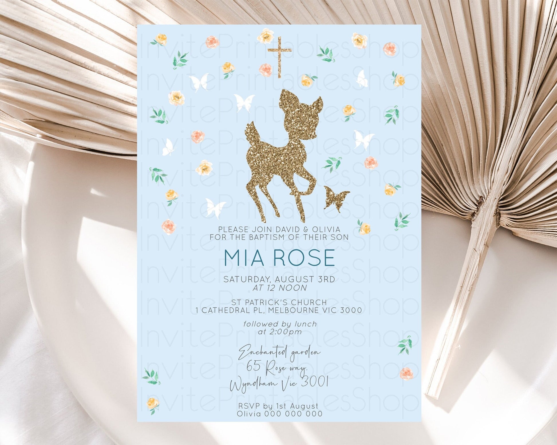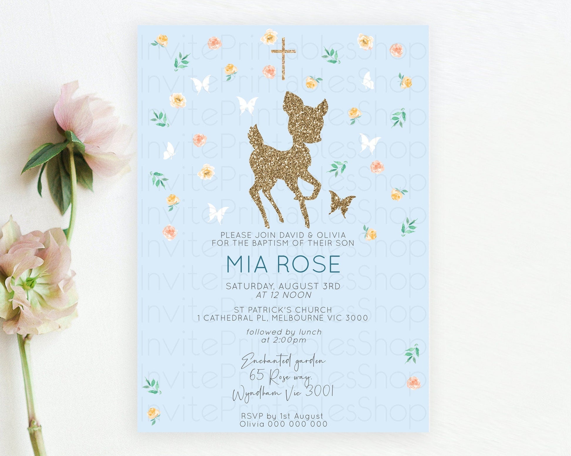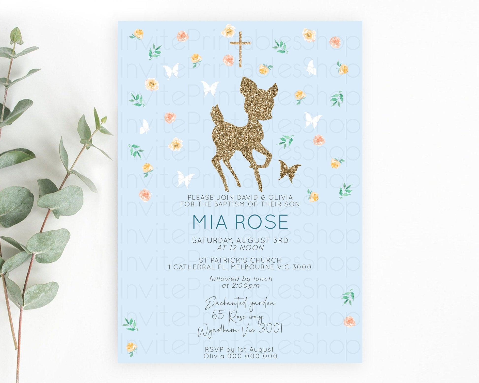 Fawn Baptism Invitation Deer Baptism 1st Birthday Invitation Enchanted Forest Christening Invitation Pastel Garden Butterfly Floral D10902