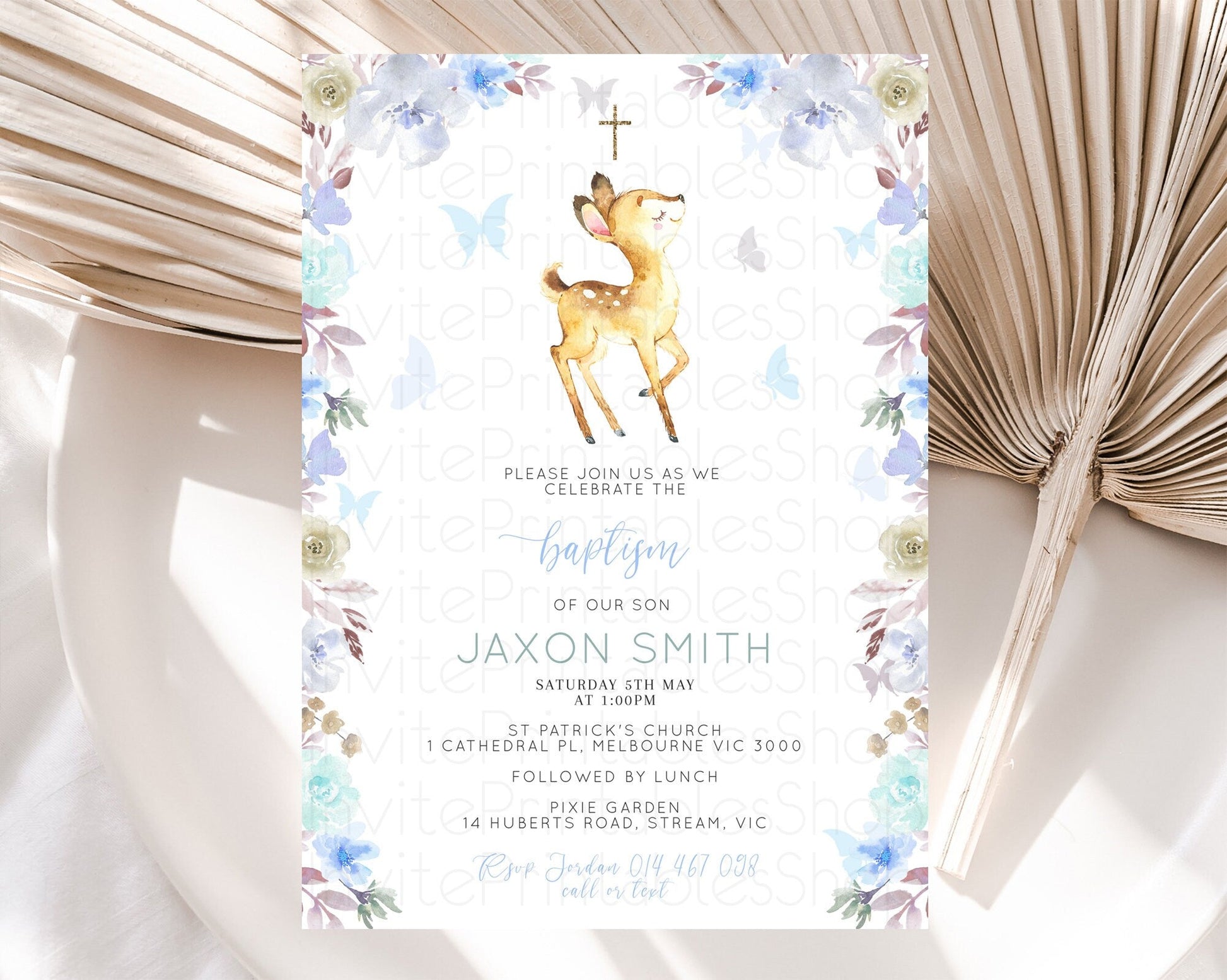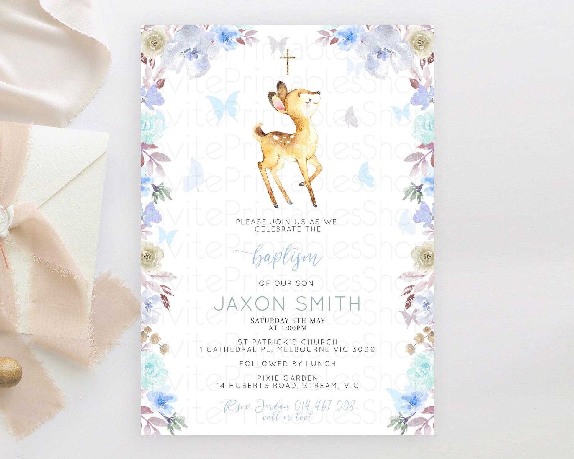Fawn Baptism Invitation Deer Baptism 1st Birthday Invitation Enchanted Forest Christening Invitation Pastel Garden Butterfly Floral D10960