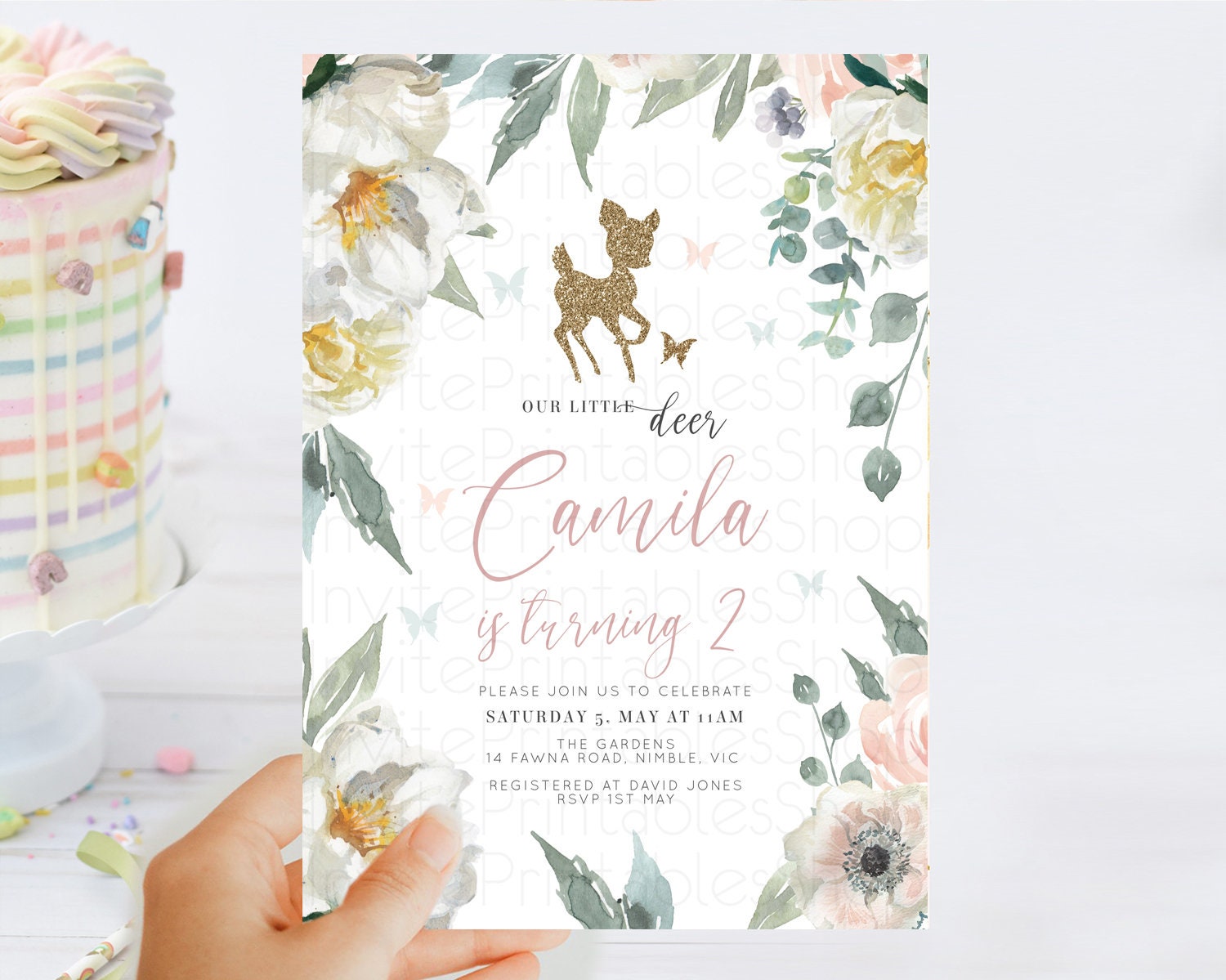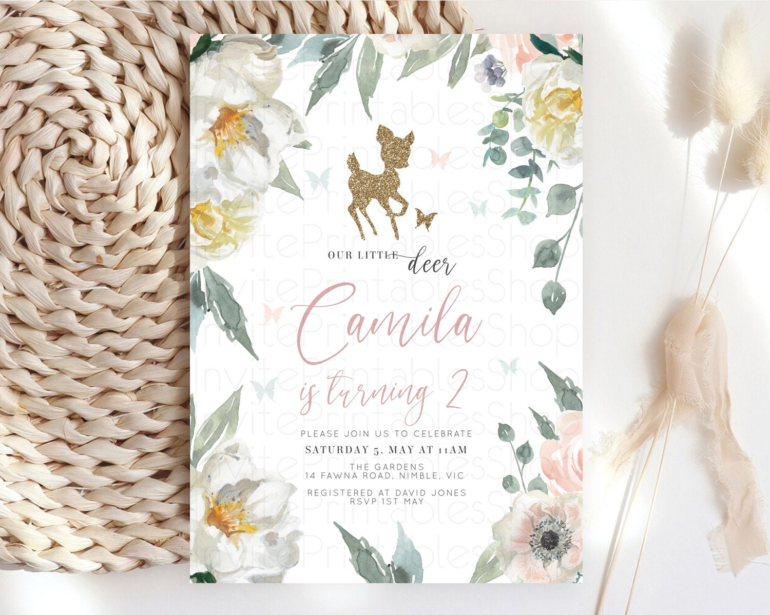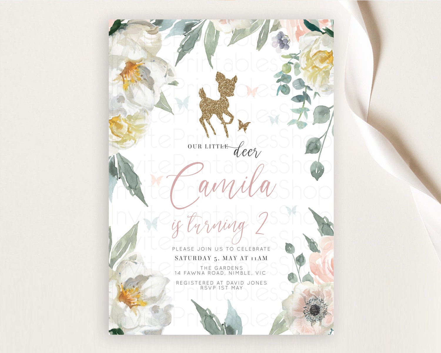 Fawn Birthday Invitation Deer Birthday Invitation Enchanted Forest Party Butterfly Pastel Flowers Whimsical 2nd 1st First Birthday D10120