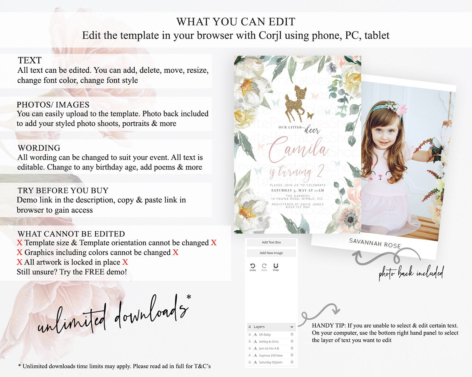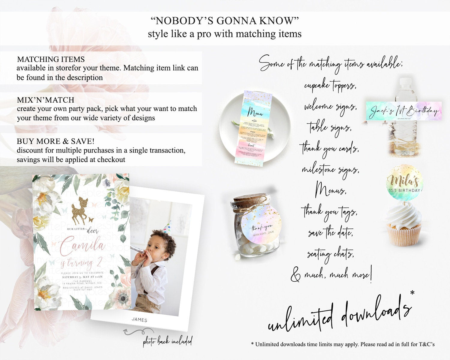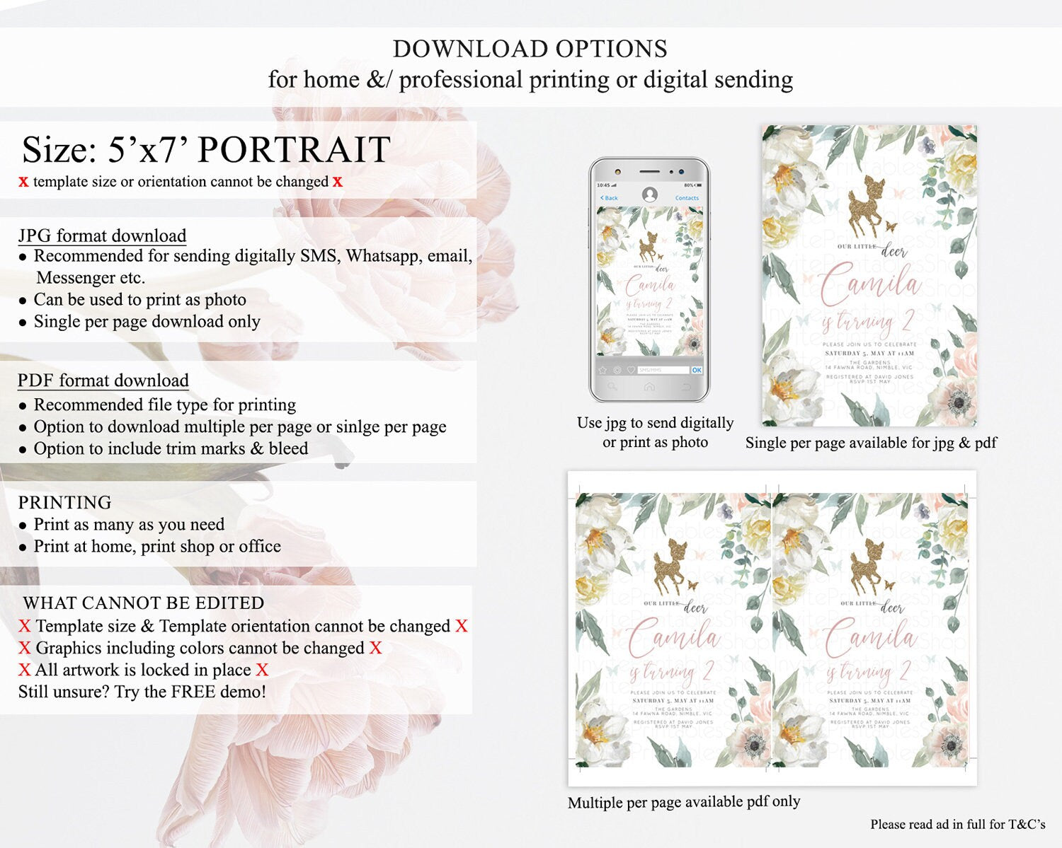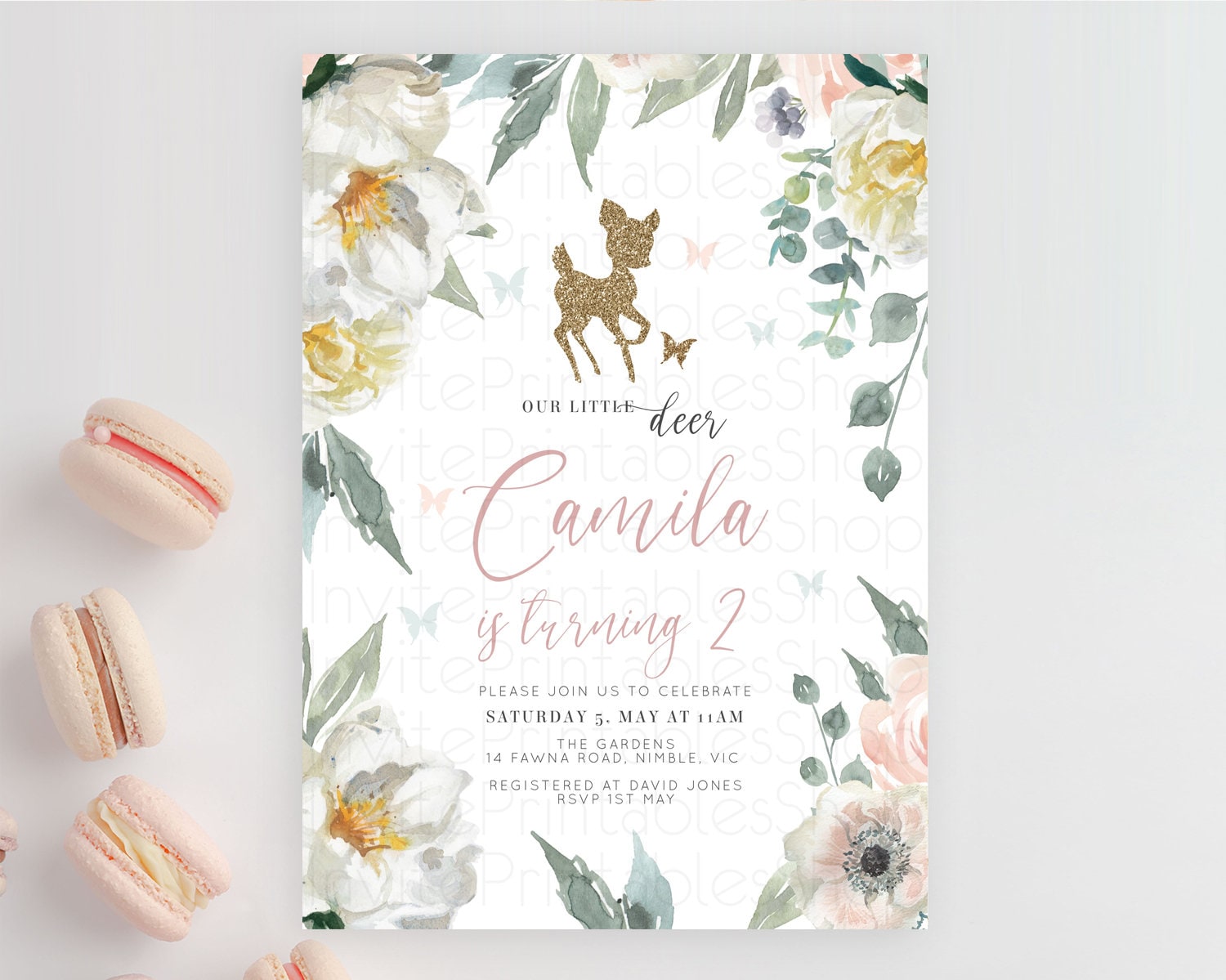 Fawn Birthday Invitation Deer Birthday Invitation Enchanted Forest Party Butterfly Pastel Flowers Whimsical 2nd 1st First Birthday D10120